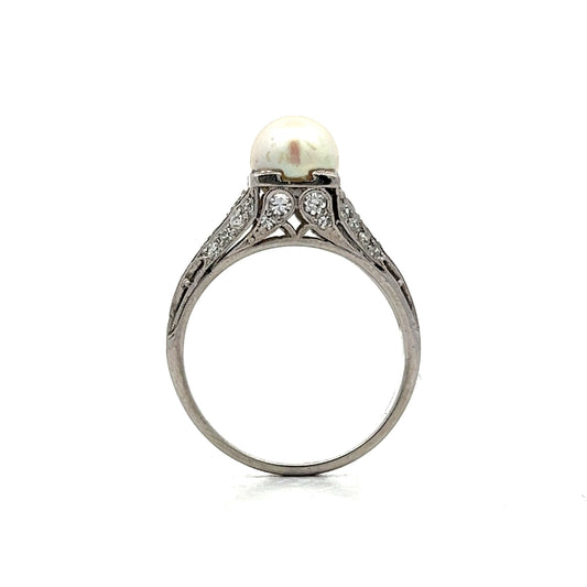 Deco Filigree Pearl & Diamond Cocktail Ring in Platinum