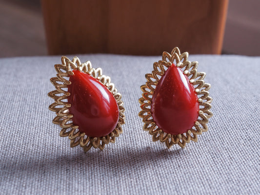 Vintage Cabochon Coral Mid Century Earrings in 18k