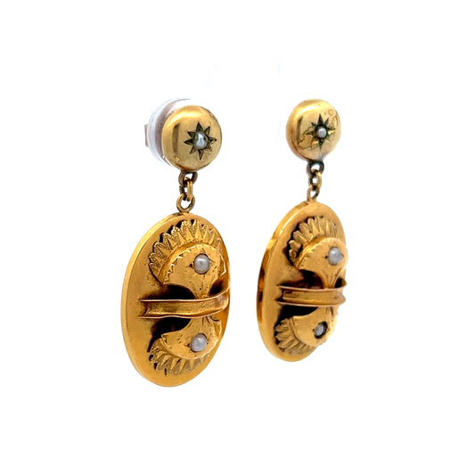 Victorian Pearl Amulet Shield Drop Earrings in 14K Yellow Gold