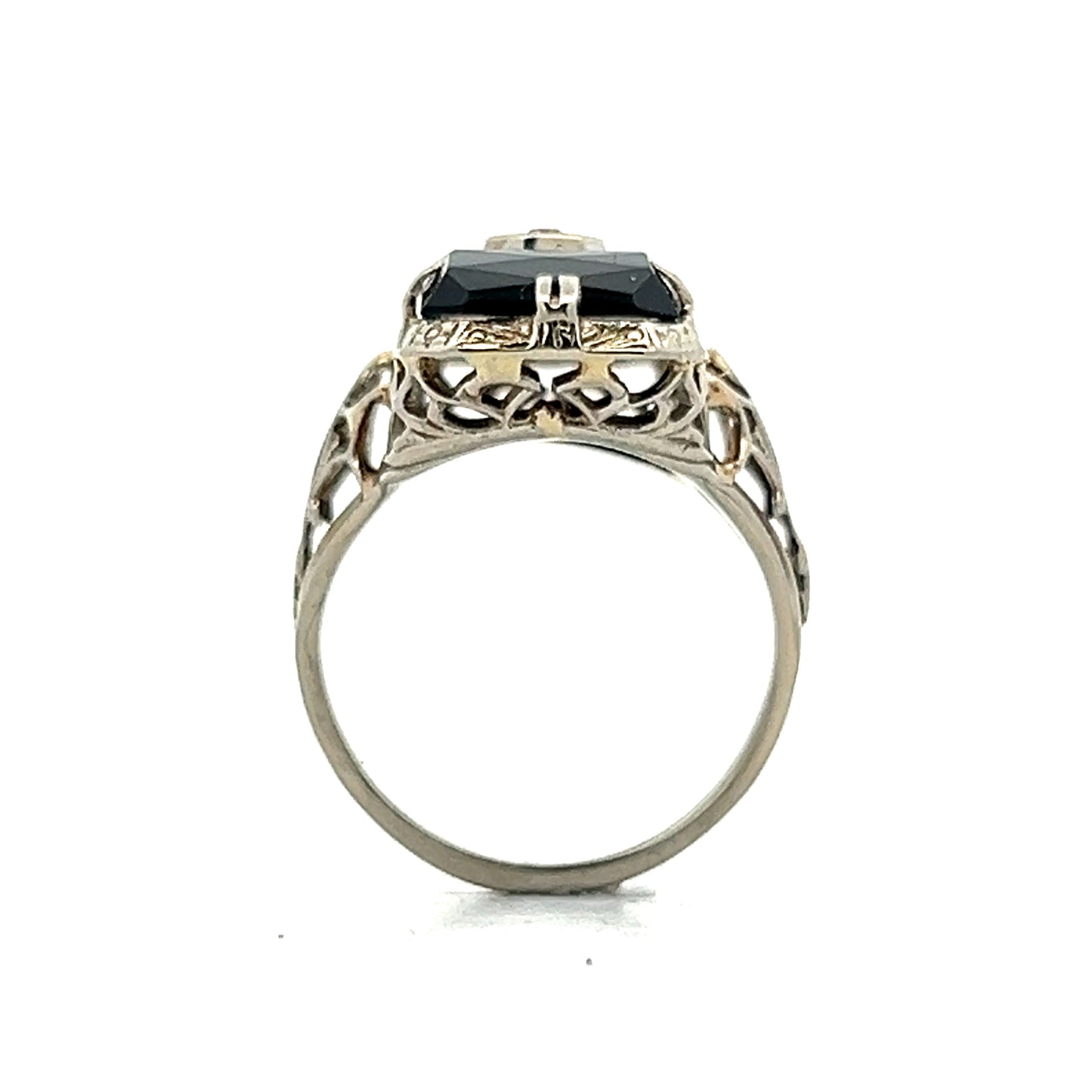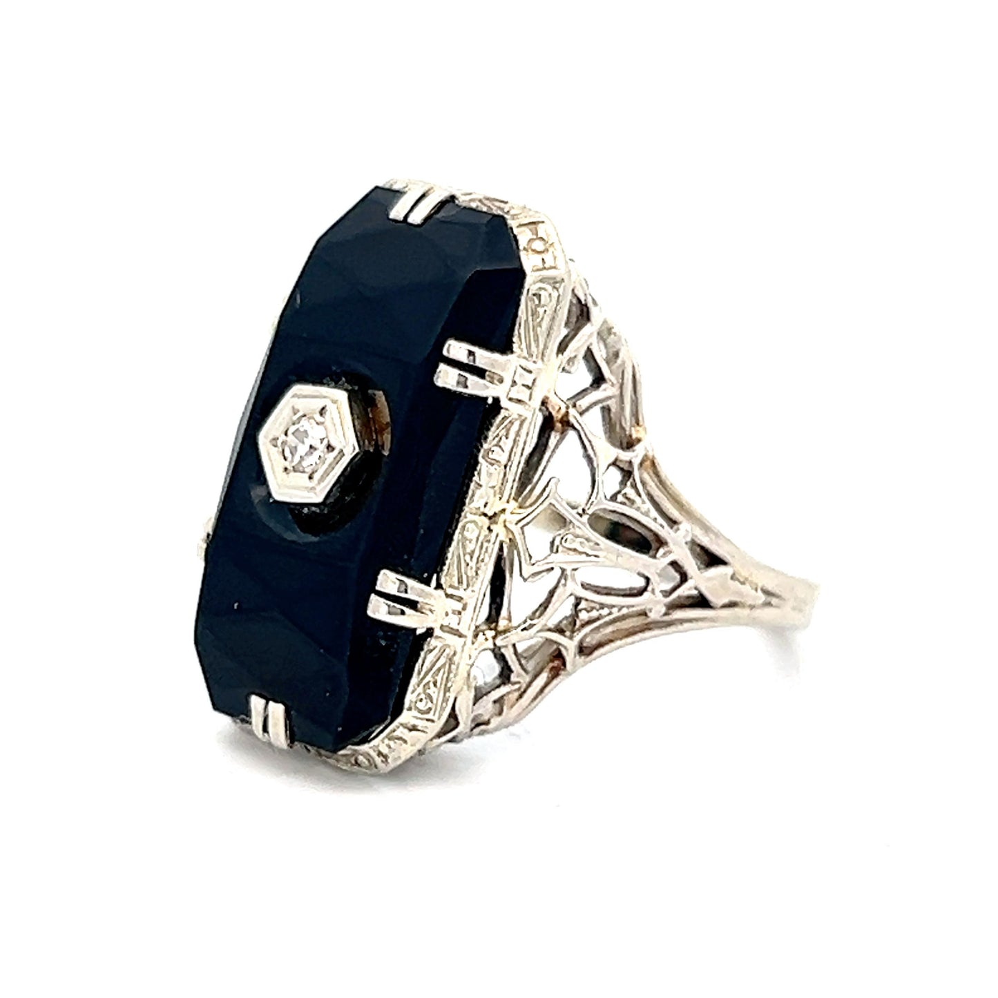 This antique Art Deco cocktail ring features a faceted rectangular black onyx, set in an intricate filigree 18 karat white gold mounting. A .025 carat single cut diamond is set into the onyx as the perfect complement creating a striking contrast that is sure to catch the eye. The decorative filigree mounting is expertly engraved with intricate patterns, adding to the overall elegance of this cocktail ring. The combination of the black onyx and white diamond creates a timeless and versatile piece that will elevate any outfit.