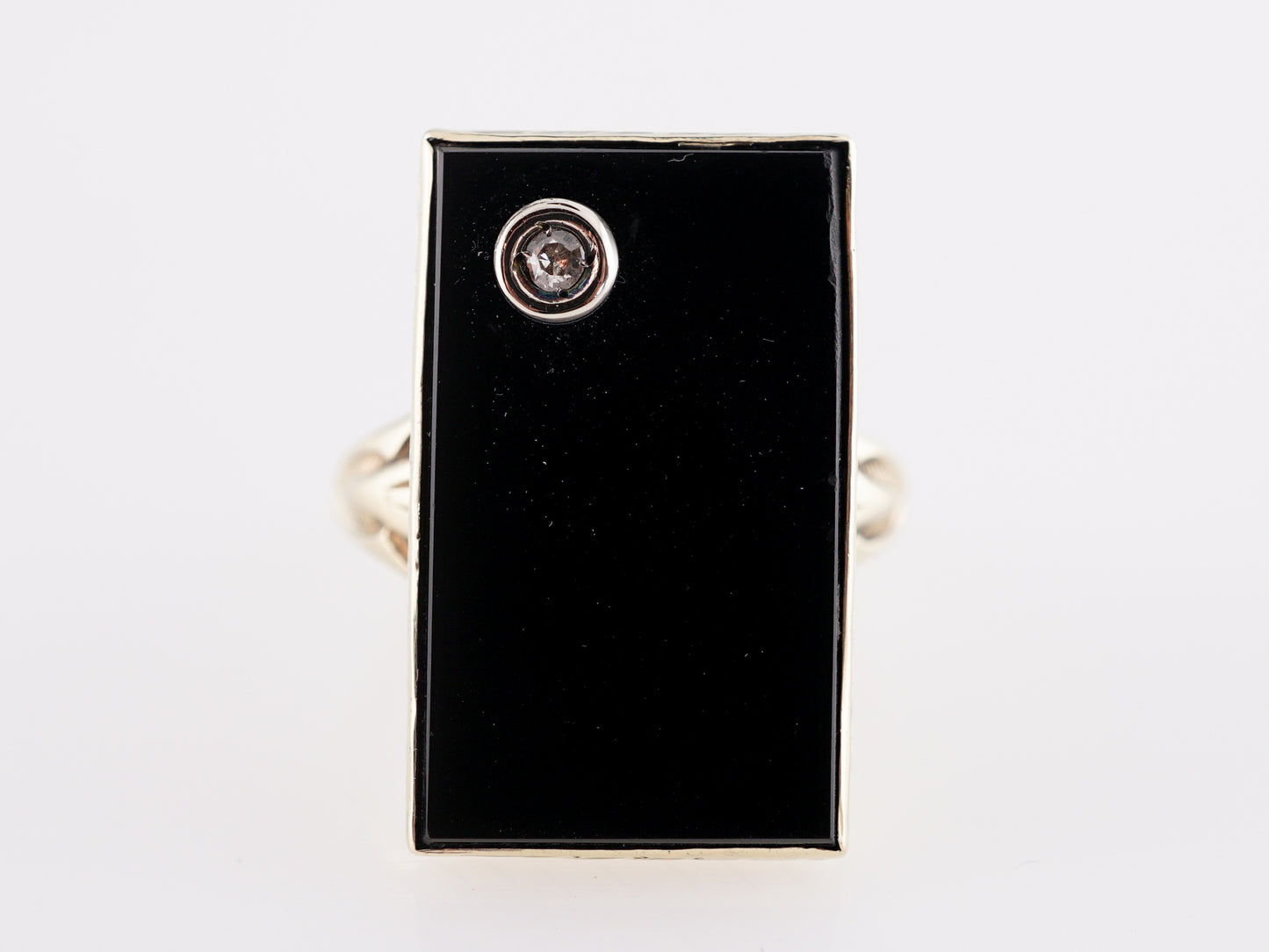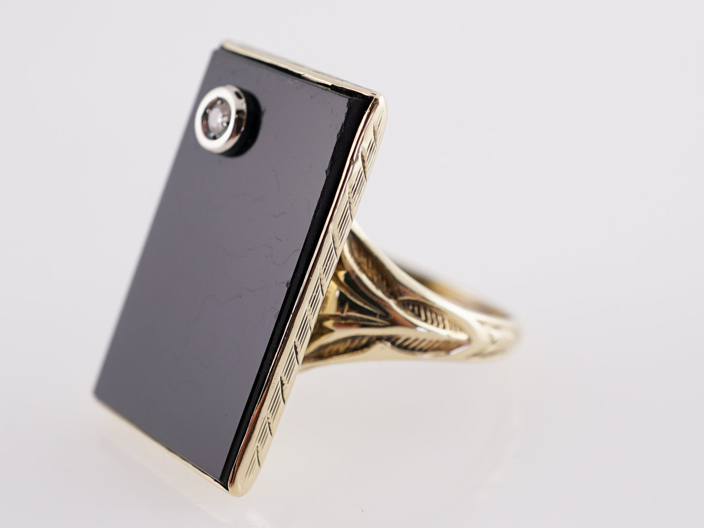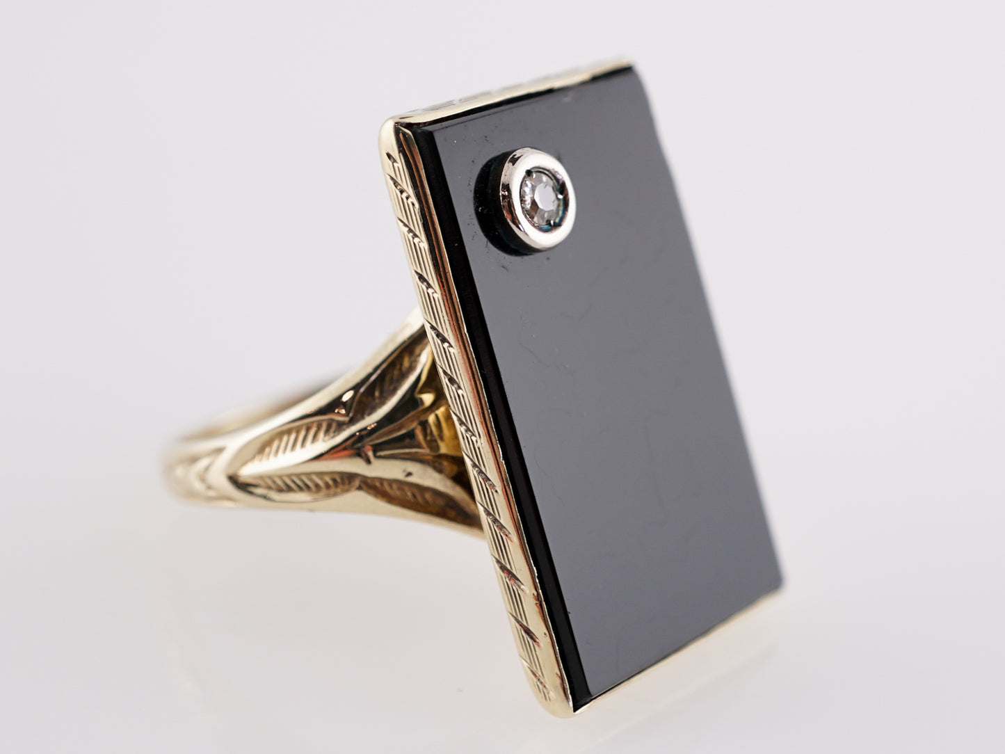 .03 Art Deco Onyx Diamond Ring in 14k Yellow Gold. This marvelous, monolithic Art Deco ring features a square onyx gemstone and a .03 carat natural diamond in 14k yellow gold. The petite diamond has a faint yellow hue that compliments the warm yellow gold band. The powerful, black onyx is mounted in a 14k setting that features iconic Art Deco geometric designs. This ring reaches 3.79 mm above the finger and weighs 4 grams.