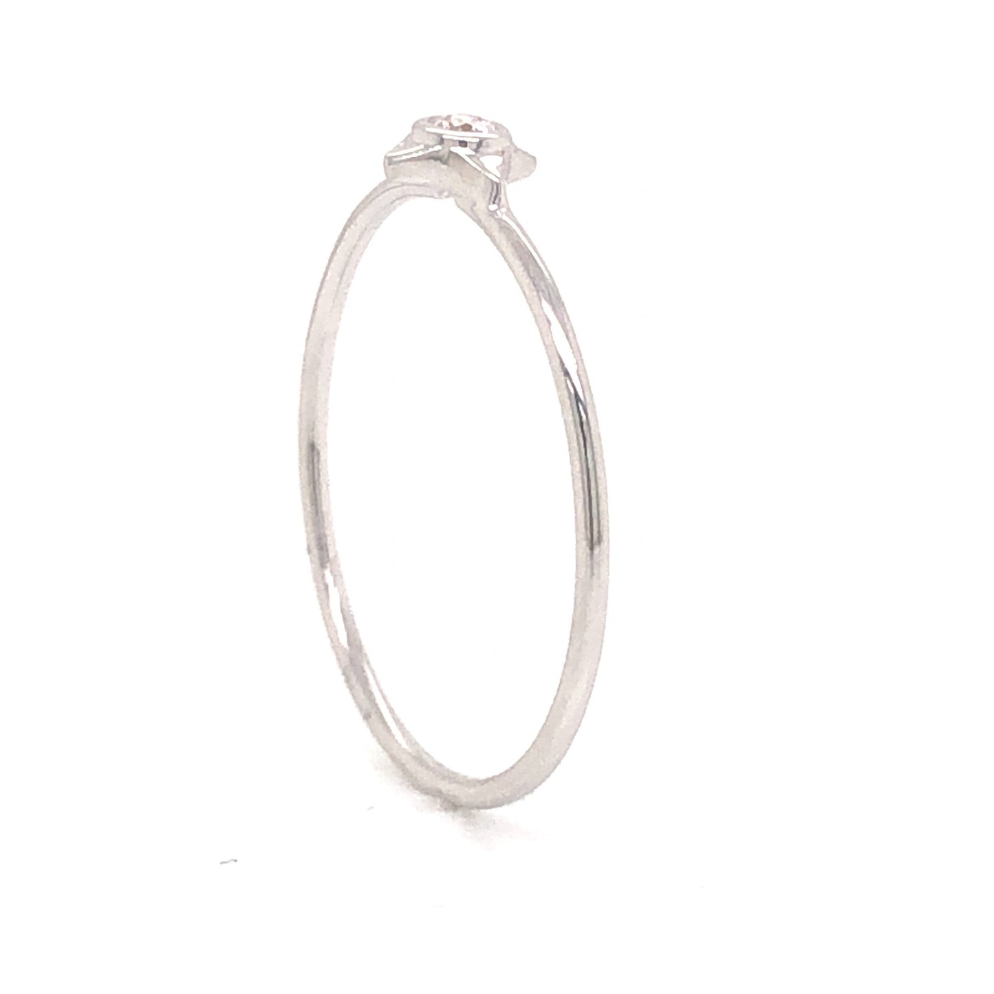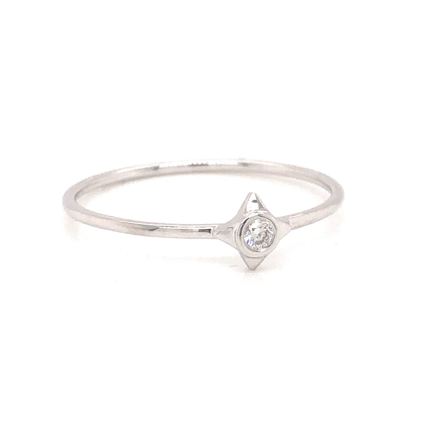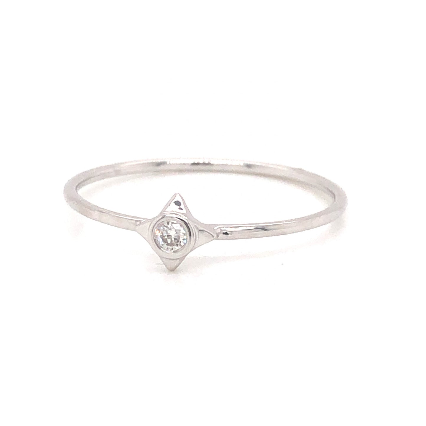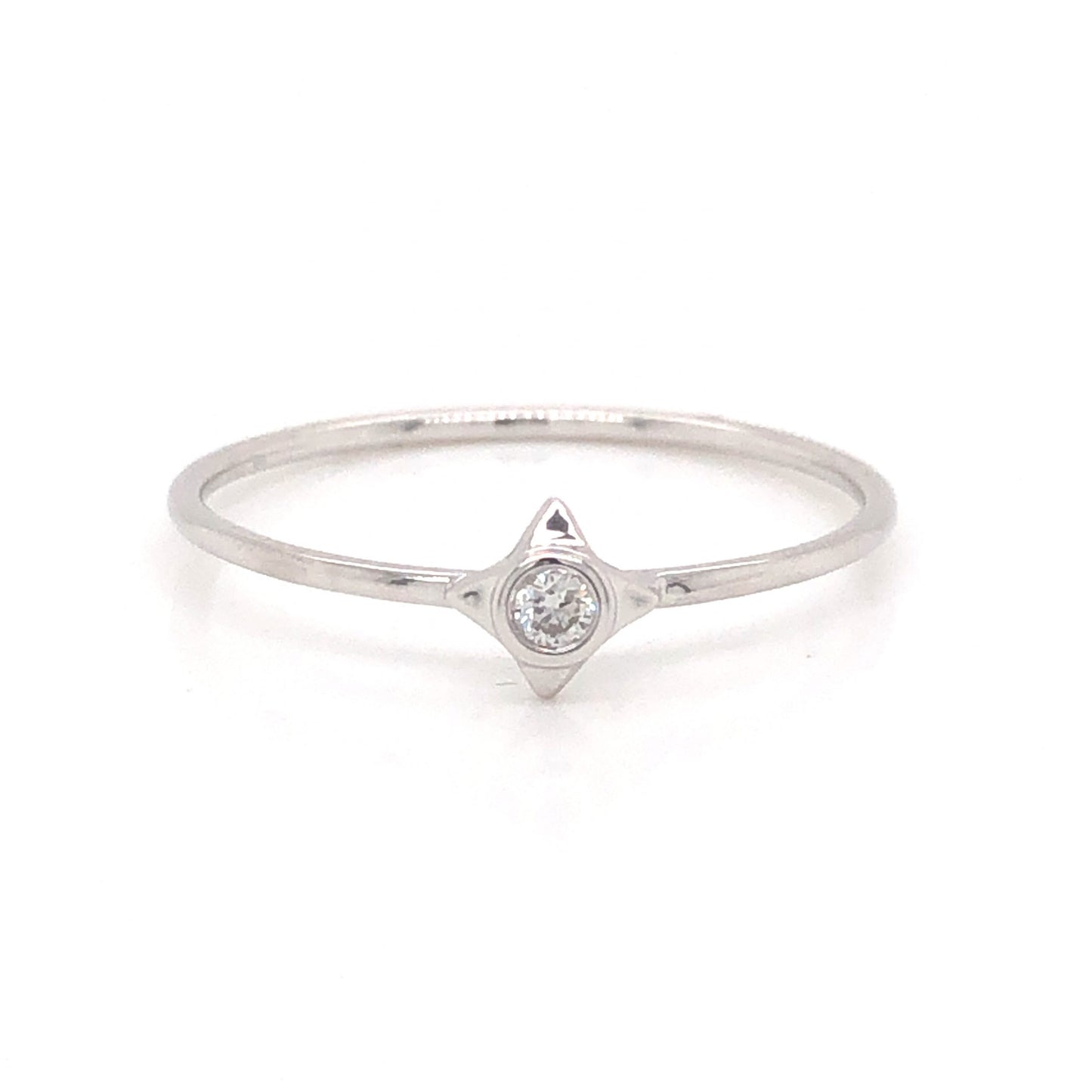 .03 Diamond Stacking Ring in 14k White Gold. This modern stacking ring features a .03 carat diamond in 14 karat white gold. The primary diamond is bezel set on a star-shaped mounting. The band has a polished finish, giving the ring a touch of shimmer against the diamond’s sparkle. A stylish ring, perfect for a contemporary right hand stack!