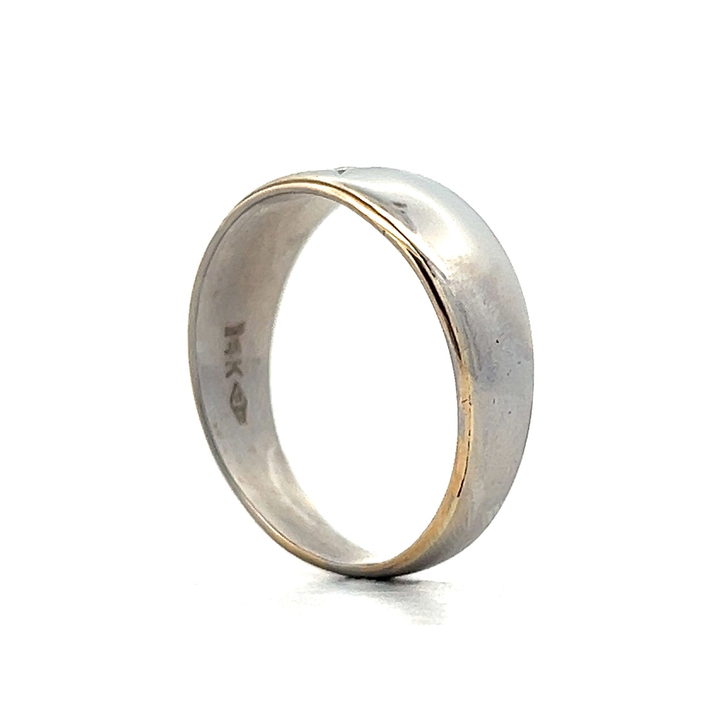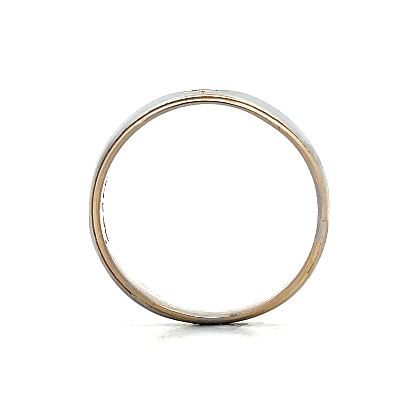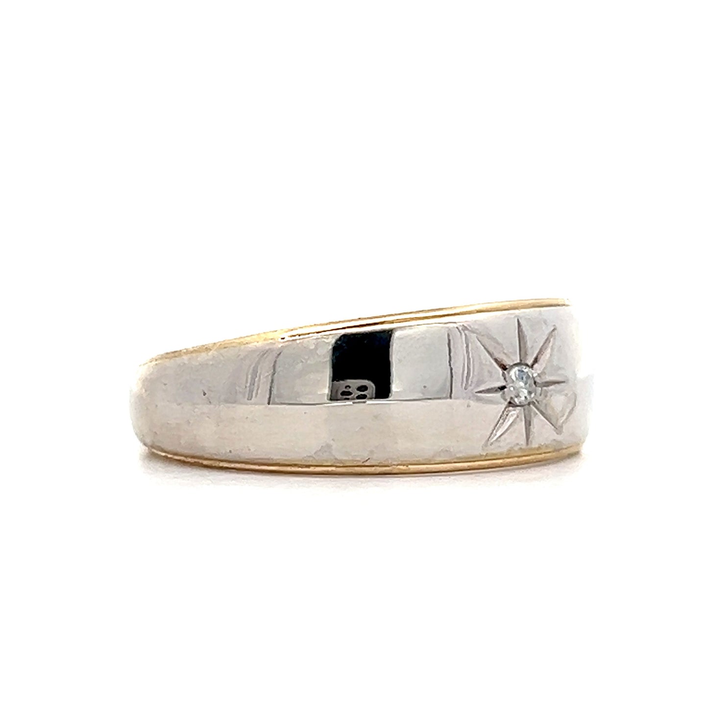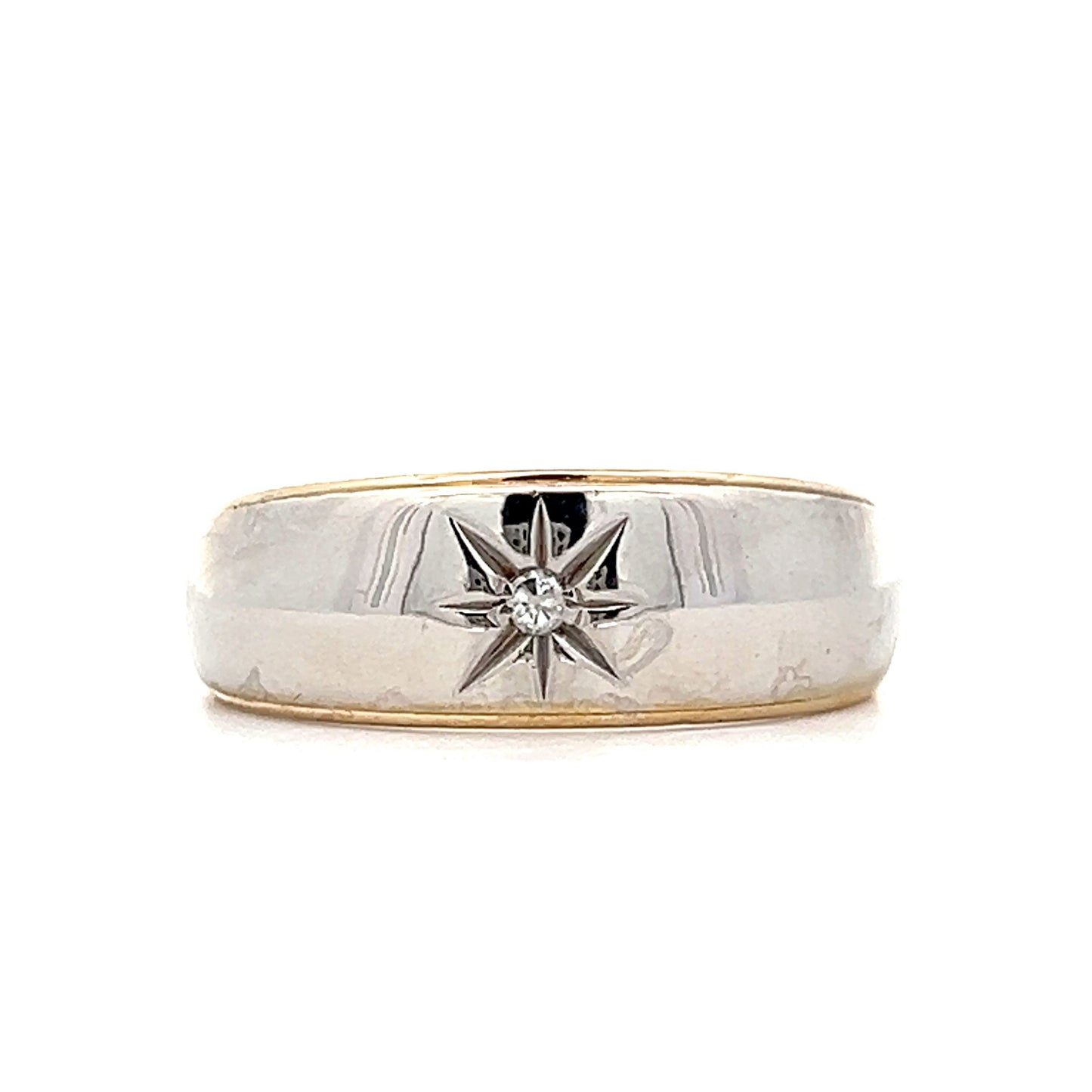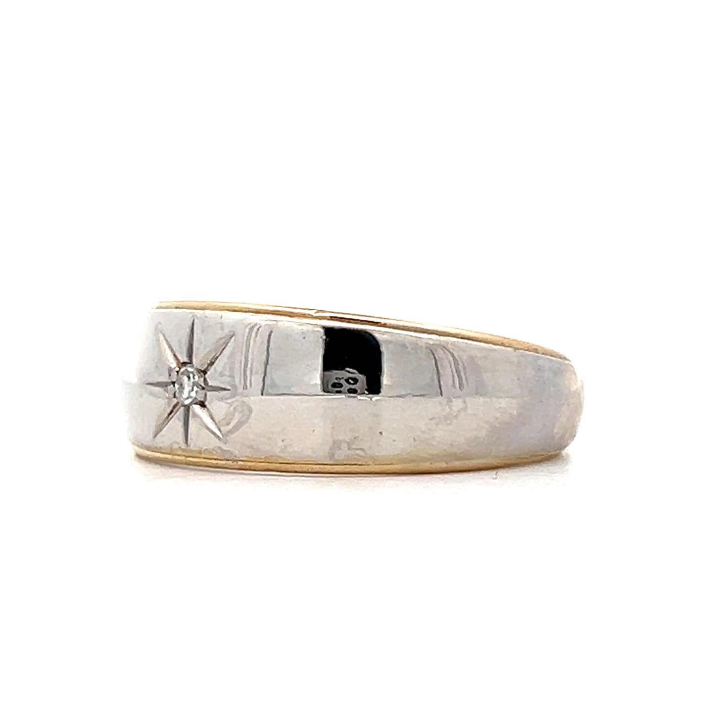 Crafted from 14 karat white and yellow gold, this Mid-Century piece exudes classic charm. The band features a solitaire diamond that is accented by an engraved starburst design that has a weight of .03 carats. The center of the ring is finished in 14k white gold while the exterior edges are in 14k yellow gold. The band tapers from top to bottom with the widest point being just under 8mm. The subtle details of this vintage band makes for a unique and modern feeling wedding band that has a substantial feel to it.