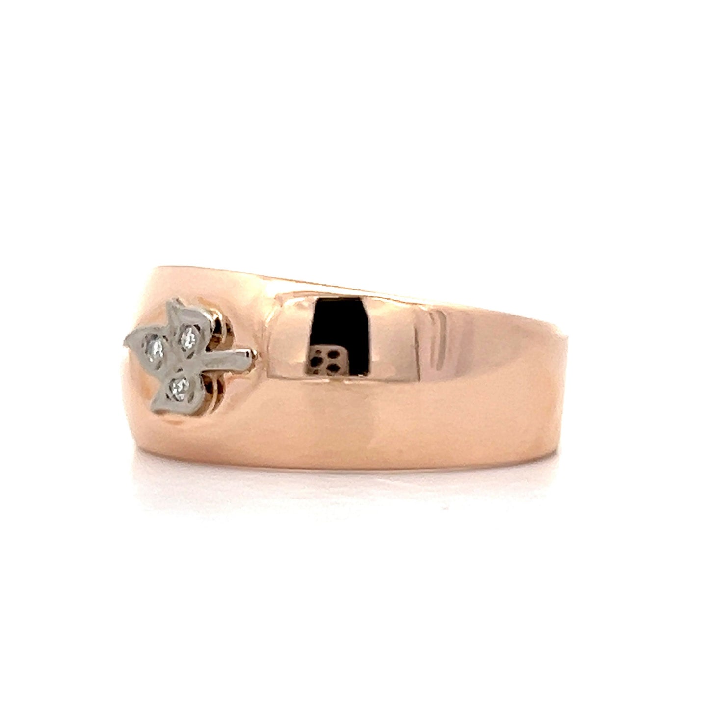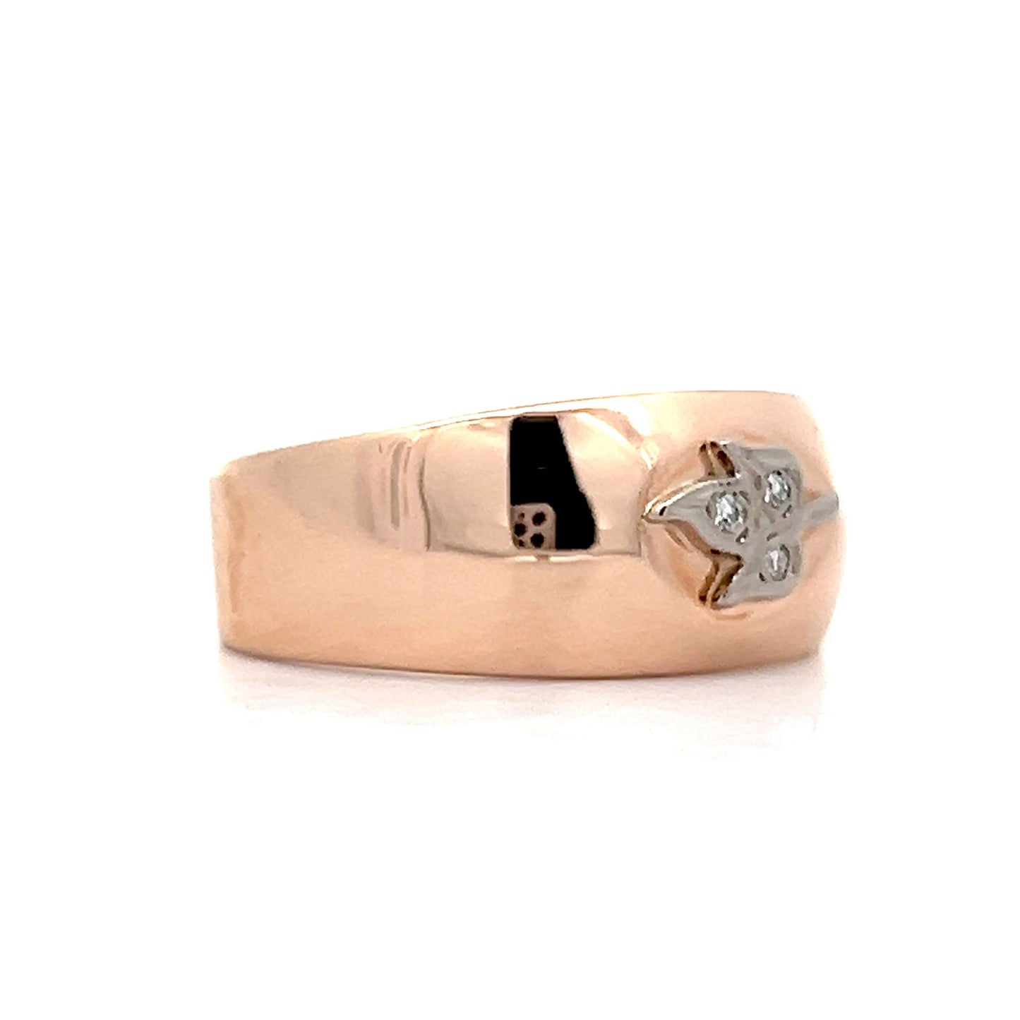 Made from 14 karat rose gold, it features a distinctive single cut diamond leaf motif that captures the Retro era’s bold flair. The .03 carat diamond, with SI1 clarity and H color, adds just the right amount of glint against the wide band, which offers a comfortable fit and a unisex appeal. Whether worn on its own or stacked, this ring brings a genuine slice of vintage style, standing out with a character that’s unapologetically Retro.