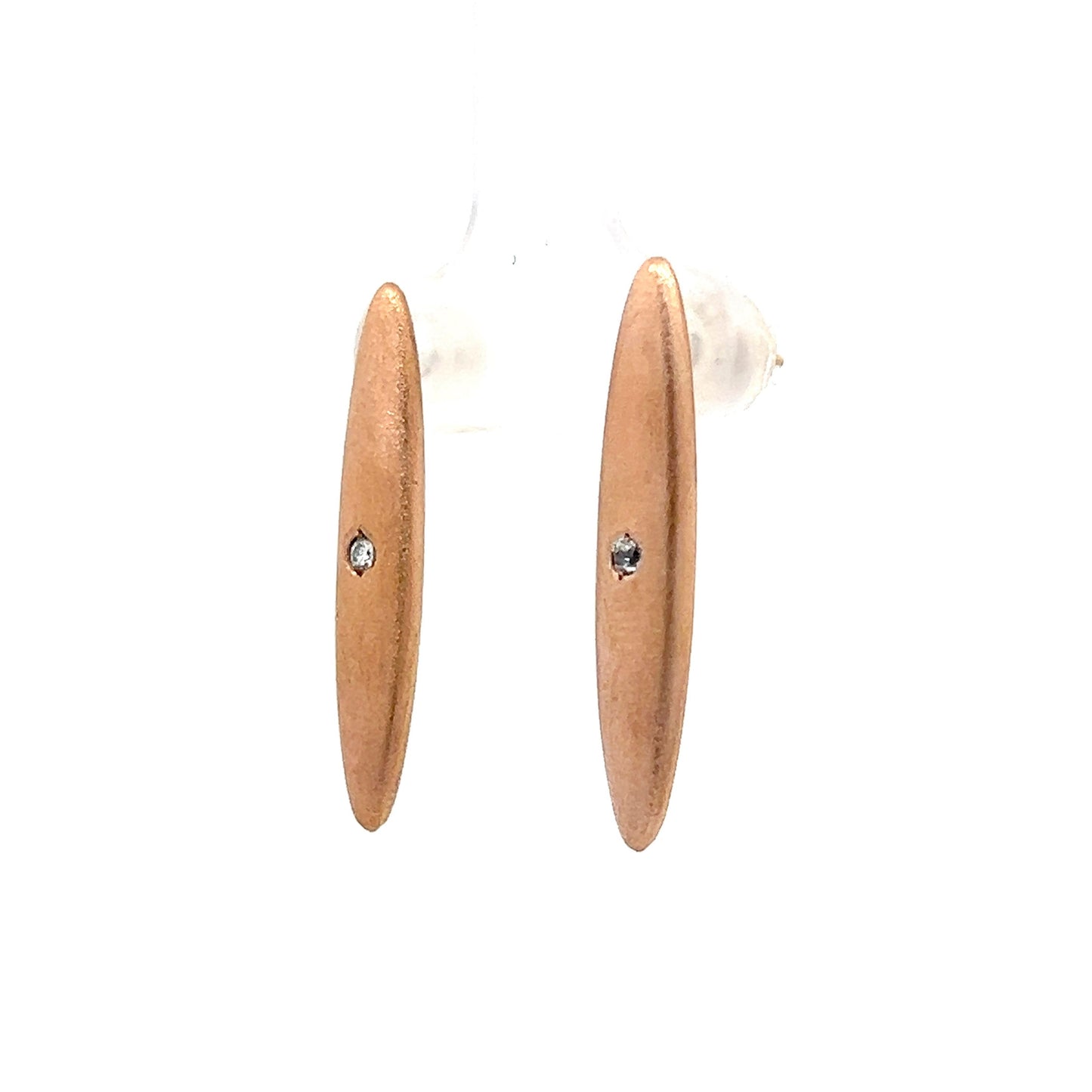 These Victorian drop earrings are crafted from 14 karat rose gold and feature a single in diamond in the center. The diamond, with SI1 clarity and H color, weighs .04 carats. The earrings stand out with their brushed textured finish and elegant navette shape. Originally designed as lingerie clips, they have been converted into earrings giving them a modern refresh.
