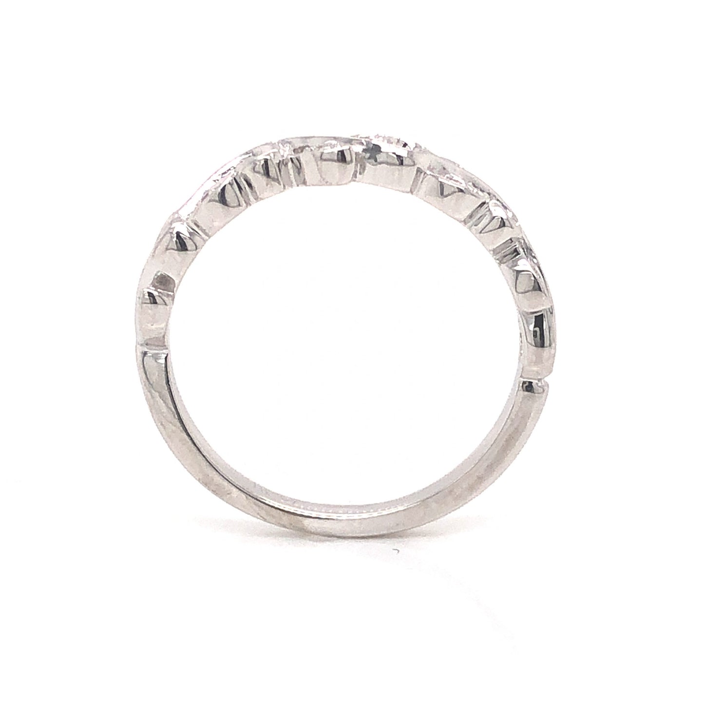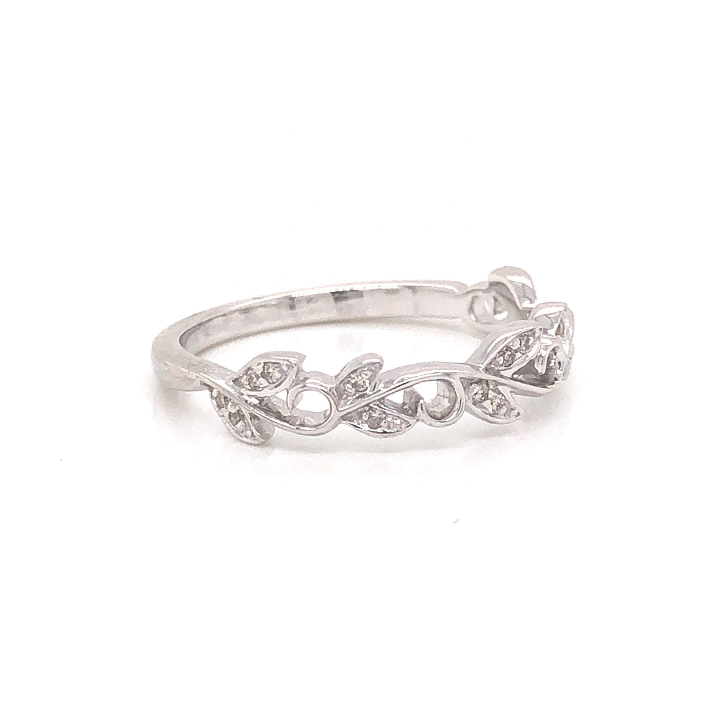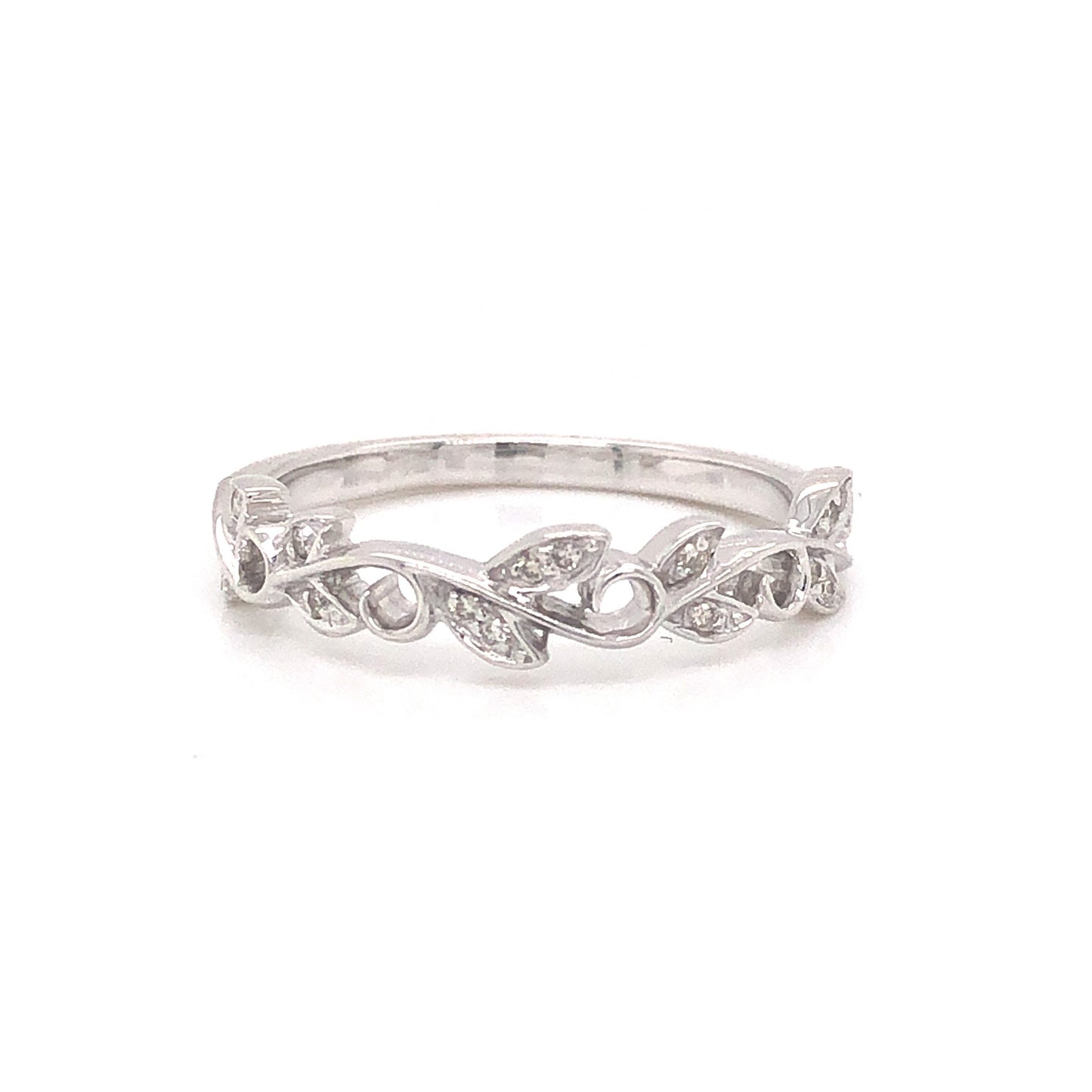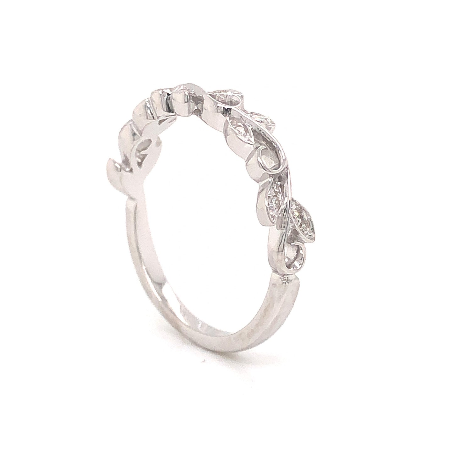 This vintage-inspired, Modern ring features a unique leaflet design and .05 carats of diamonds in 14 karat white gold. Sixteen (16) diamonds decorate the swirling leaf pattern, giving a luminous sparkle to its earthly shape. This stylish wedding band will pair well with most white gold engagement rings or can be worn on the right hand in a stack.