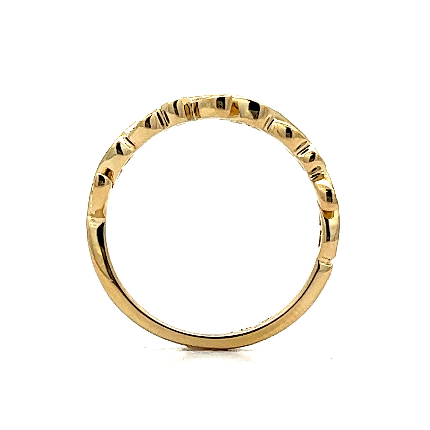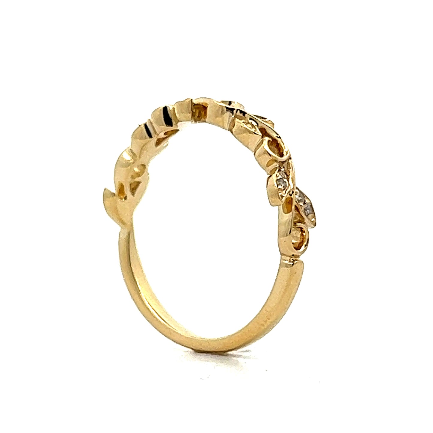 .05 Diamond Leaf Wedding Band in 14k Yellow Gold. This vintage-inspired, Modern ring features a unique leaflet design and .05 carats of diamonds in 14 karat yellow gold. Sixteen (16) diamonds decorate the swirling leaf pattern, giving a luminous sparkle to its earthly shape. This stylish wedding band will pair well with most yellow gold engagement rings or can be worn on the right hand in a stack.