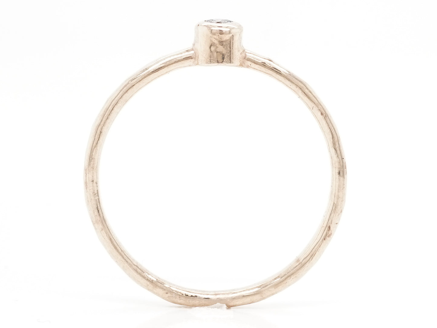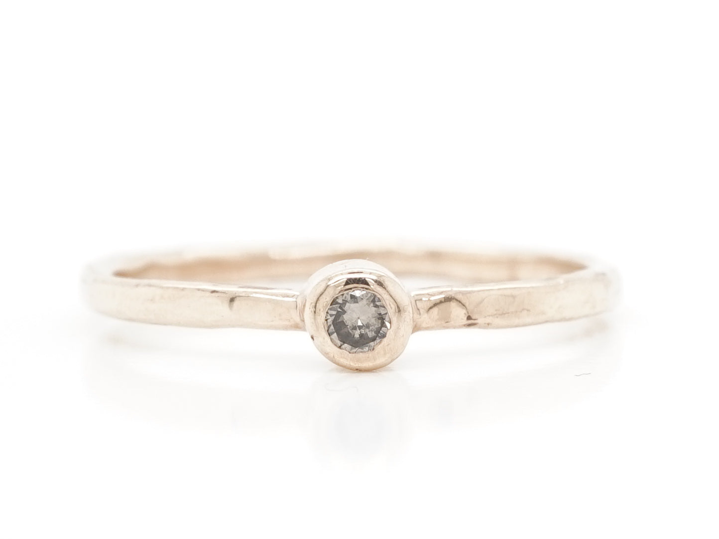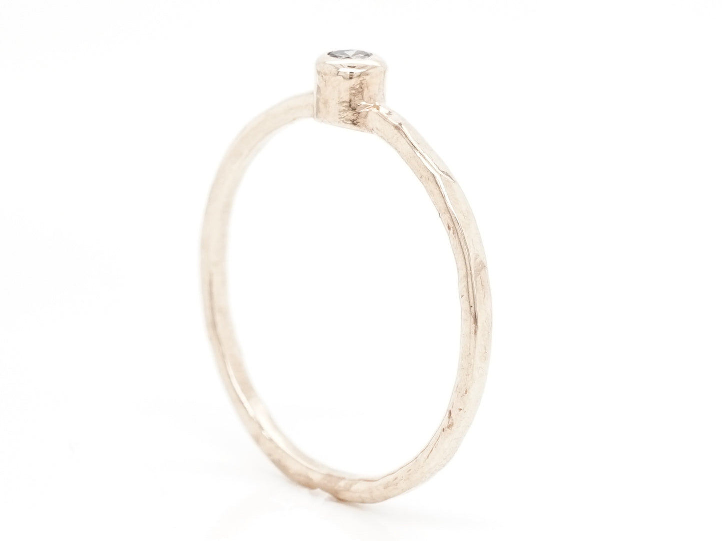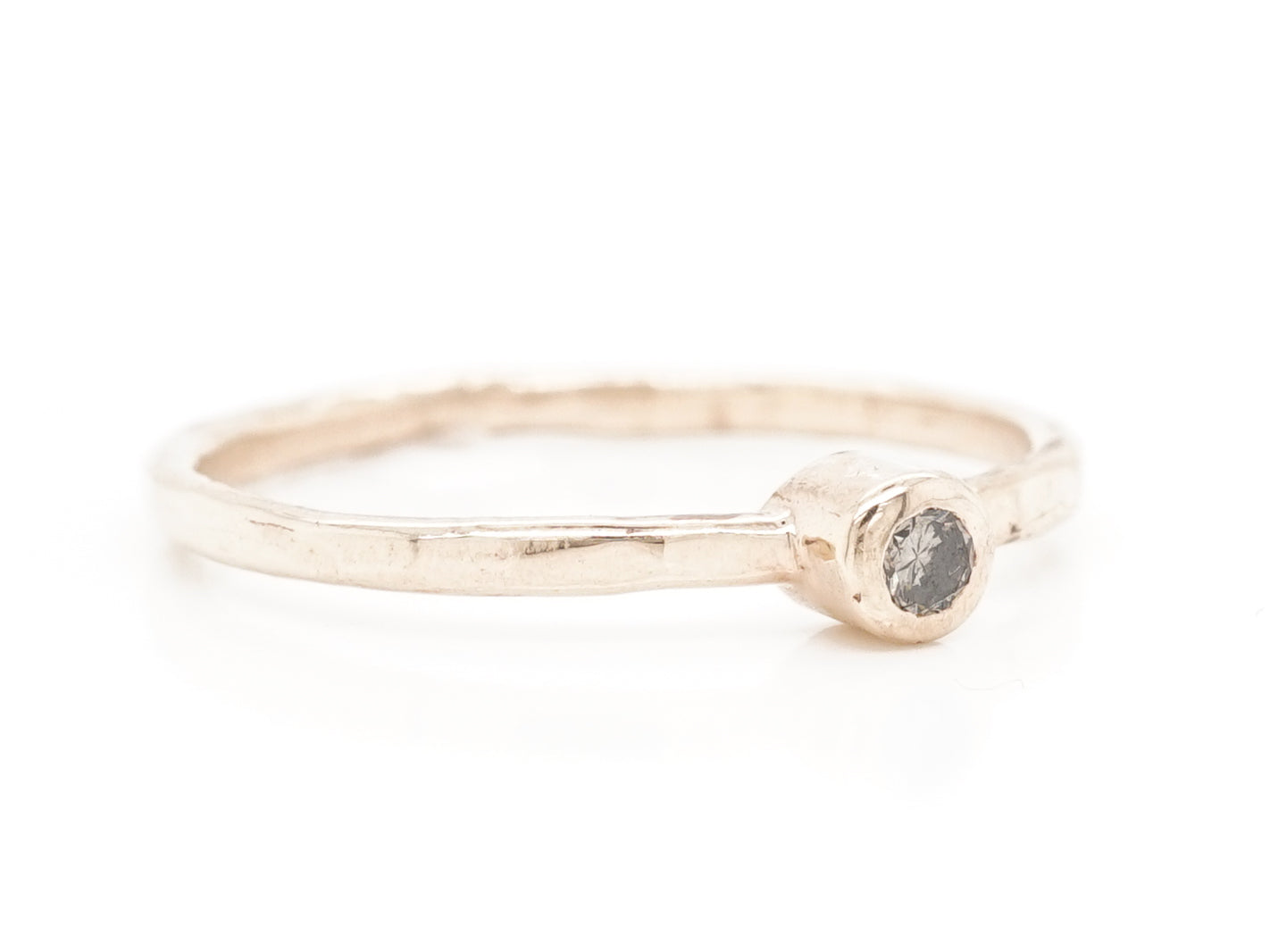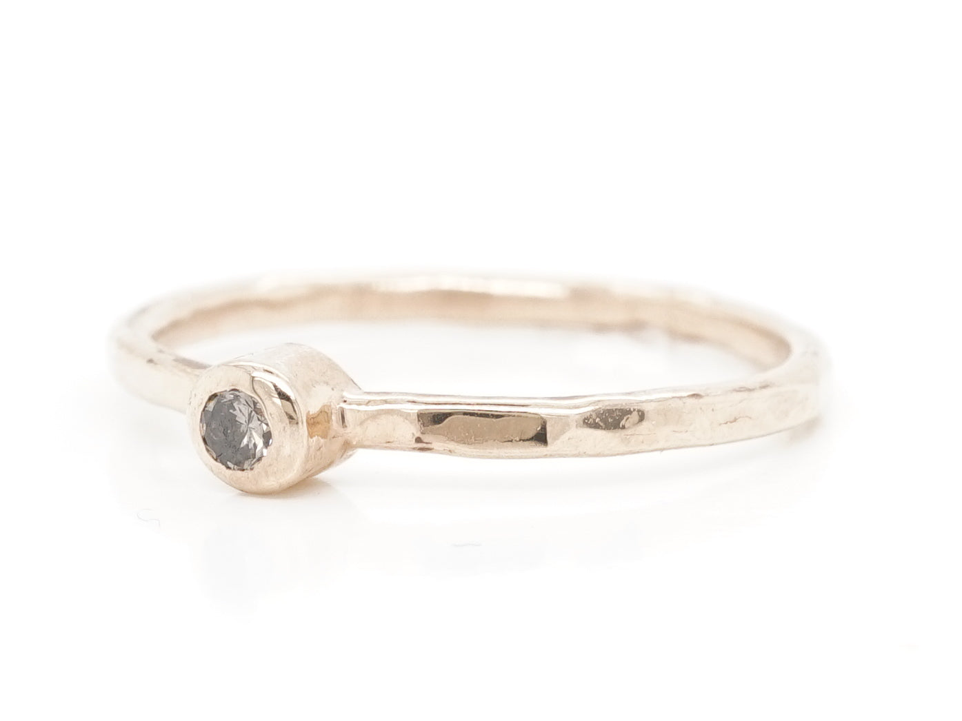 .05 Single Diamond Stacking Band in 14k Rose Gold. This beautiful, everyday stacking band features a .05 carat diamond finished in 14 karat rose gold. The primary diamond is near colorless and brilliant, set in a bezel mounting. The ring has a soft, hammered texture and is finished in polished 14k rose gold. This modern ring can be worn as a fabulous stacking or wedding band!