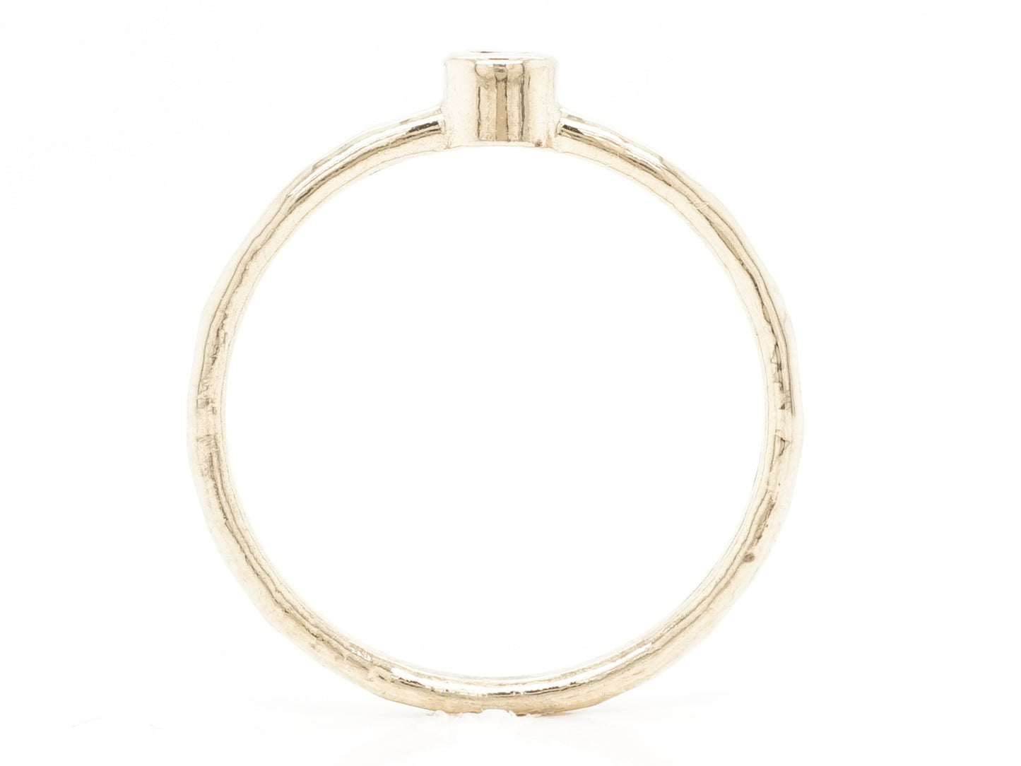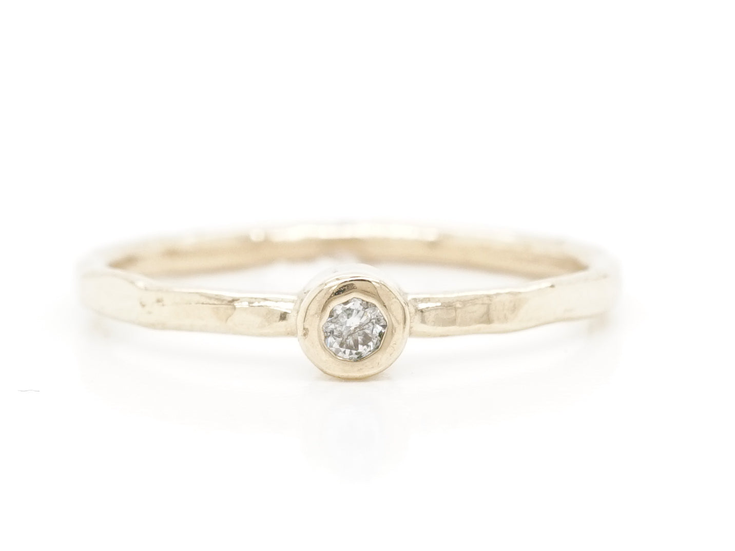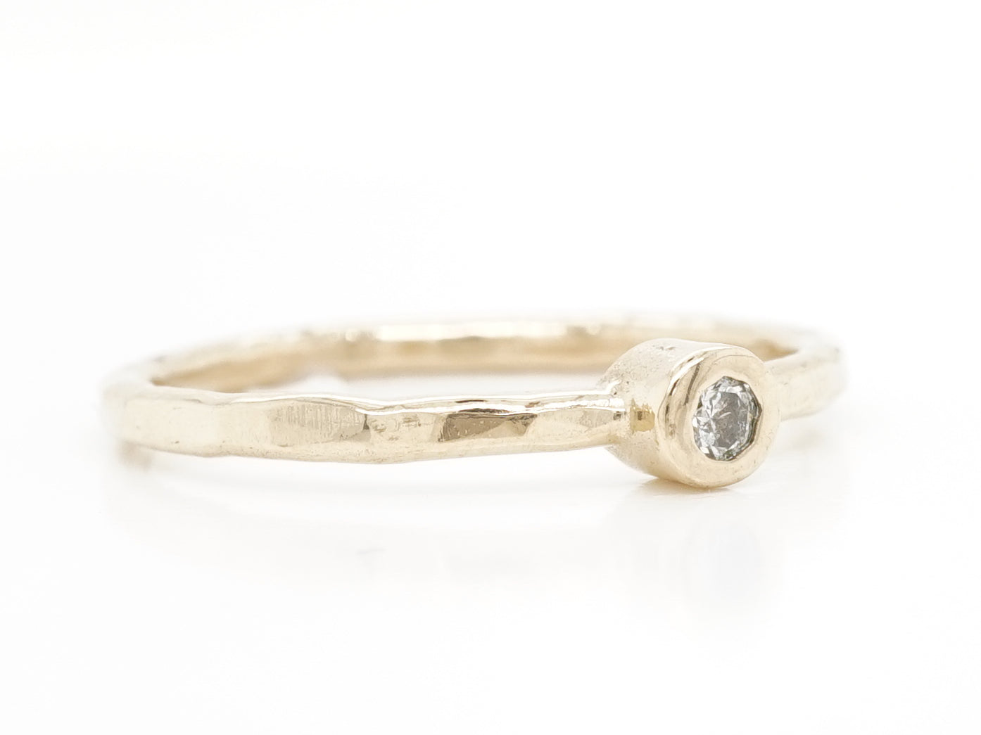 .05 Solitaire Diamond Stacking Band in 14k Yellow Gold. This modern stacking band features a .05 carat diamond in 14 karat yellow gold. The primary diamond is bezel set and reflects a faint yellow hue that matches the warmth of the 14k yellow gold shank. The shank has a textured finish, giving this stacking ring a touch of added dimension. This solitaire diamond ring would be an excellent choice as a wedding band or can be worn as an everyday stacking ring!