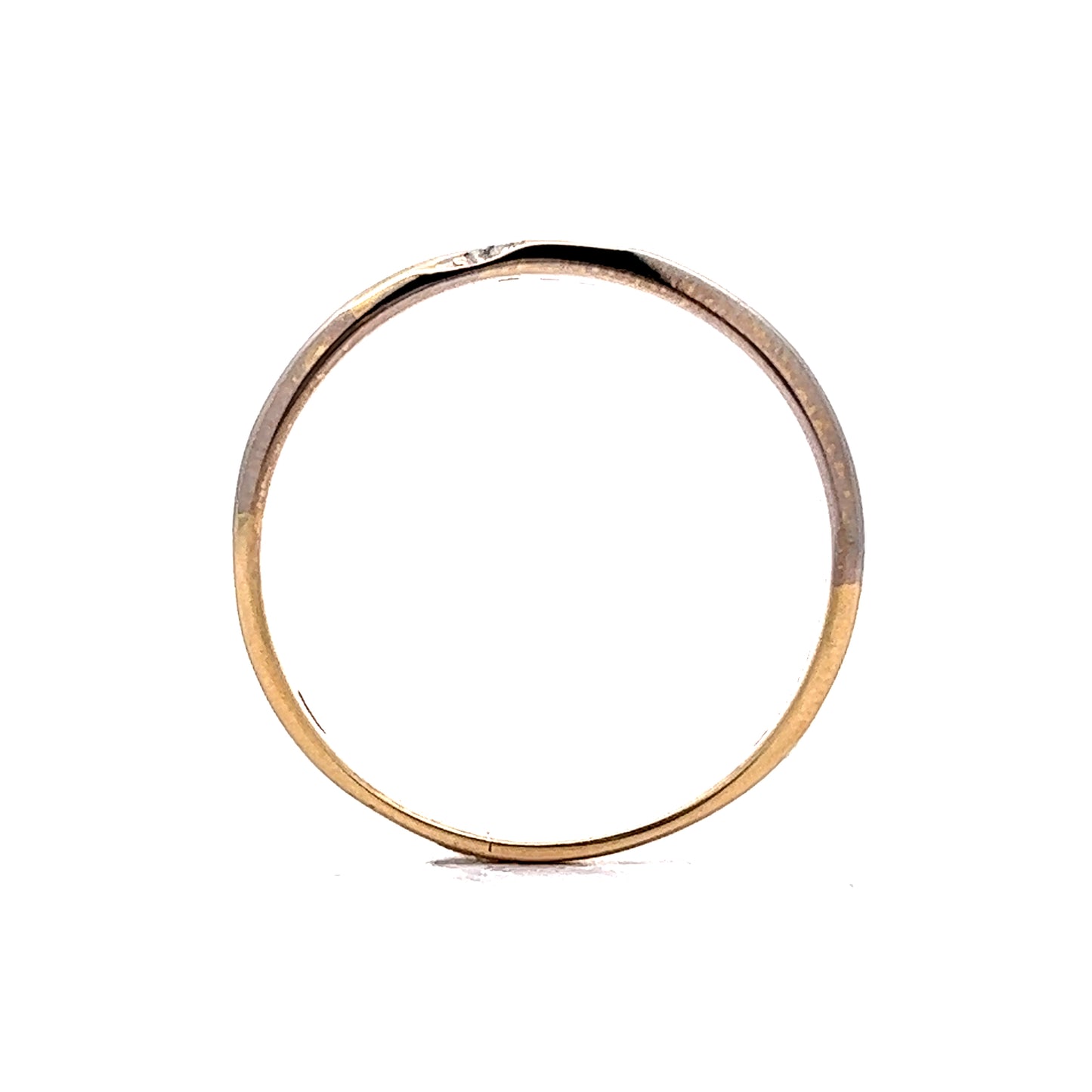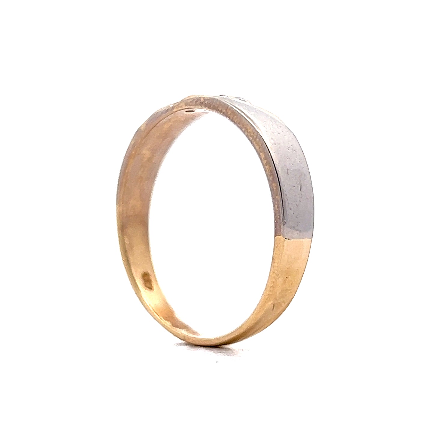 This unique two-tone men's wedding band is crafted in 14 karat white and yellow gold giving it a very vintage look. The band features four (4) round brilliant cut diamonds set diagonally across the band. The polished gold band is 5mm wide and is perfect for somebody looking for something a little different than a plain band.
