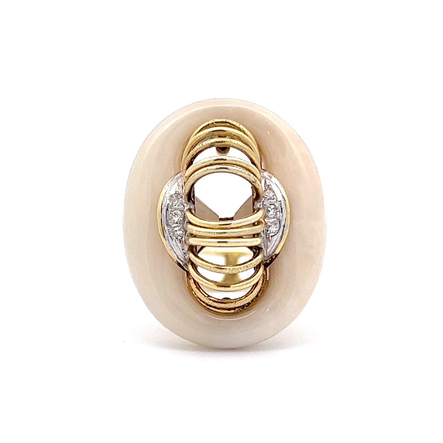 This Mid-Century cocktail ring is a beauty! Crafted in 14 karat yellow gold, this unique ring features six (6) round brilliant cut diamonds. Open metal work gives this ring a one of a kind look that is hard to find in modern pieces. A fun piece to add to your collection!