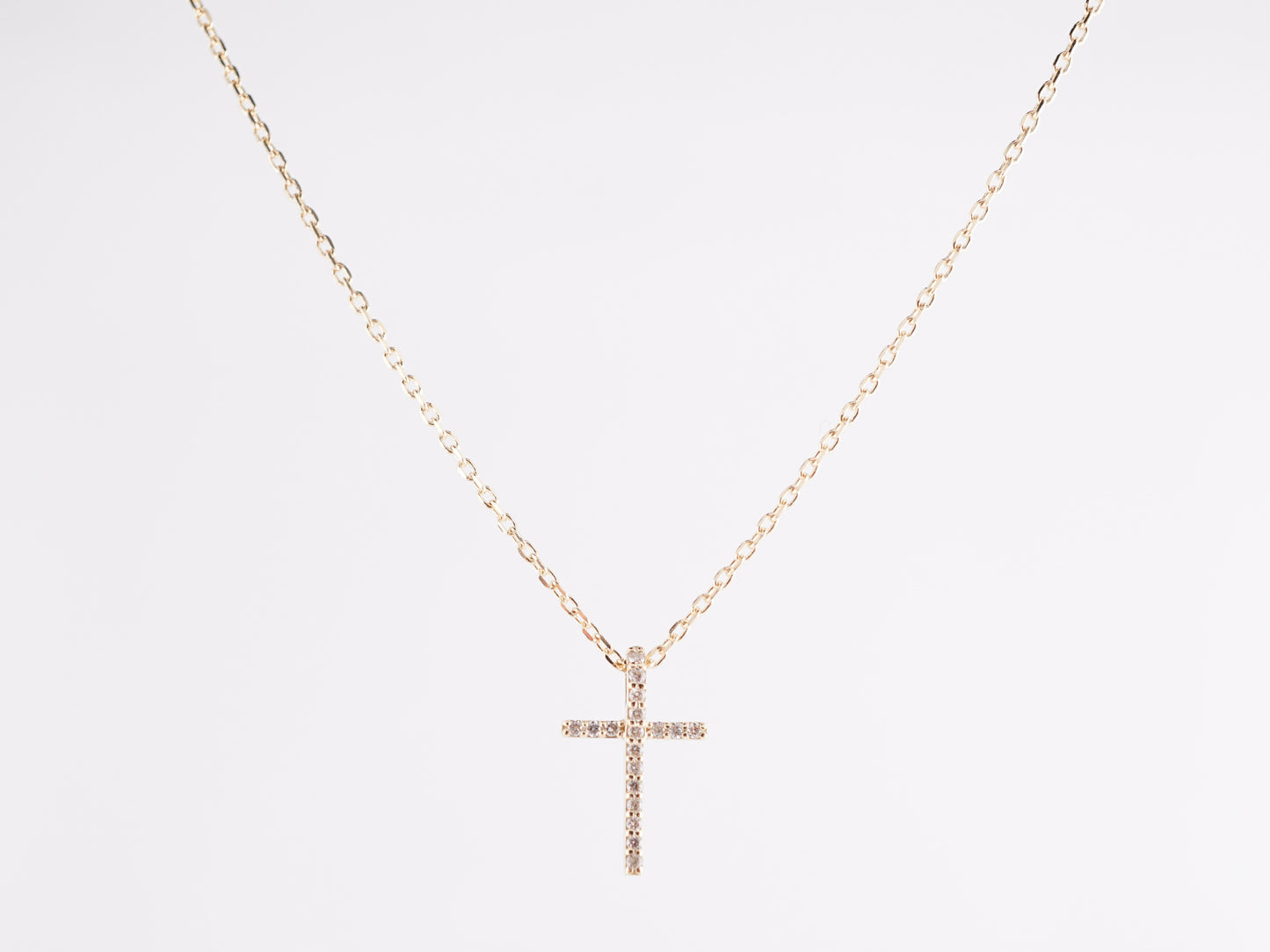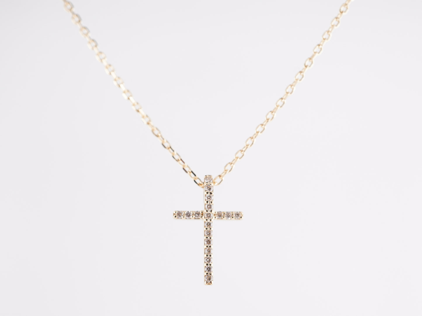 .07 Diamond Cross Necklace in 14k Yellow Gold. This dainty and elegant 17” diamond cross necklace features .07 carats of genuine natural diamonds on a 14k yellow gold chain. Round brilliant cut diamonds adorn the pendant with a very high color grade of G/H. This necklace weighs 1.69 grams and can be stacked with other yellow gold chains for a modern, fashion-forward look!