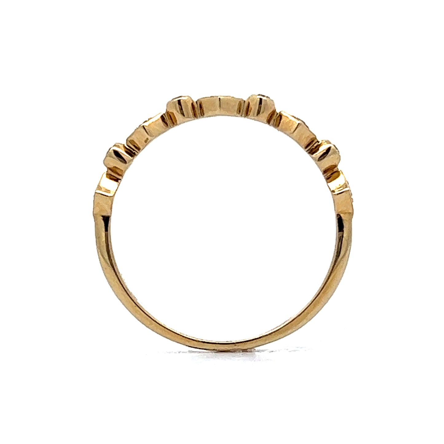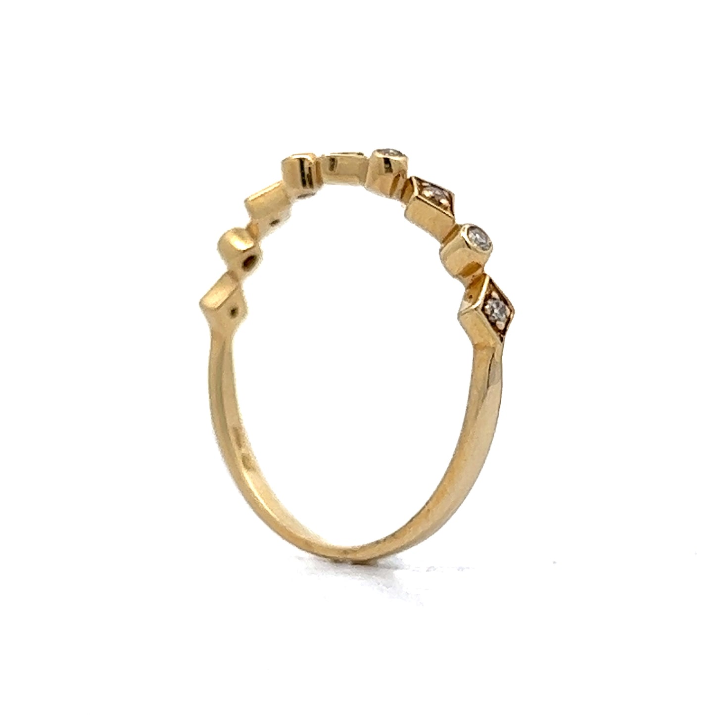 This geometric, half-eternity wedding band features nine petite natural diamonds in radiant 14k yellow gold. This band would make a lovely addition to a solitaire engagement ring for a bit of flair, or could be worn on the right hand as a stacking ring. A harmonious pattern of squared and rounded shapes hold the collection of diamonds. A statement ring with beauty in all the fine details. Fall in love with this modern ring every time it catches your eye.