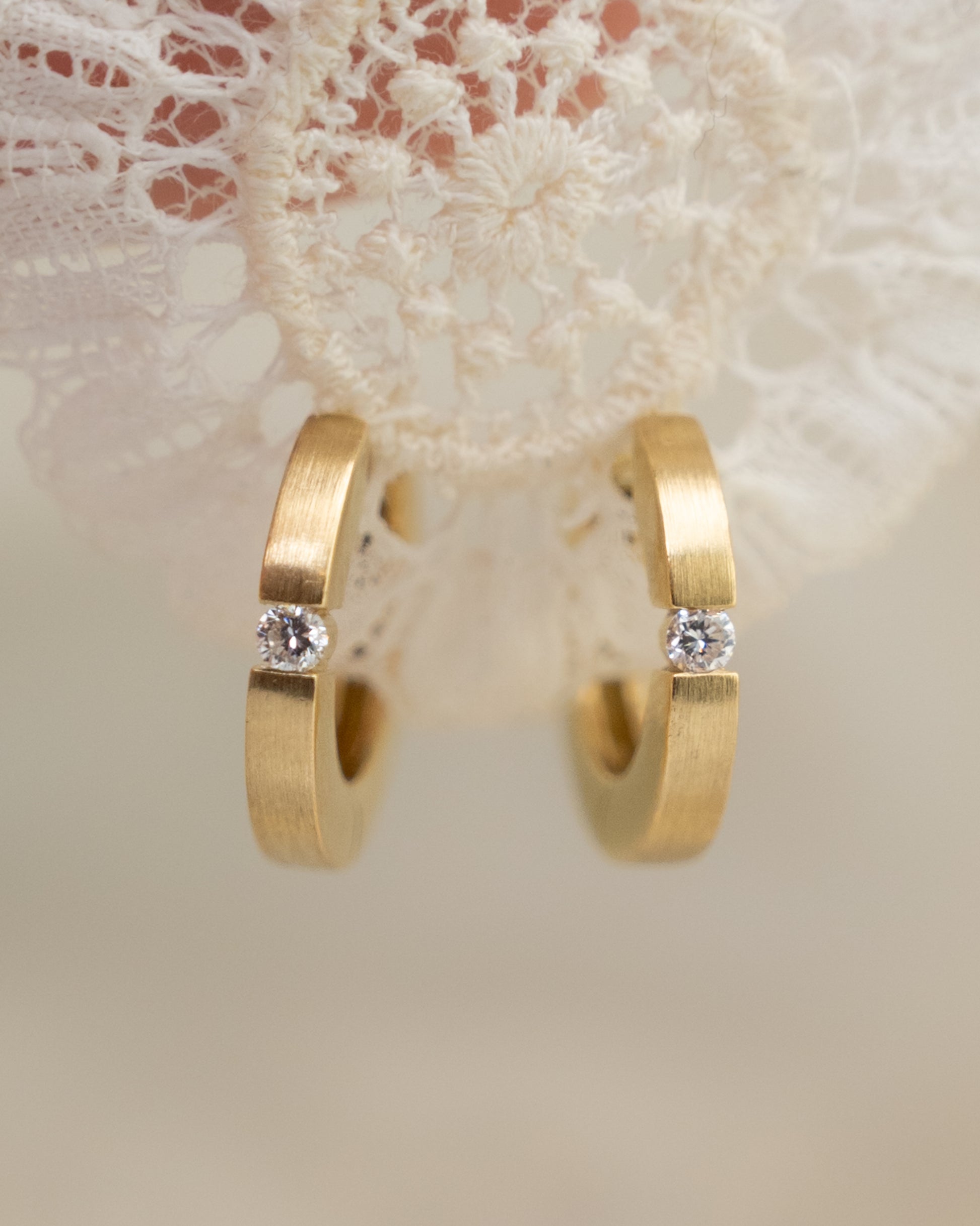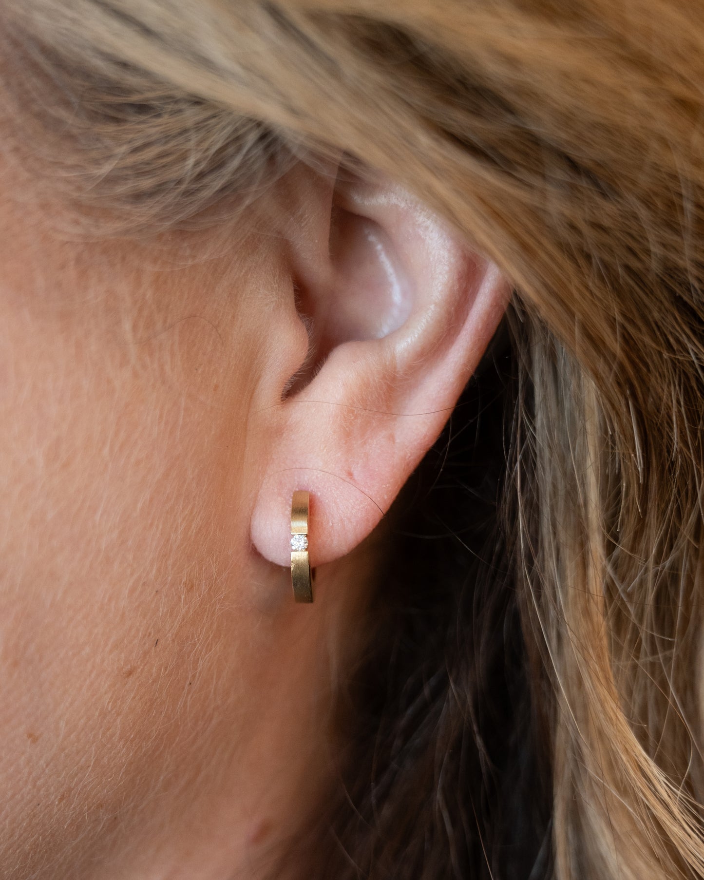The huggie style hoops fit closely around the earlobe rather than hanging down like traditional hoops.