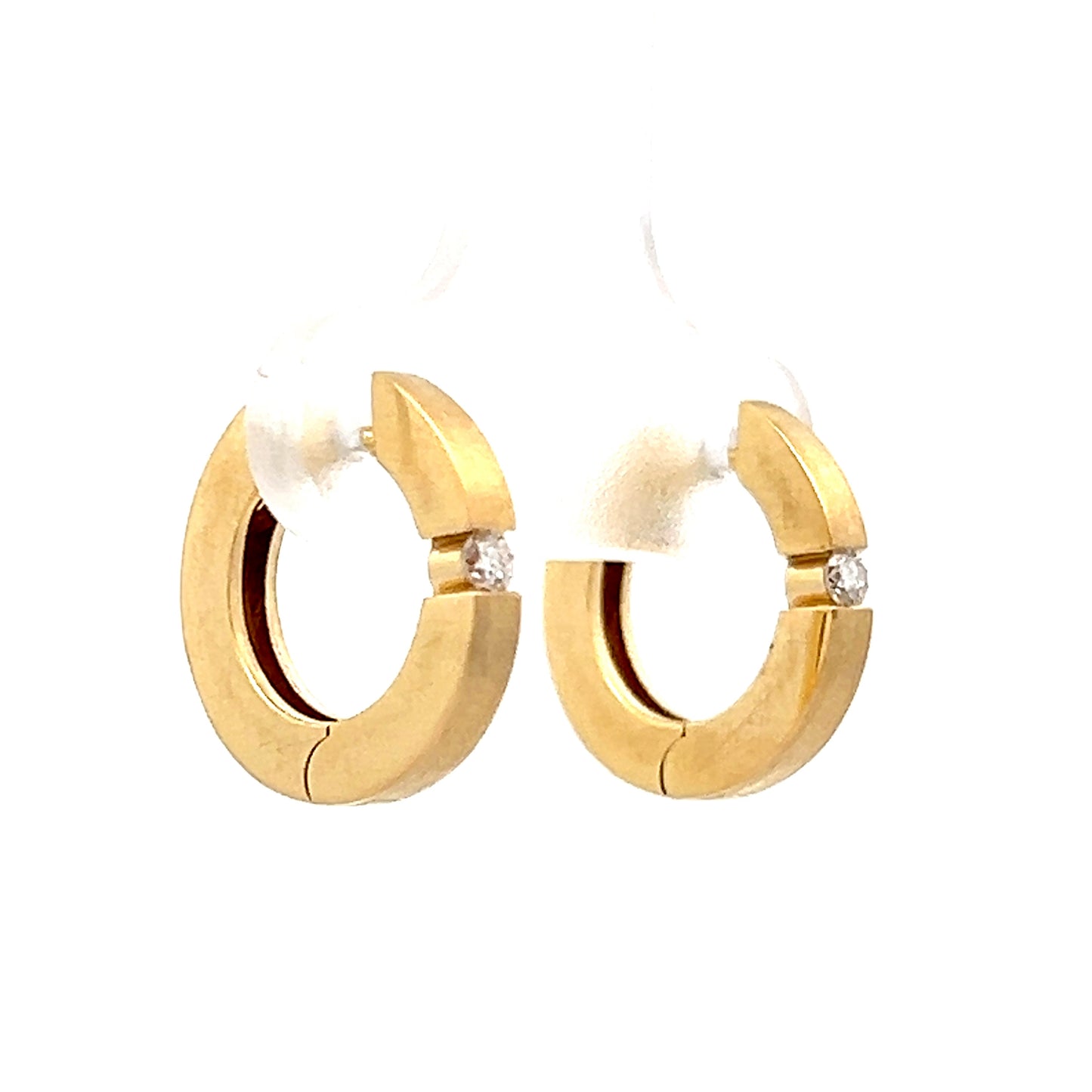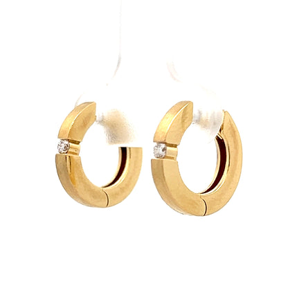 These huggie-style hoop earrings are made from 18 karat yellow gold with a flat edge design and measure 14 mm in length. The earrings feature round brilliant cut diamonds that total .07 carats with VS2 clarity and G color grade, which means they appear very clear and nearly colorless. The diamonds are set using an invisible setting technique where the stones appear to float without visible prongs or metal holding them in place.