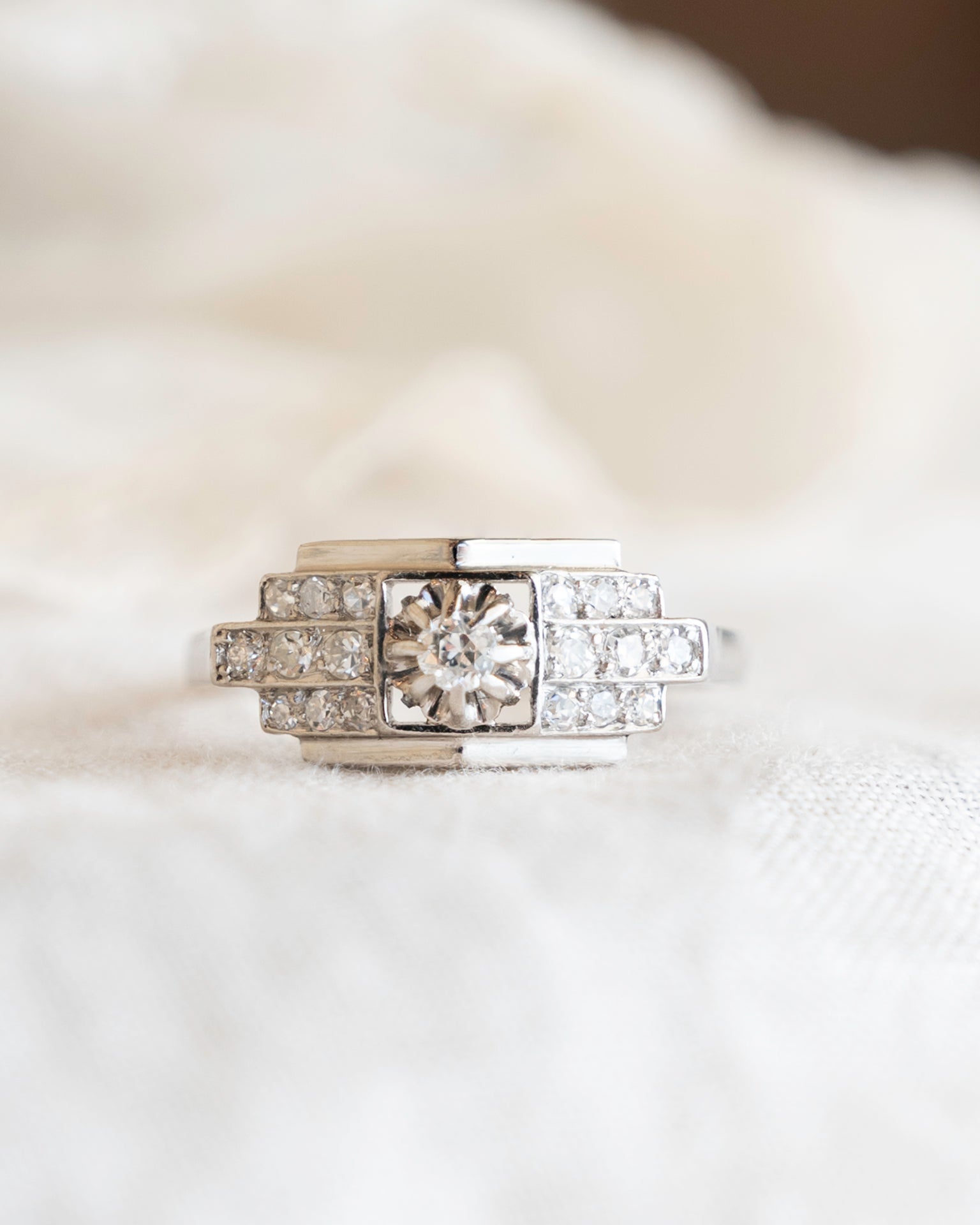 This Mid-Century vintage engagement ring features a .07 carat round brilliant cut diamond with VS2 clarity and F,G color in a prong setting, surrounded by 18 single cut diamond accents of 1.3mm each weighing .0125 carats, all set in platinum. The side stone design showcases the geometric style popular during the Mid-Century period. The total diamond weight is .29 carats, with the single cut accent diamonds adding sparkle around the center stone.