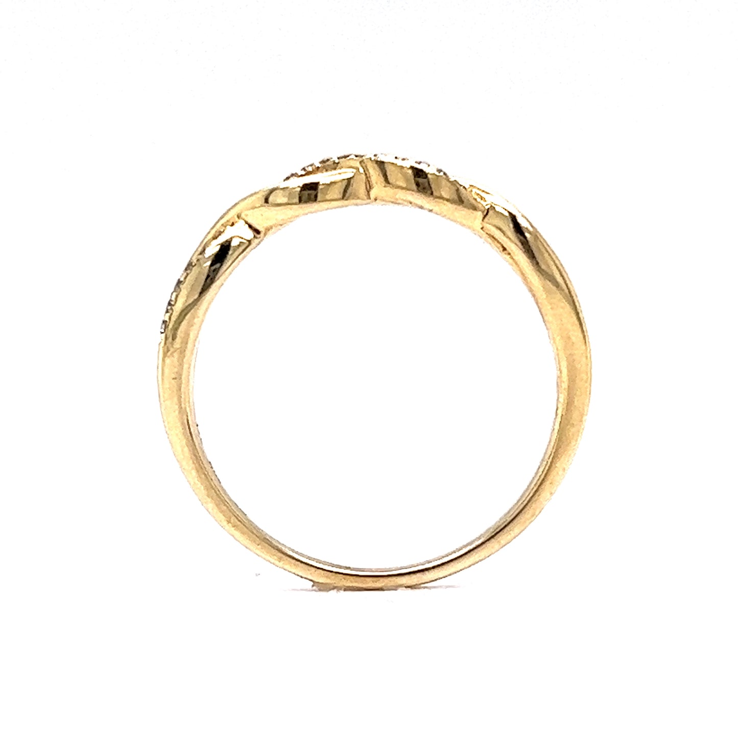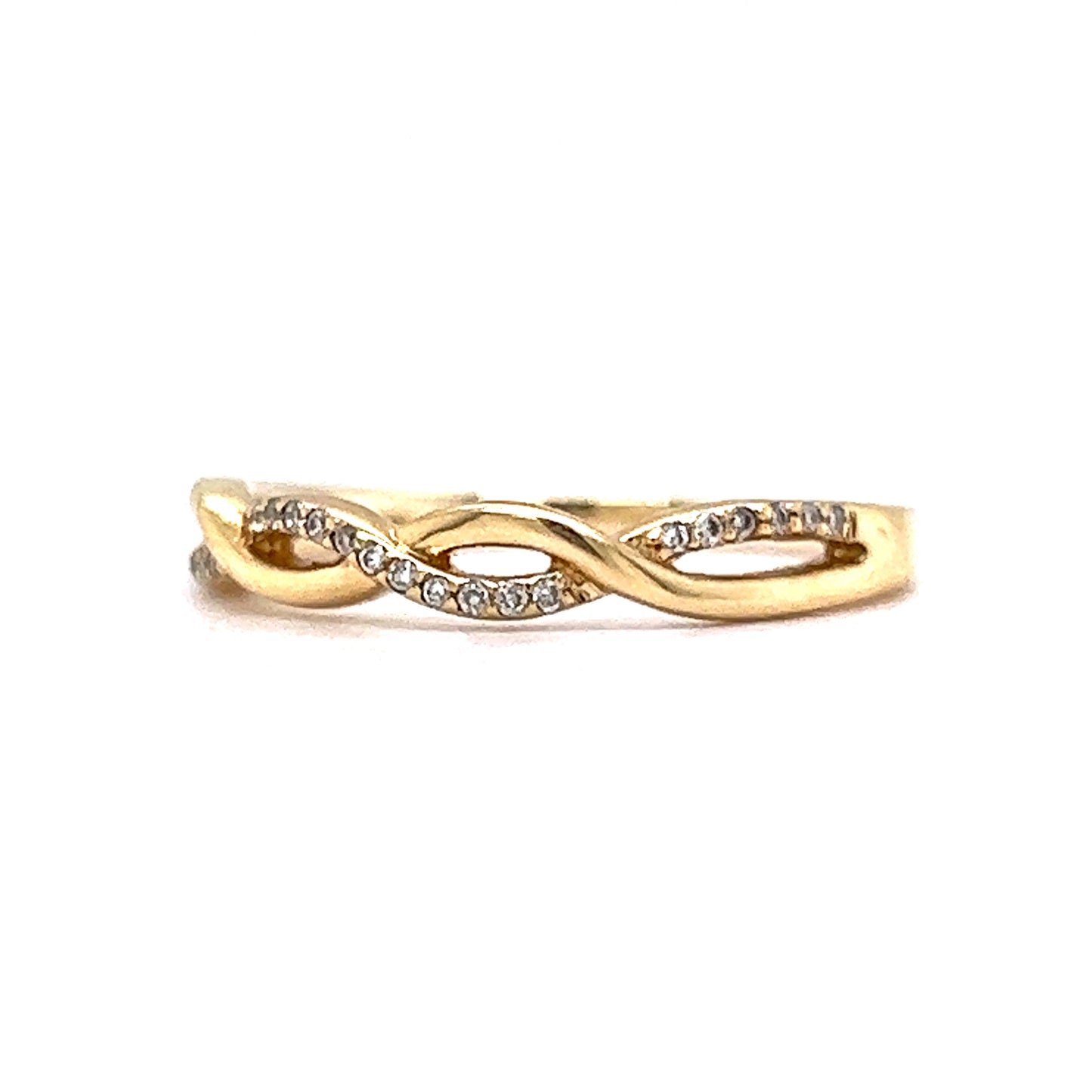 This 14k yellow gold wedding band features a twisted golden and diamond design. One strand holding a total of .08 carats of genuine natural diamonds. With no visible eye imperfections, these gorgeous, petite diamonds form a two-strand rope twist across half of the band. The craftsmanship of this wedding band is undeniable. Simple yet elegant, this overlapping diamond wedding band can be worn alone or stacked with more yellow gold rings for a stylish, modern look!