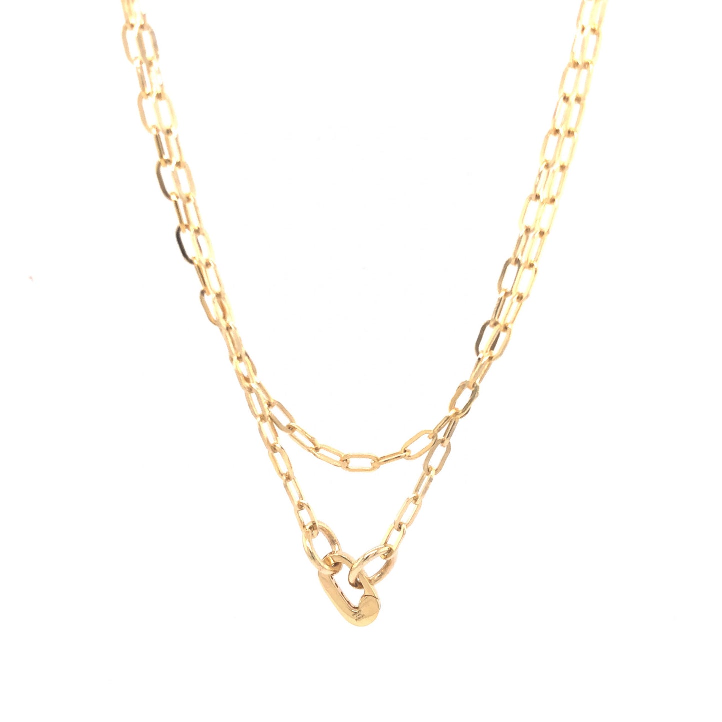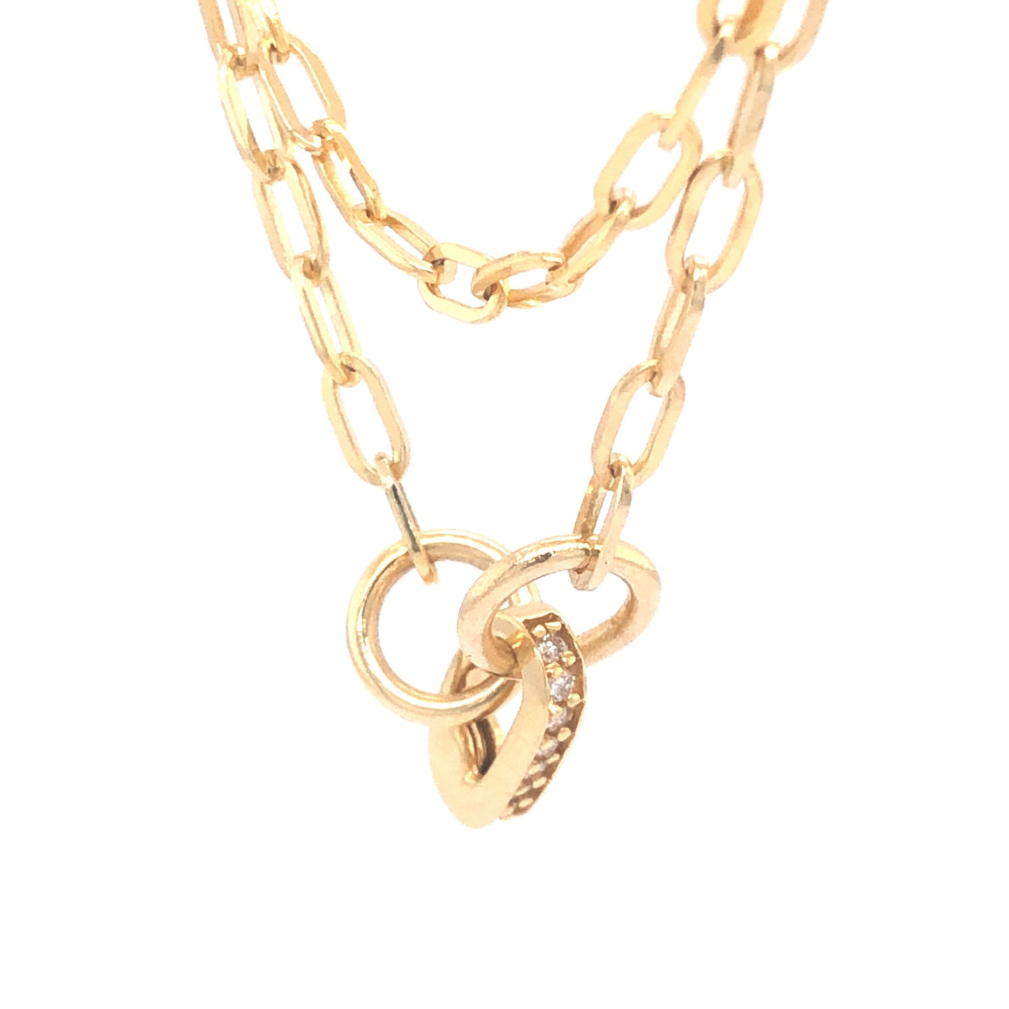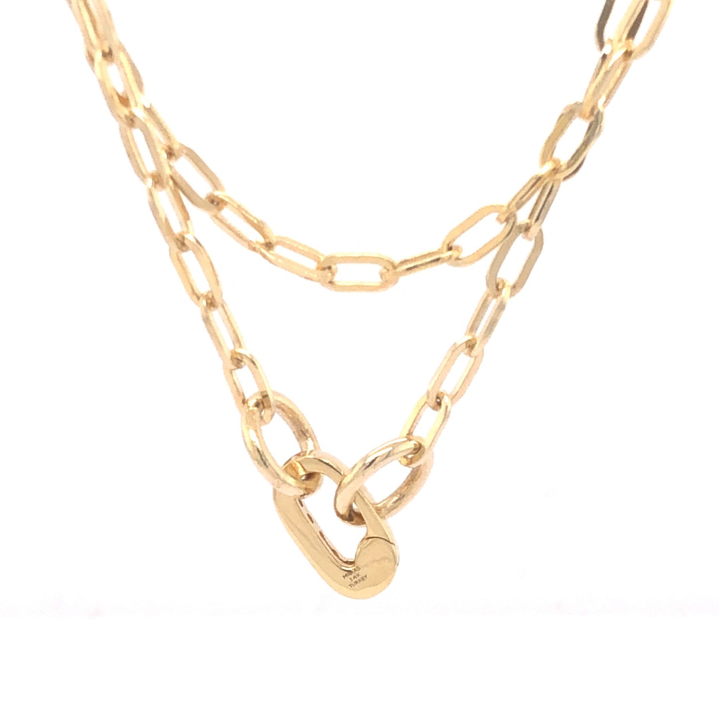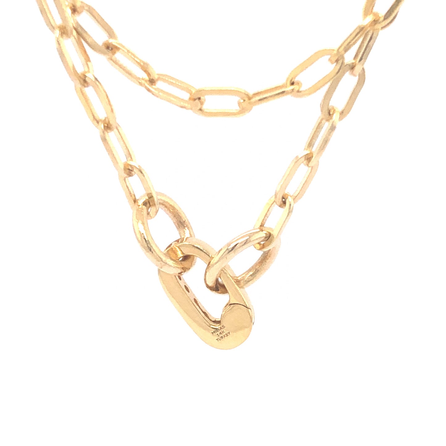 .08 Diamond Clasp Necklace in 14K Yellow Gold. Create the ultimate layered necklace look with this bold 20” chain link and diamond clasp necklace in 14 karat yellow gold. Eight (8) .01 carat diamonds decorate the clasp pendant. Featuring elongated links that dazzle with Mediterranean style, this long yellow gold chain is polished to perfection and will warm up your wardrobe in any season!