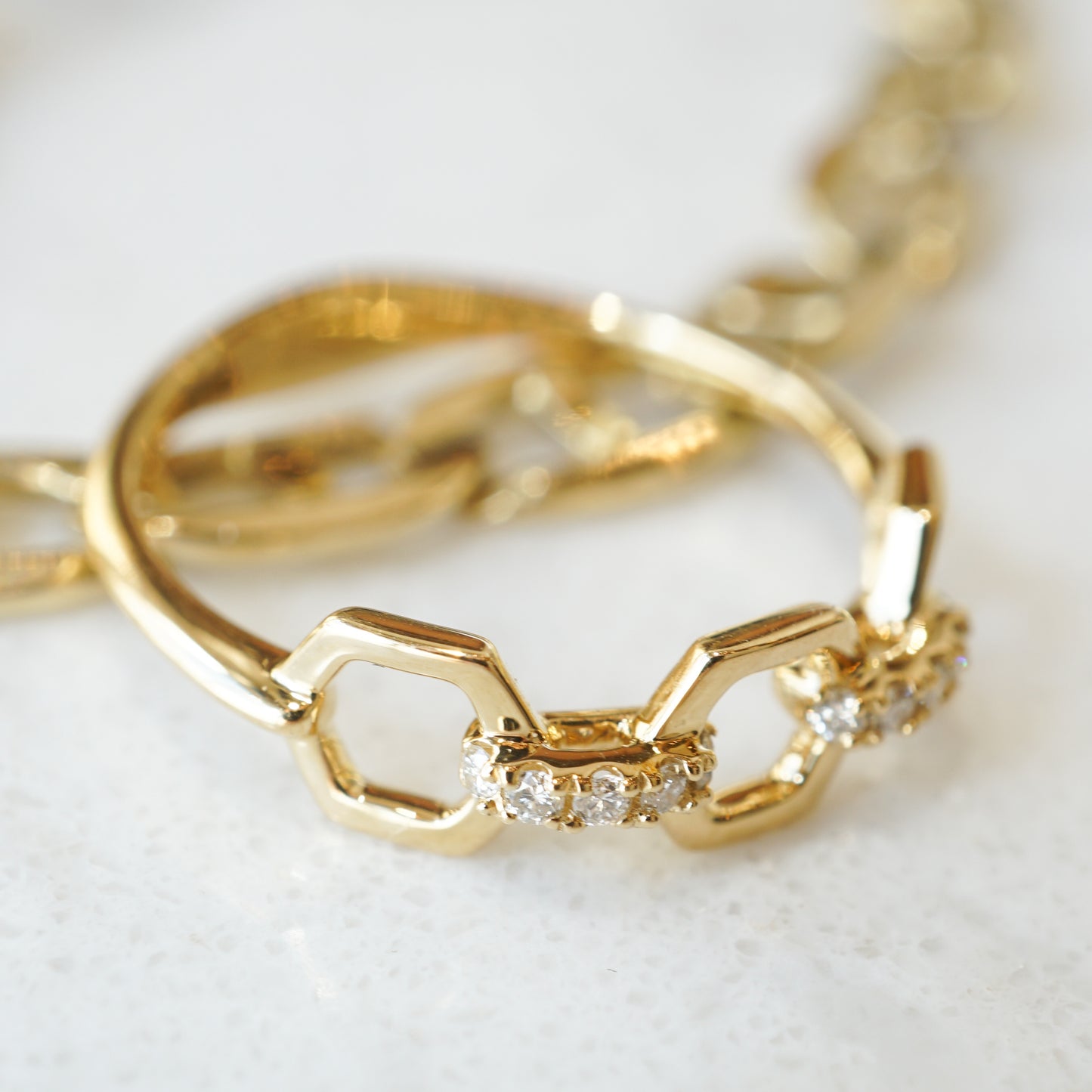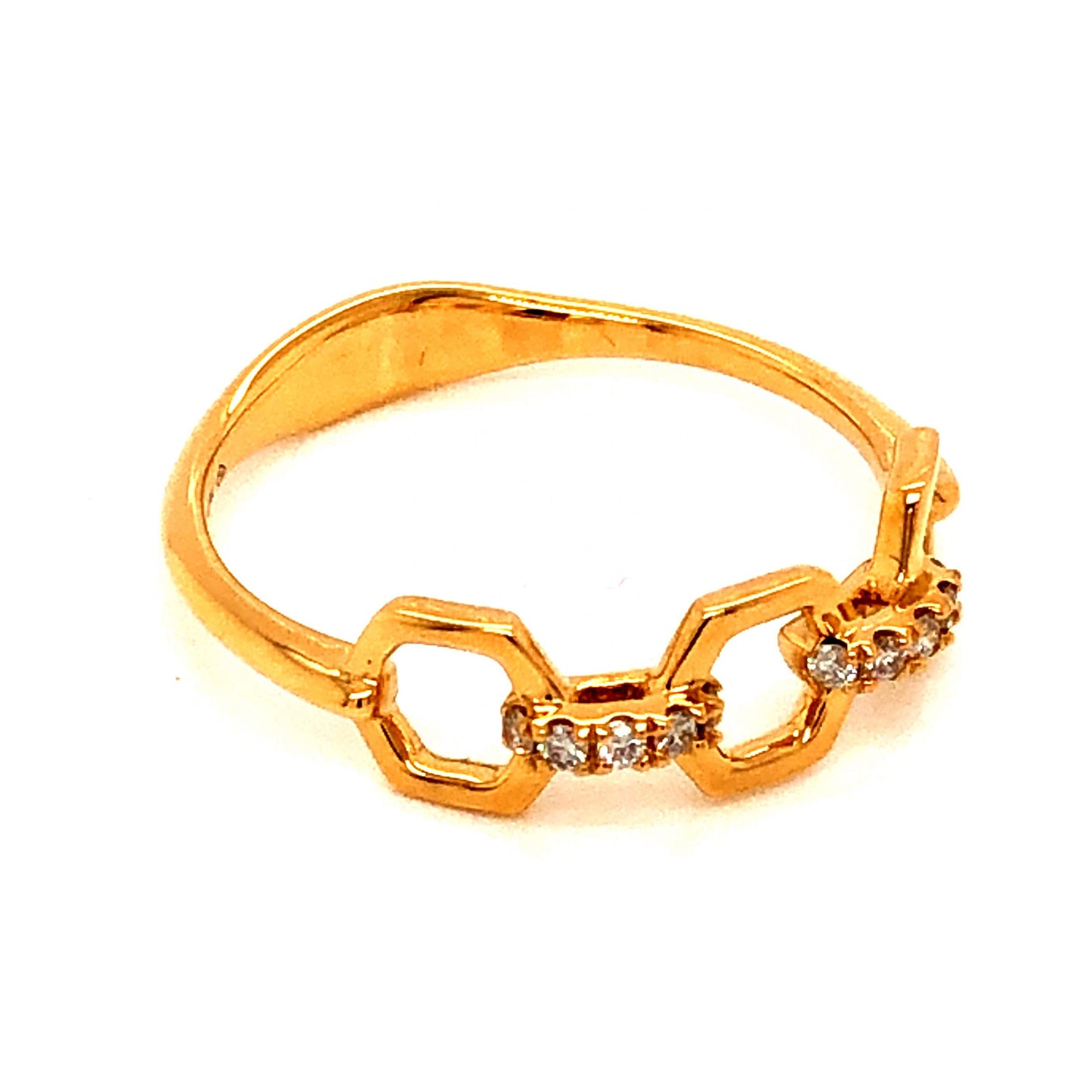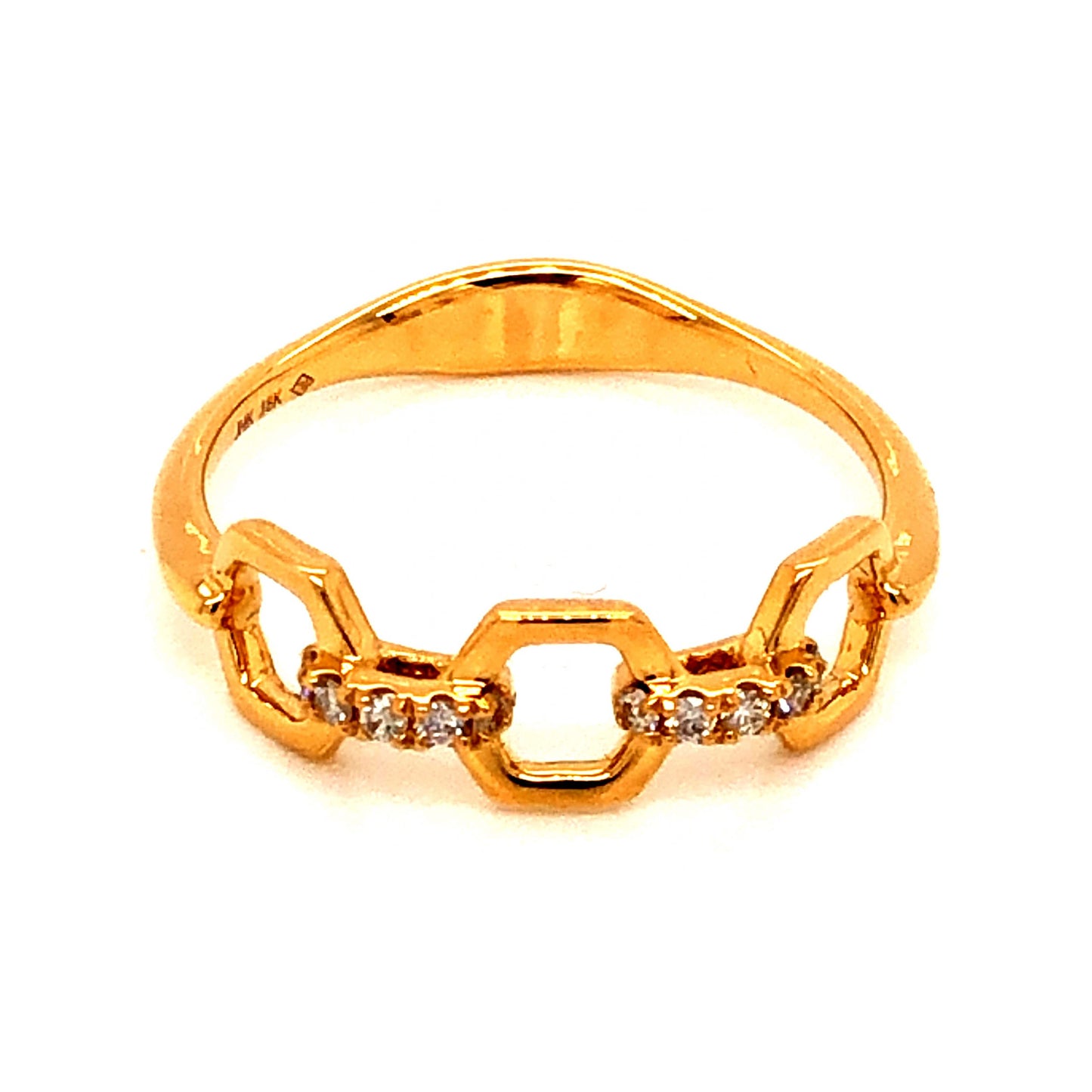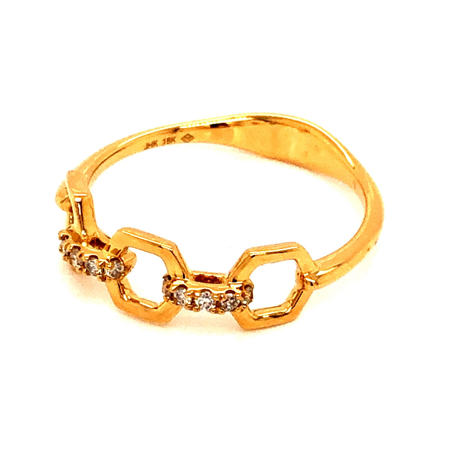 .08 Diamond Link Stacking Band in 18k Yellow Gold. This modern stacking band features .08 carats of diamonds on a chain link design, finished in 18 karat yellow gold. Ten (10) .008 carat diamonds are prong set on golden oval links that connect to larger hexagon links. The diamonds are near colorless and eye clean, bringing sparkle to the vibrant and polished 18k yellow gold. For a stacking ring with style and personality, this ring is a great choice to wear layered with more stacking bands or all on its own!