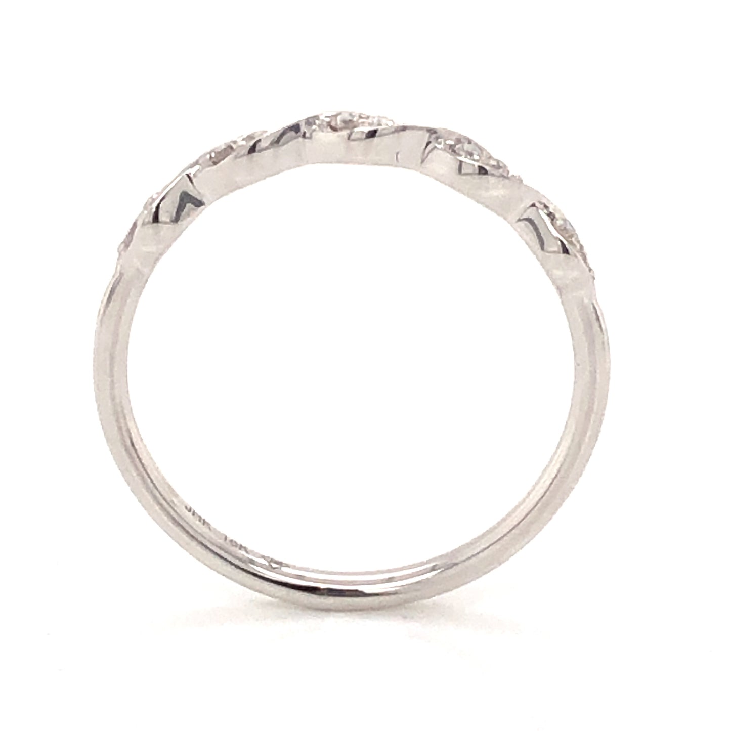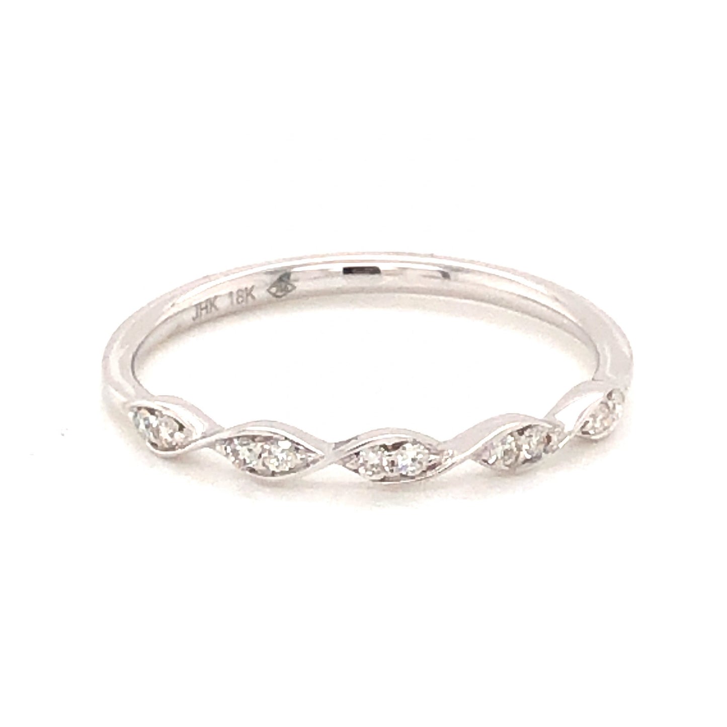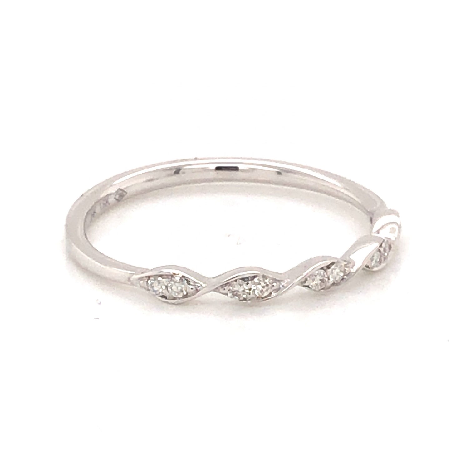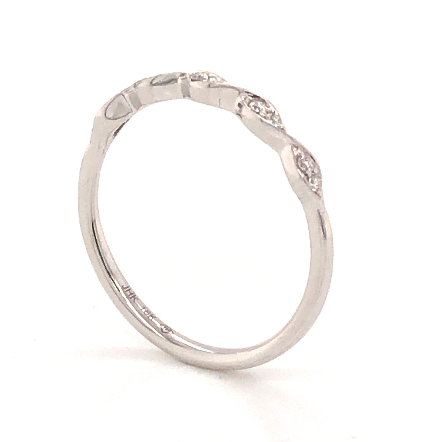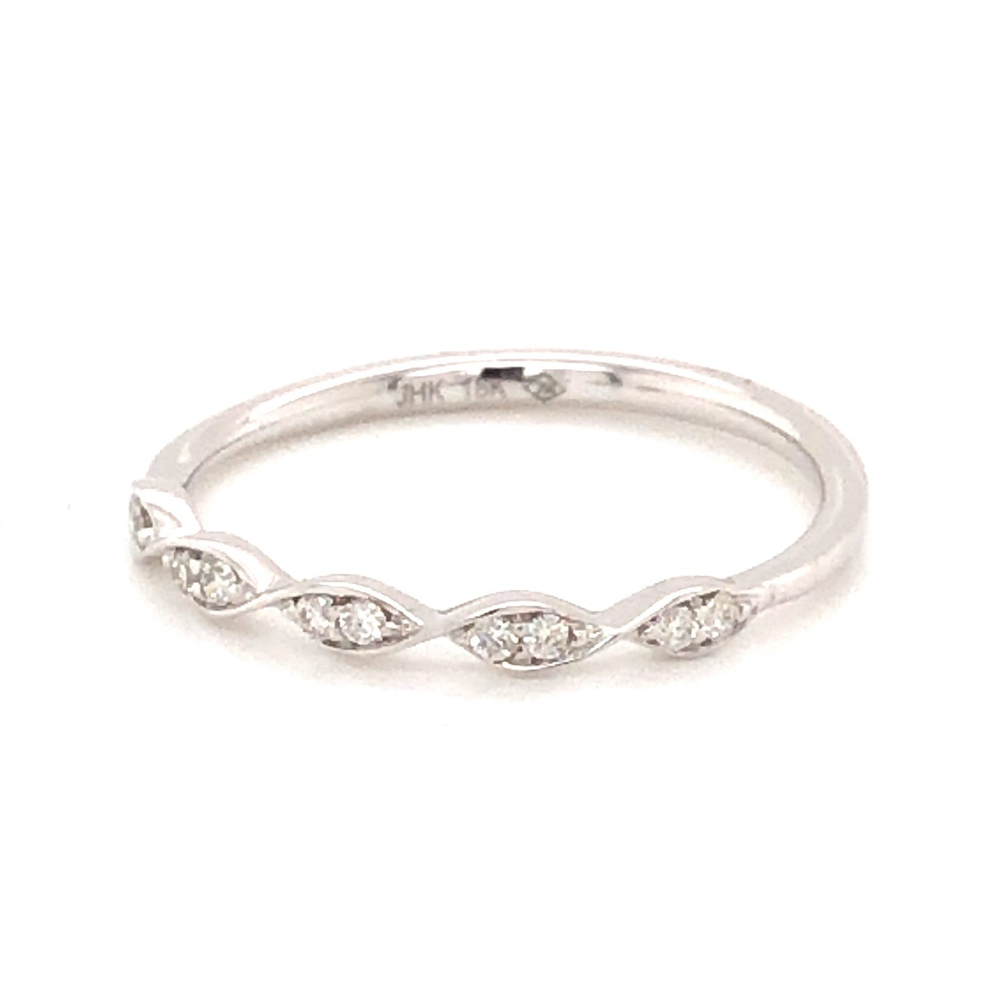 .08 Round Brilliant Diamond Wedding Band in 18k White Gold. This modern wedding band features .08 carats of diamonds in dazzling 18k white gold. Ten (10) .008 carat diamonds are bead set on a slender band. The white gold, half-eternity style ring has a wavy design that adds structure to the brilliant diamonds. This wedding band will look absolutely beautiful paired with any engagement ring or can be stacked on the right hand for a more contemporary, fashionable look!