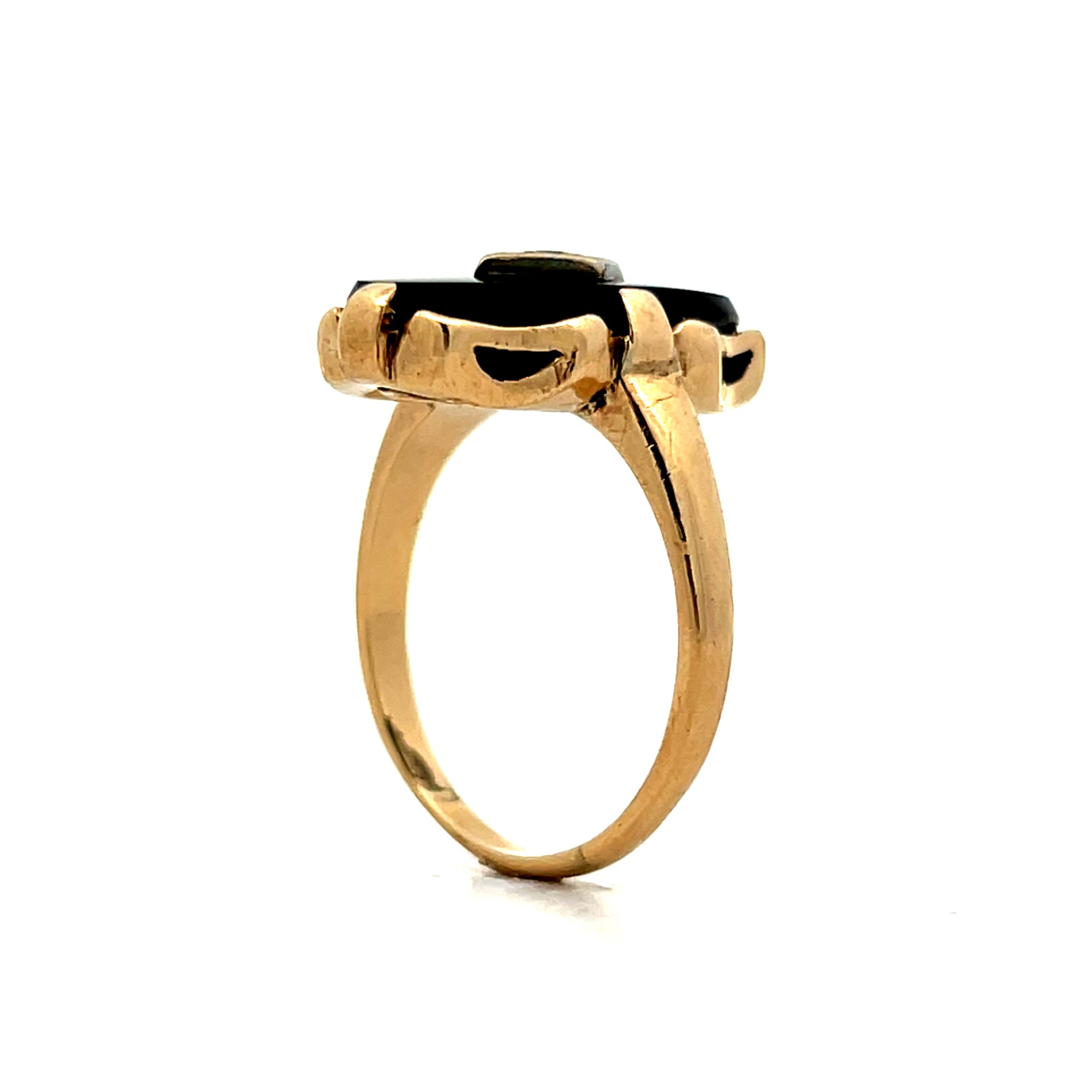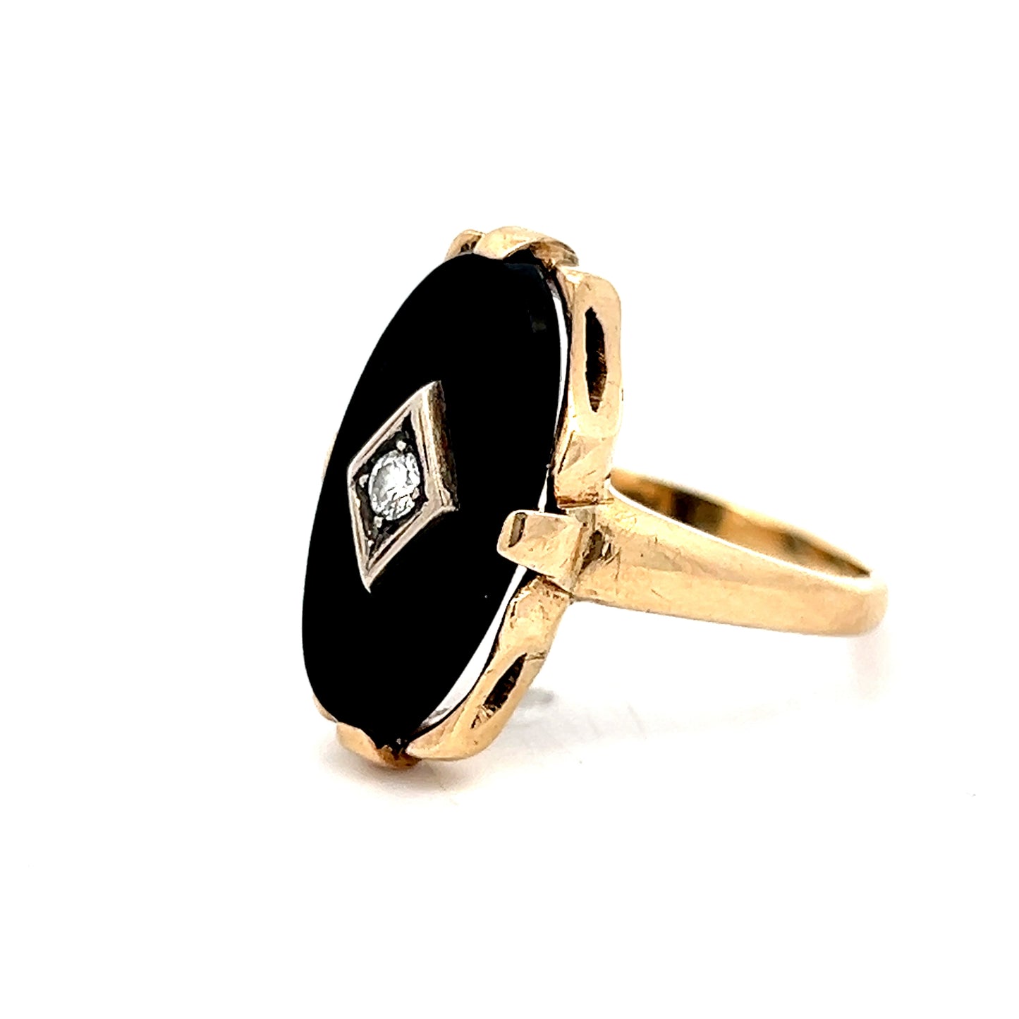 The combination of the warm yellow gold, deep black onyx, and sparkling diamond creates a bold look that references the distinctive design style of the Art Deco period. Despite its historical roots, this ring works well as a modern accessory with its strong visual appeal and styling.