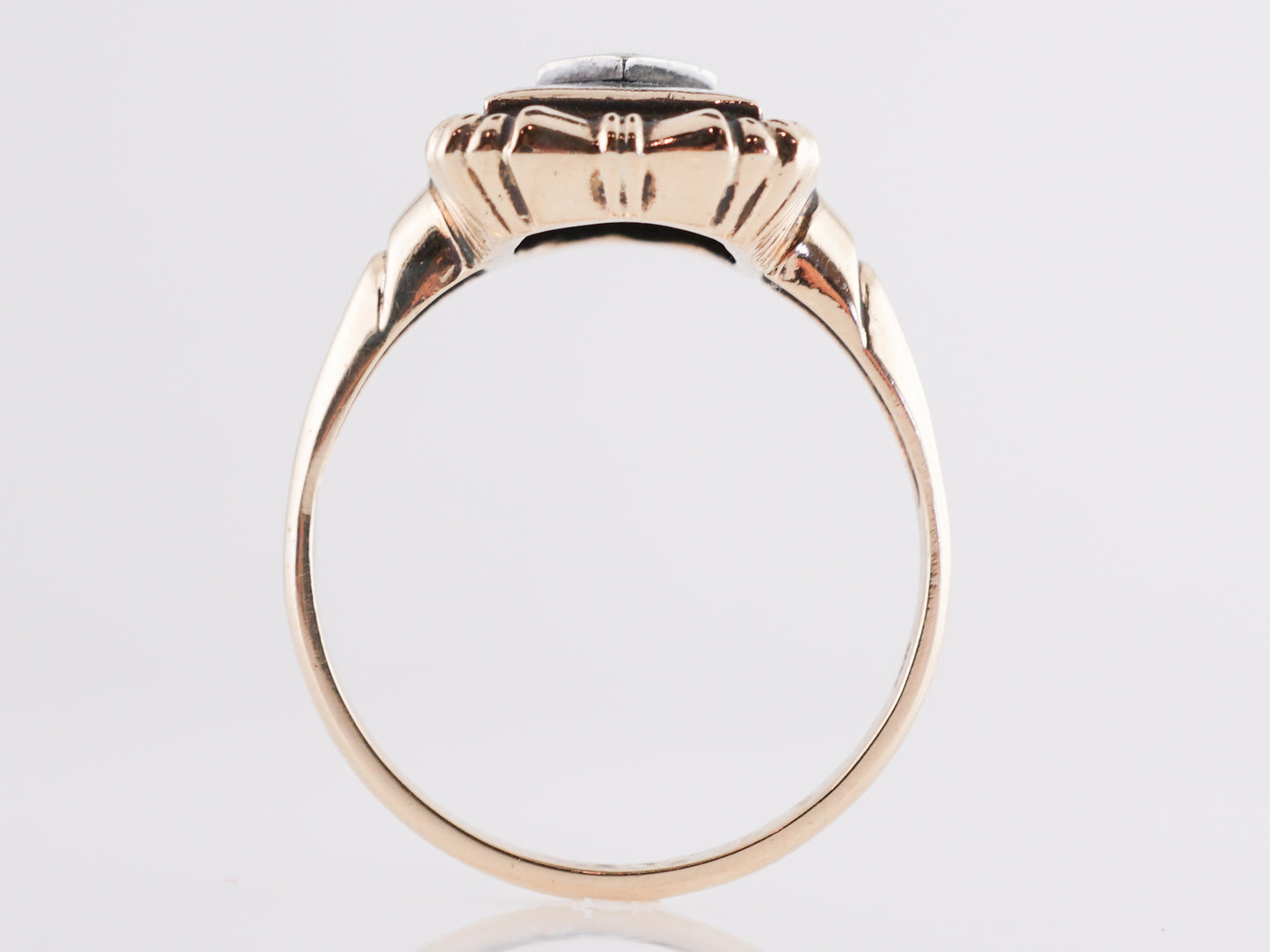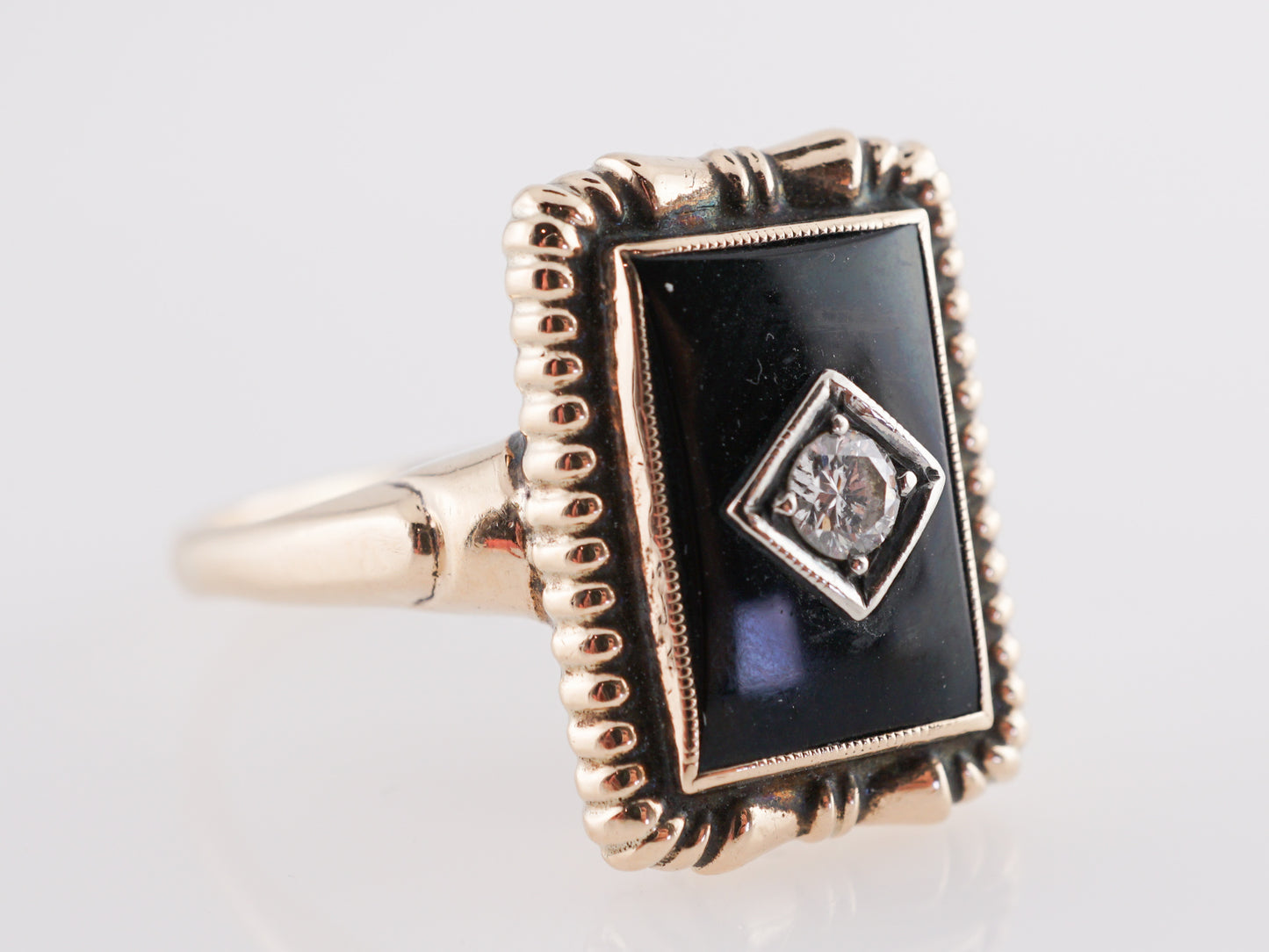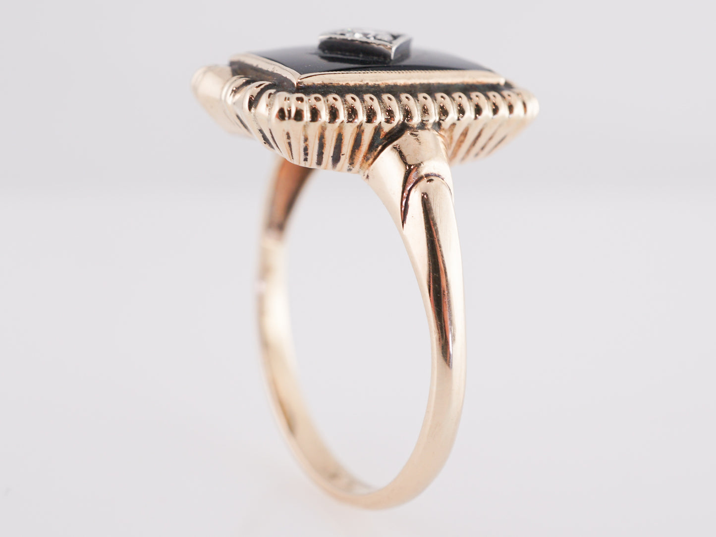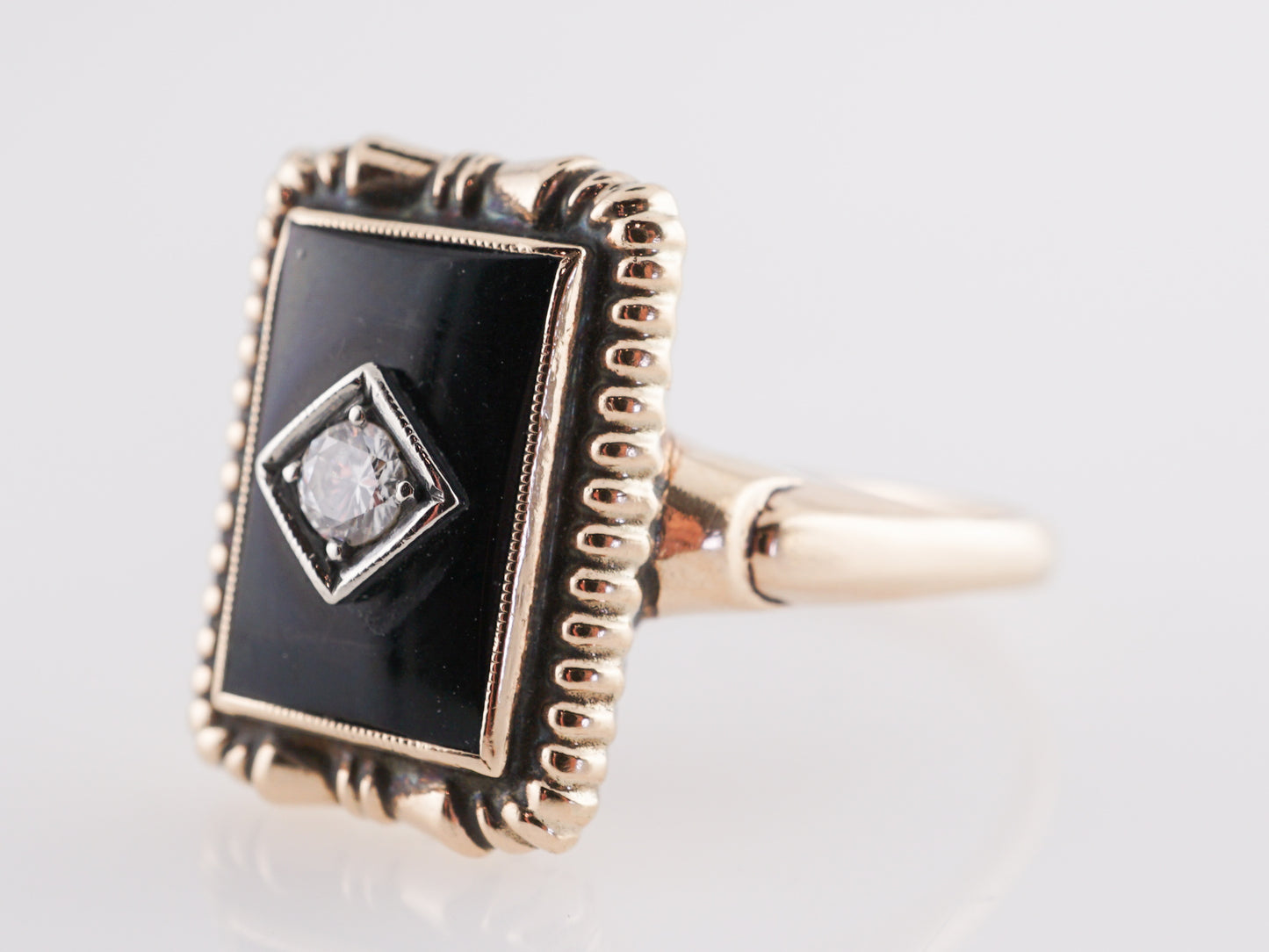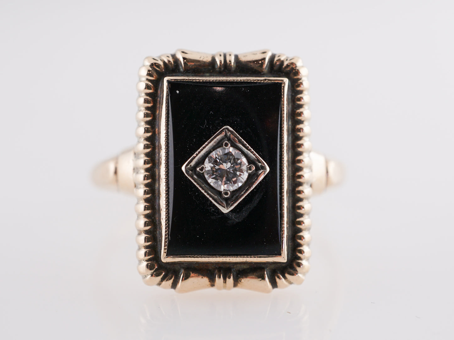 .09 Art Deco Diamond Onyx Cocktail Ring 14k Yellow Gold. This vintage late Art Deco onyx and diamond ring features a .09 carat old European cut diamond inlayed into the center of the onyx. The diamond is flush set with bead style prongs and a decorative diamond shaped bezel in white gold. The high polish onyx is set in a 14 karat yellow gold bezel. Surround the onyx is 14 karat yellow gold ornamental details giving the ring its Art Deco flare.