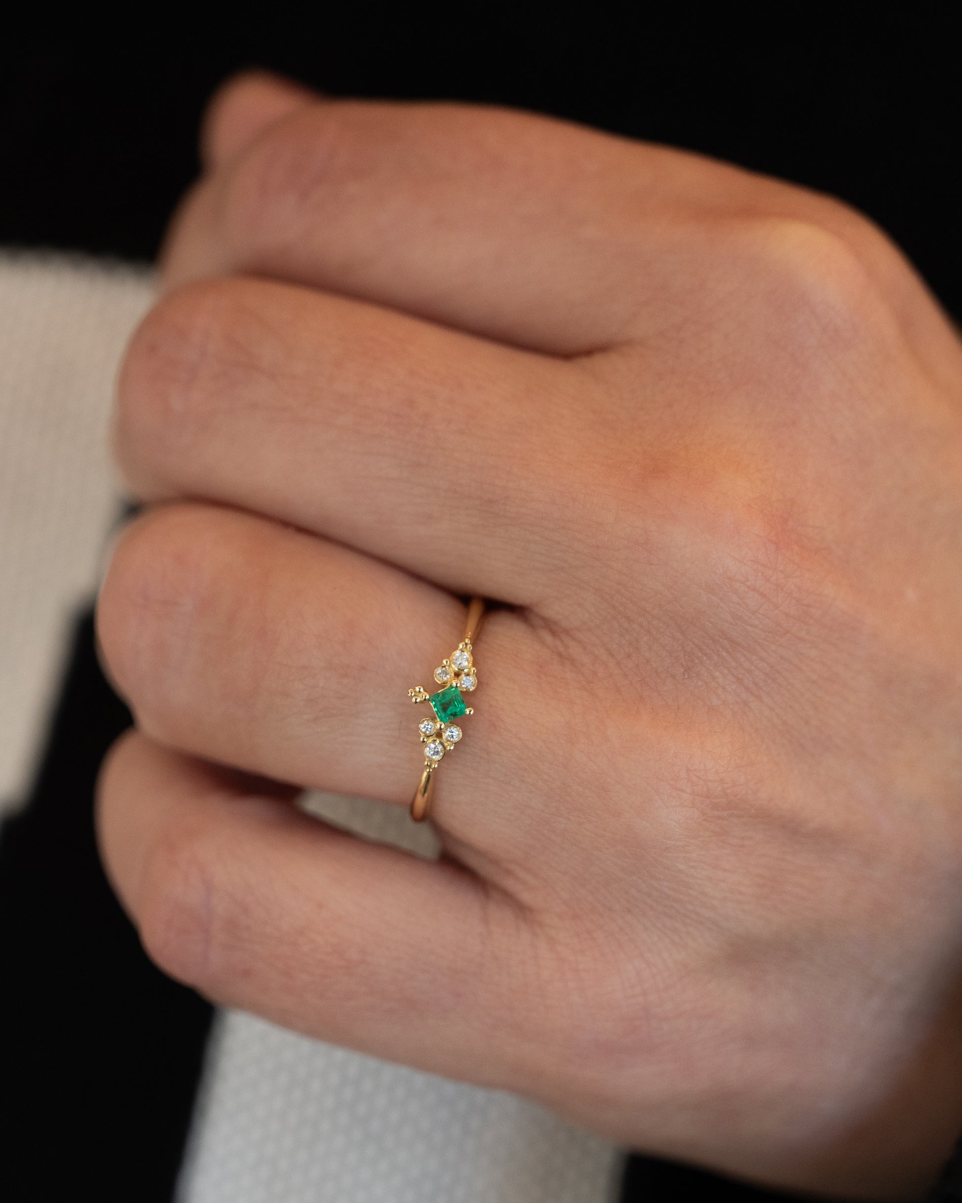 This 18 karat yellow gold cluster stacking ring features a .09 carat square cut emerald at the center, surrounded by six round brilliant cut diamonds in a cluster arrangement. Each diamond measures 1.15mm and weighs .0067 carats, bringing the total diamond weight to .04 carats. The emerald's green color contrasts with the white diamonds and yellow gold setting. The thin band makes this ring suitable for stacking with other rings or wearing on its own.