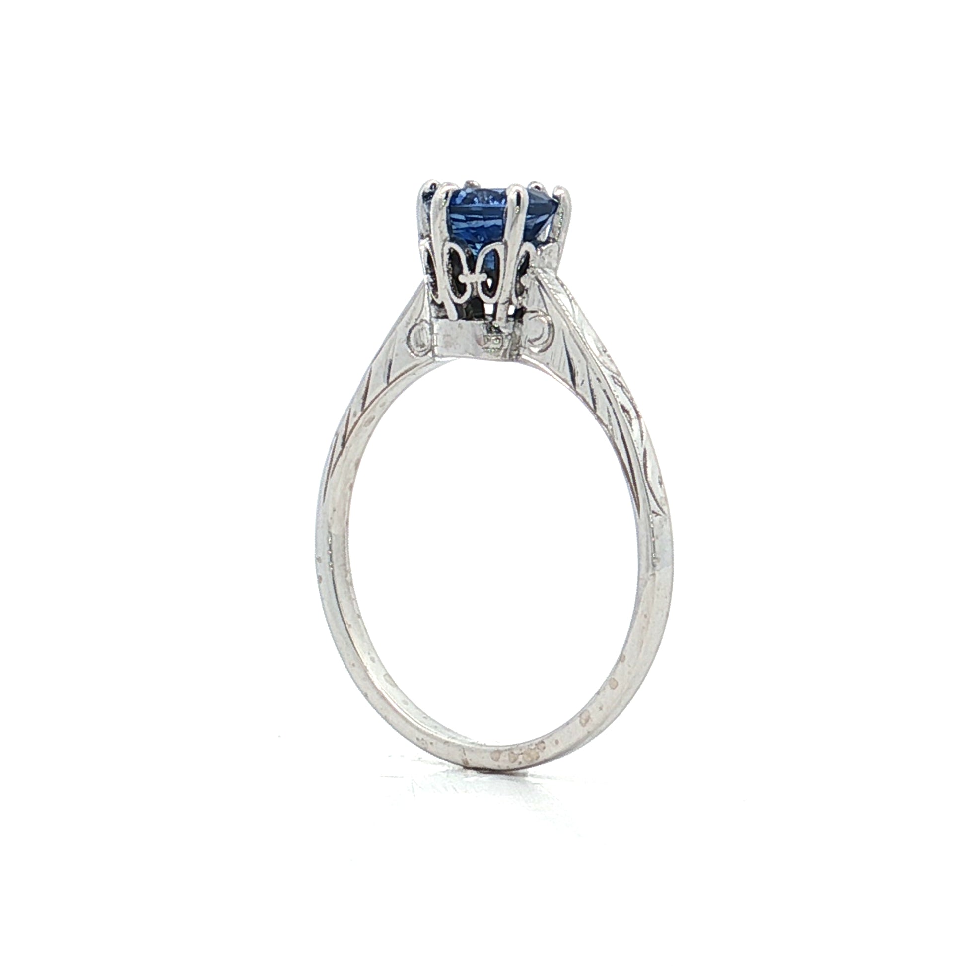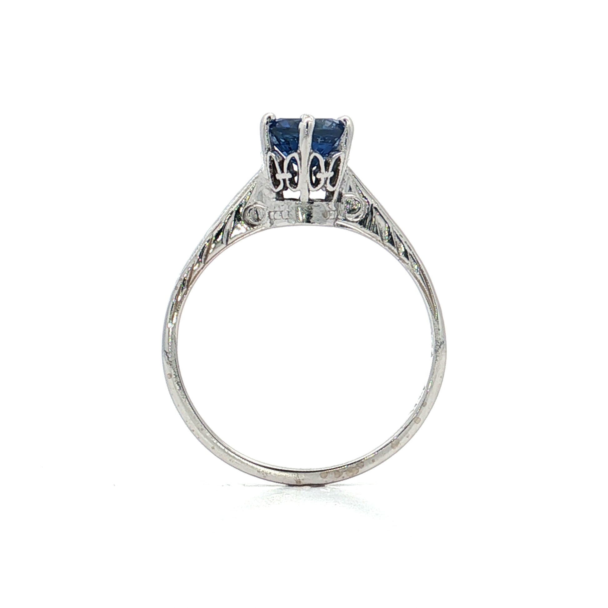 This Art Deco era engagement ring features a 1.00 carat round brilliant cut blue sapphire in a six-prong setting made from 14 karat white gold. The deep blue sapphire takes center stage in this solitaire design, while the band displays intricate engraving typical of the Art Deco period. The white gold setting provides a cool backdrop that highlights the sapphire's rich color. The engraved metalwork adds decorative elements that reflect the artistic style of the 1920s and 1930s.
