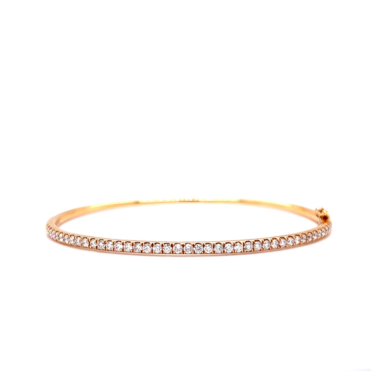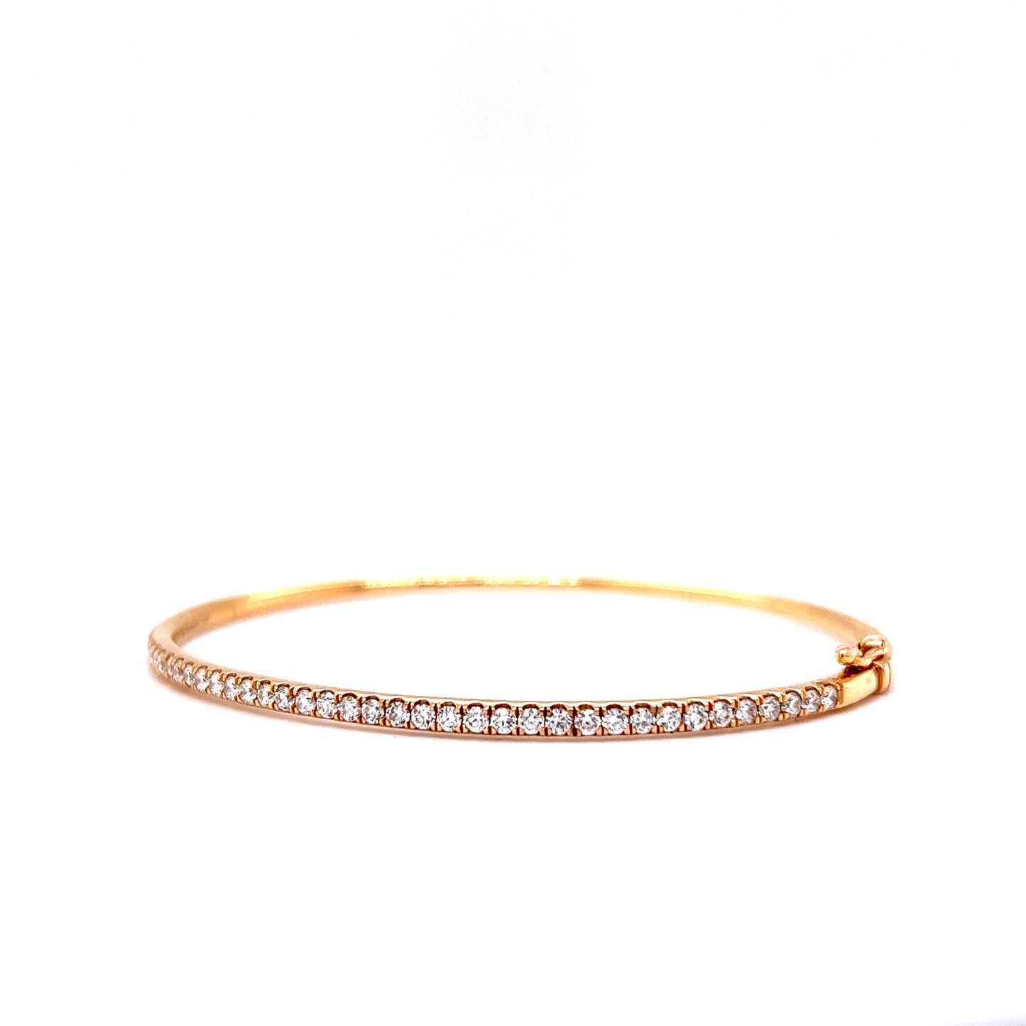 1.00 Carat Diamond Bangle Bracelet in 18k Yellow Gold. This brilliant, modern bangle features 1.00 carat of natural diamonds in 18k yellow gold. Forty-one .024 carat round cut diamonds are mounted on the front half the bracelet. The polished 18k yellow gold adds a bit of warmth to the near-colorless diamonds. Connected by a classic bracelet catch, this piece is a true beauty!
