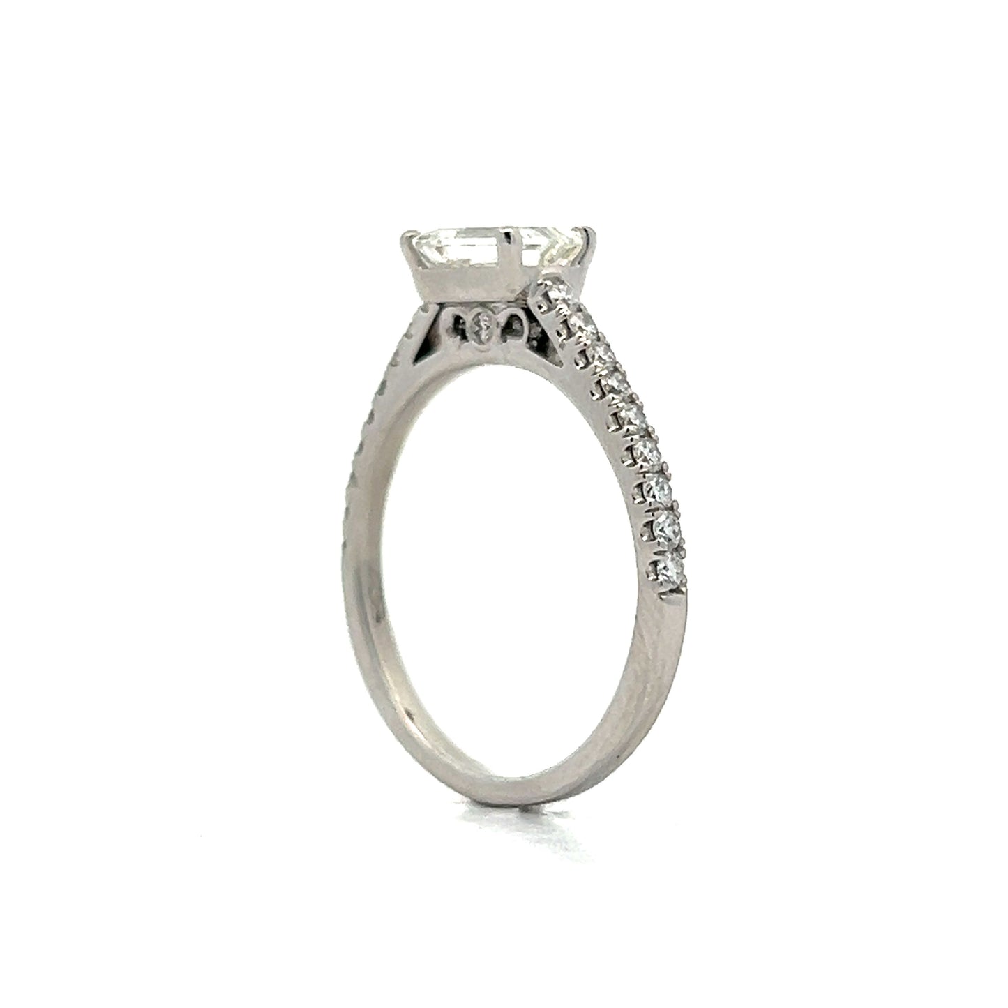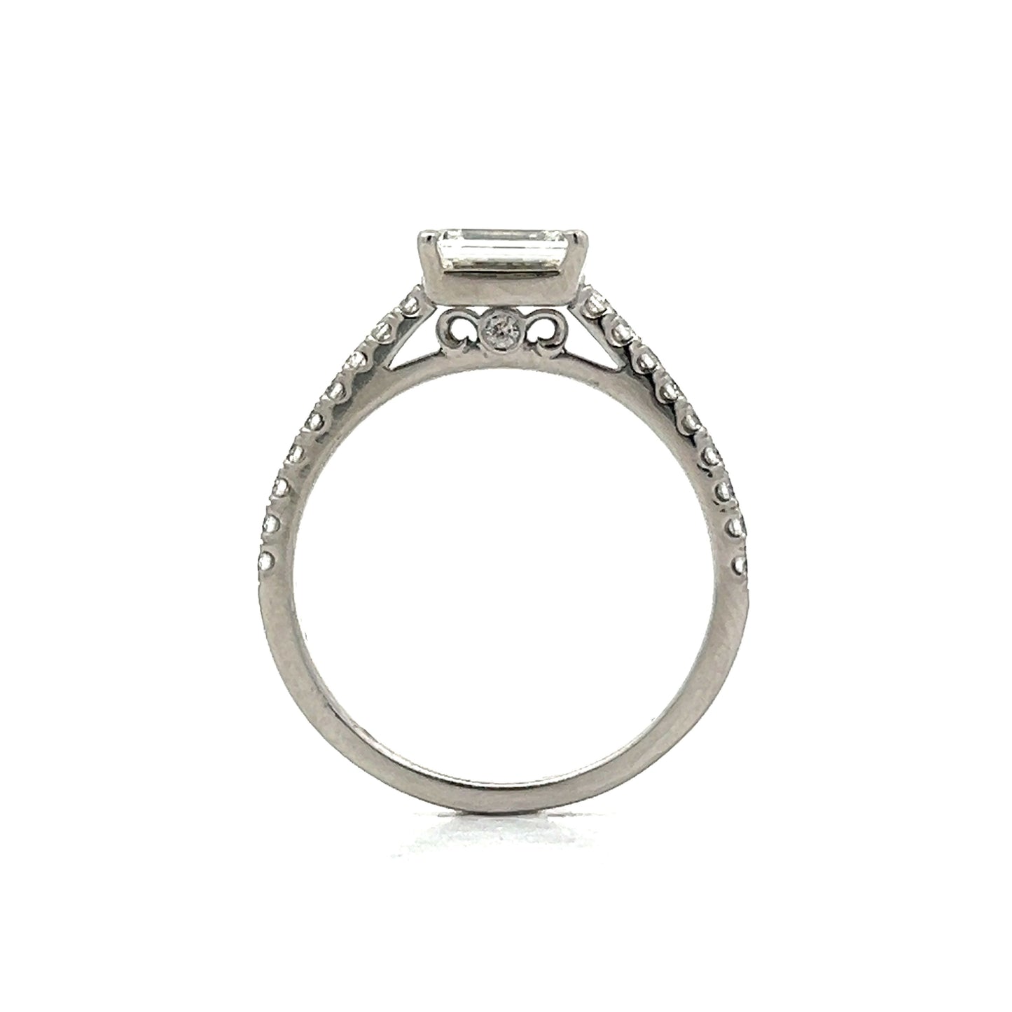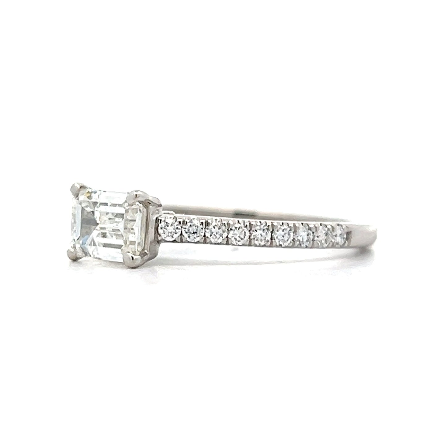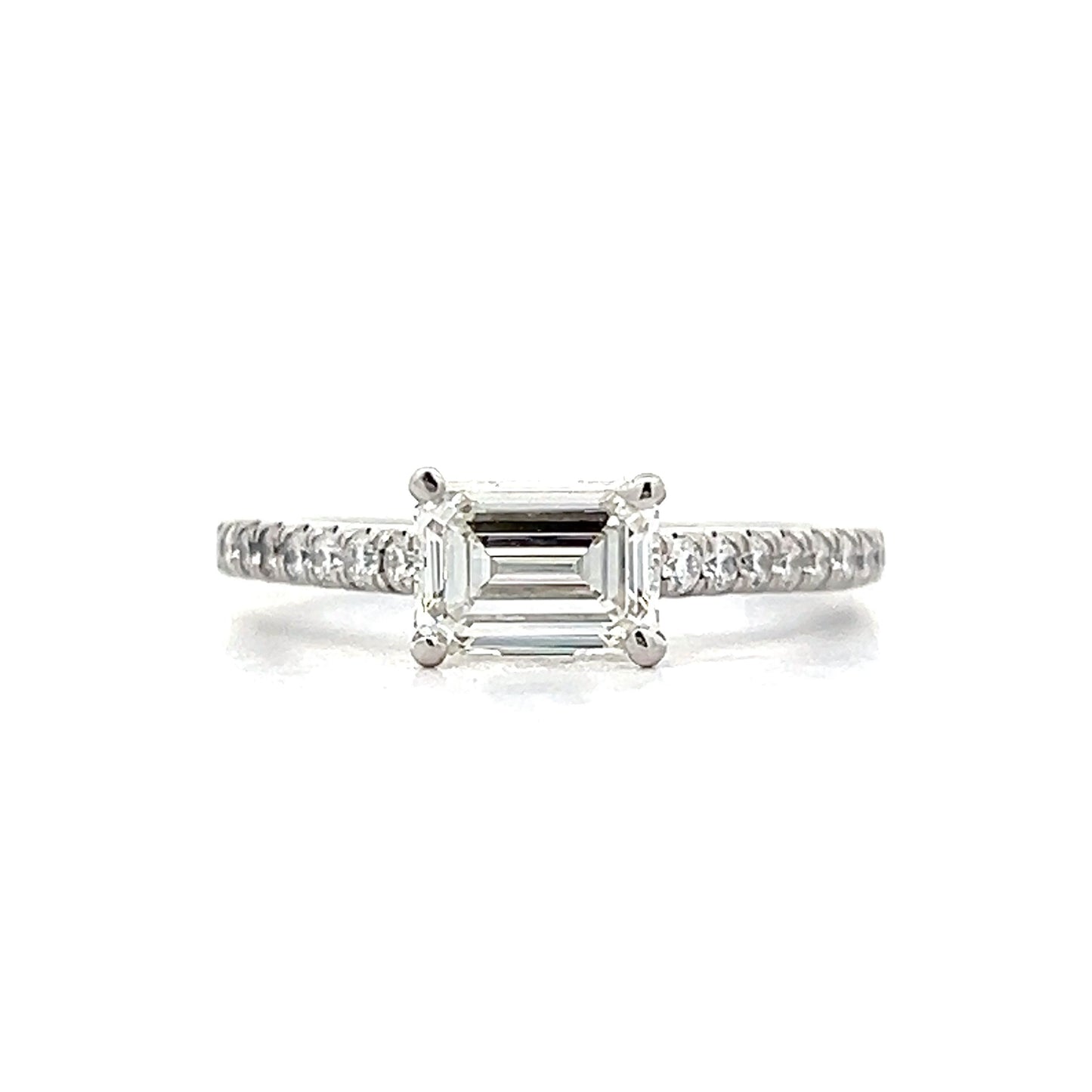 This engagement ring seamlessly blends modern design with classic appeal. At its heart is a 1.00 carat emerald cut diamond, featuring VS2 clarity and H color, set in an east-west orientation and securely held by four prongs. The polished 14 karat white gold band is adorned with 20 round brilliant cut diamonds in a pave setting, each weighing .018 carats and measuring 1.6 mm, contributing a total of .36 carats to the ring's overall sparkle. This elegant ring is an ideal choice if your looking for a modern, yet unique engagement ring.