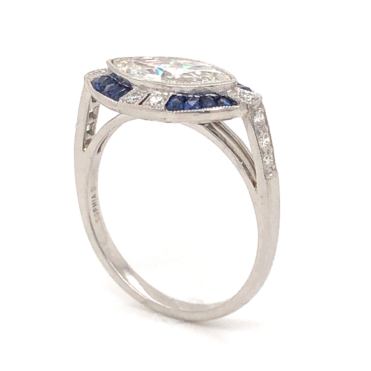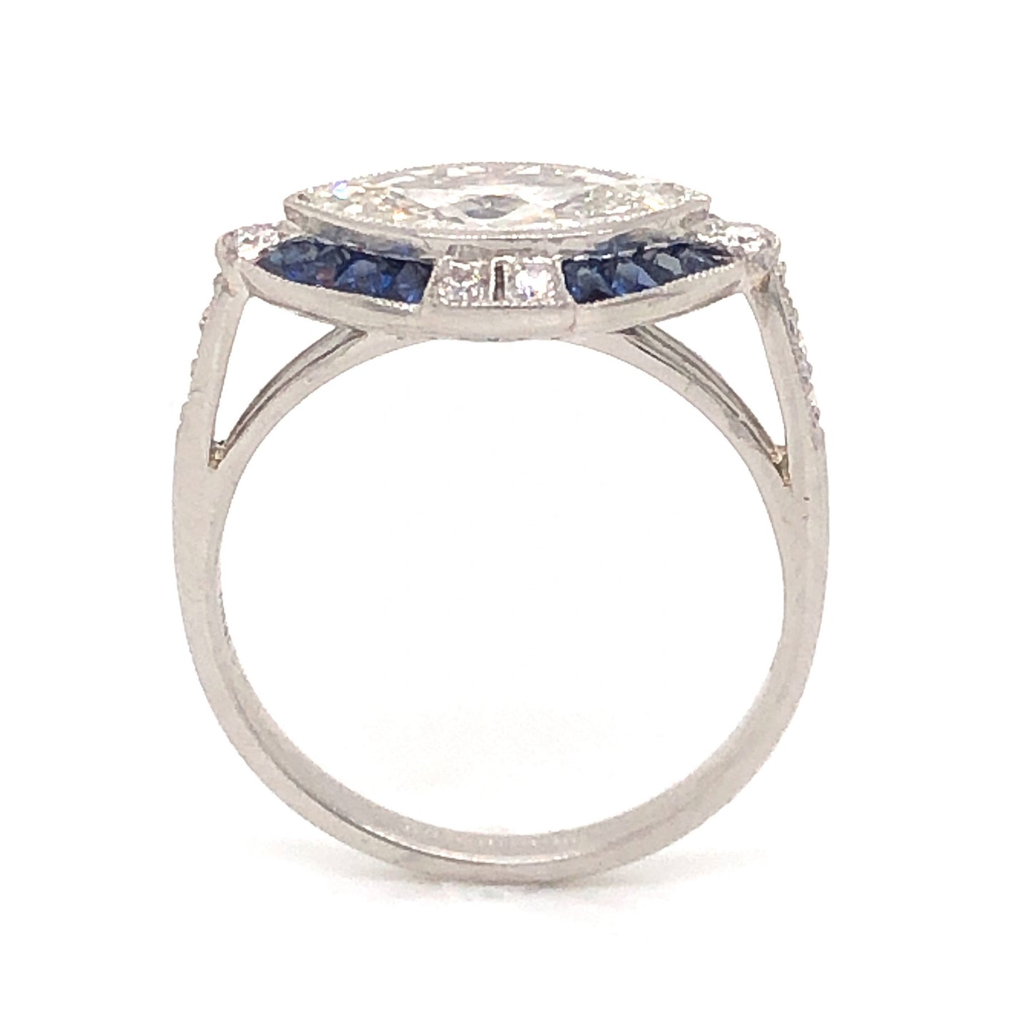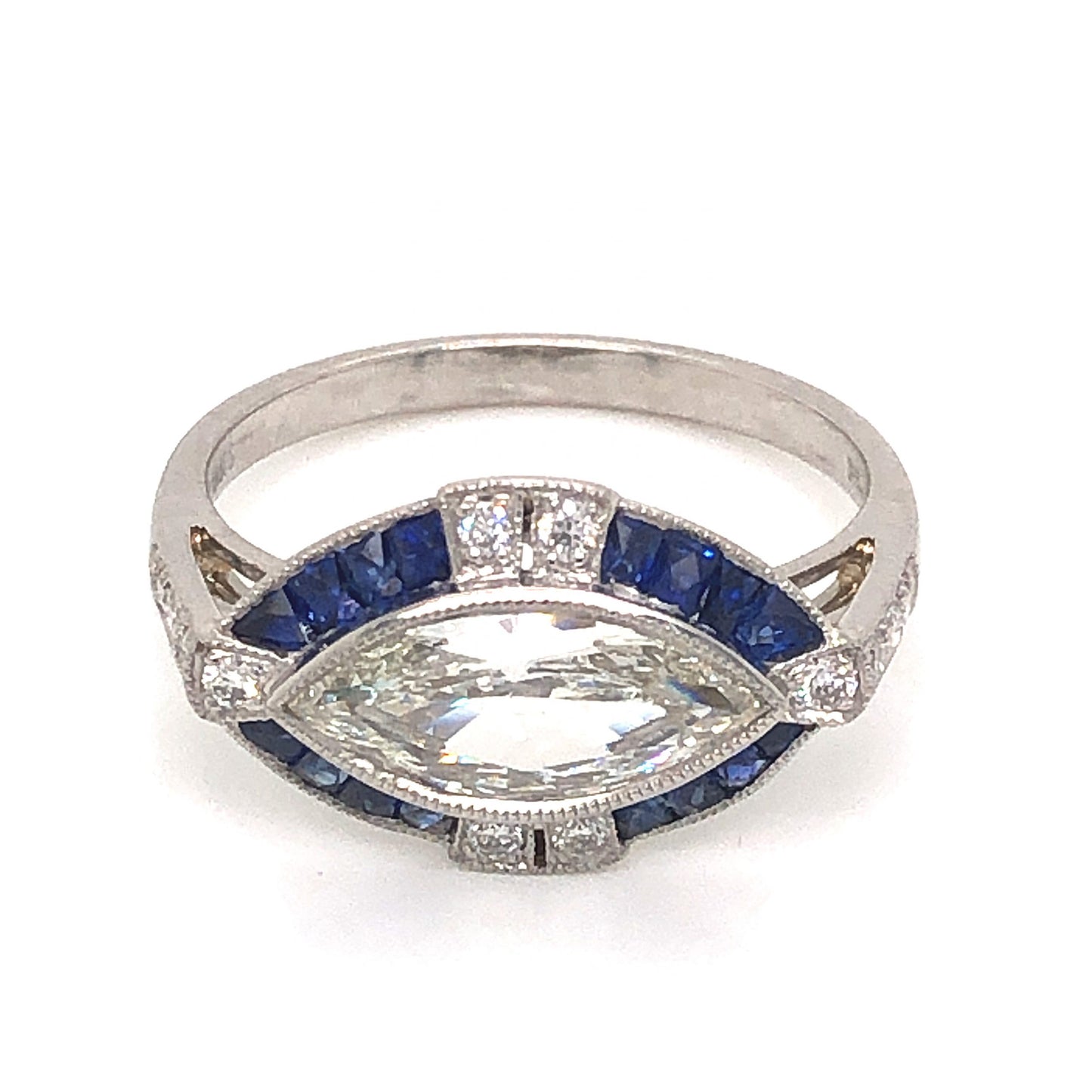 1.00 Marquise Cut Diamond Sapphire Ring in Platinum. This lovely engagement ring features 1.12 carats of diamonds and .64 carats of blue sapphires finished in shimmering platinum. The center stone is a 1.00 carat marquise cut diamond. The center diamond has a soft warm hue and a classic marquise pointed oval shape. The bezel setting of the primary stones features a fine milgrain engravings. The center diamond is accented by sixteen (16) .04 carat dark blue sapphires. An additional twelve (12) .01 carat diamonds are set in pairs at the top and bottom of the head of the ring and along the shoulders of the band. From the profile, a sleek cathedral setting supports the stones on a polished platinum band.