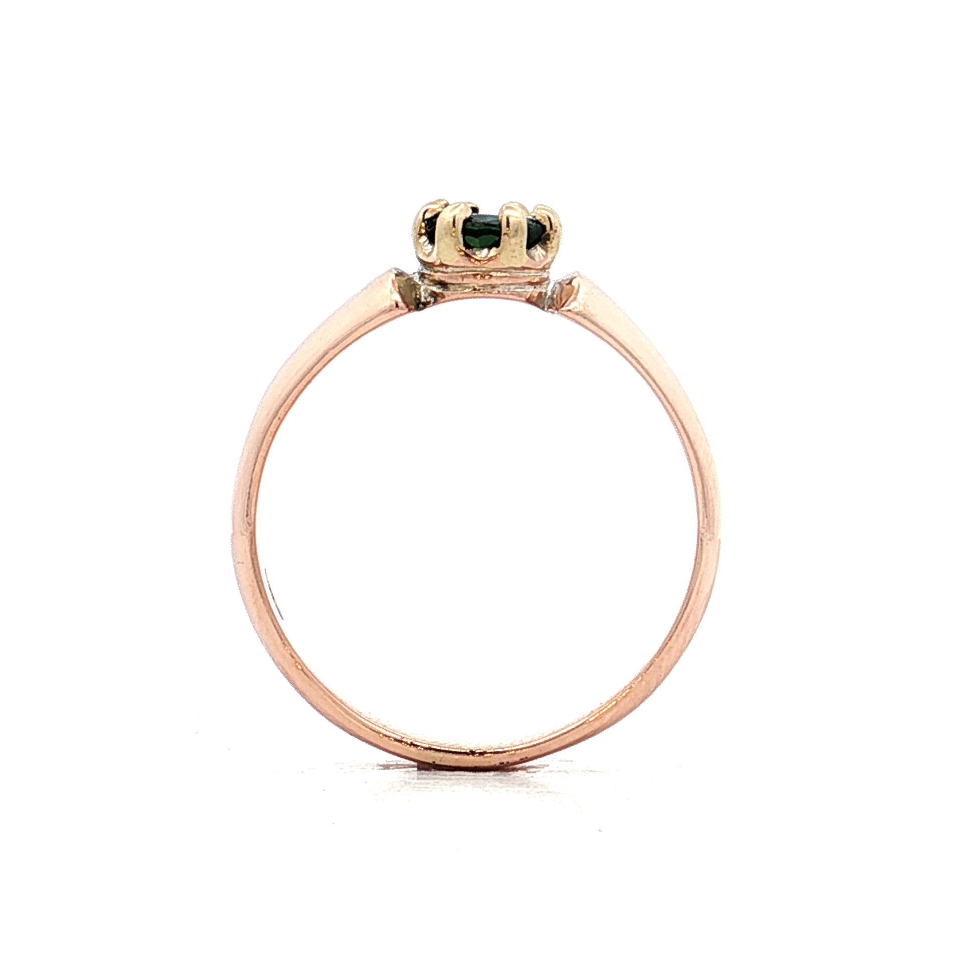 Eight prongs provide extra security for the stone while creating a decorative starburst pattern when viewed from above, a detail typical of Victorian-era settings. The tapered band narrows as it approaches the setting, drawing focus to the center stone and making the ring comfortable for daily wear. The 9 karat rose gold has a softer, more coppery pink tone than higher karat rose gold due to its higher copper content.