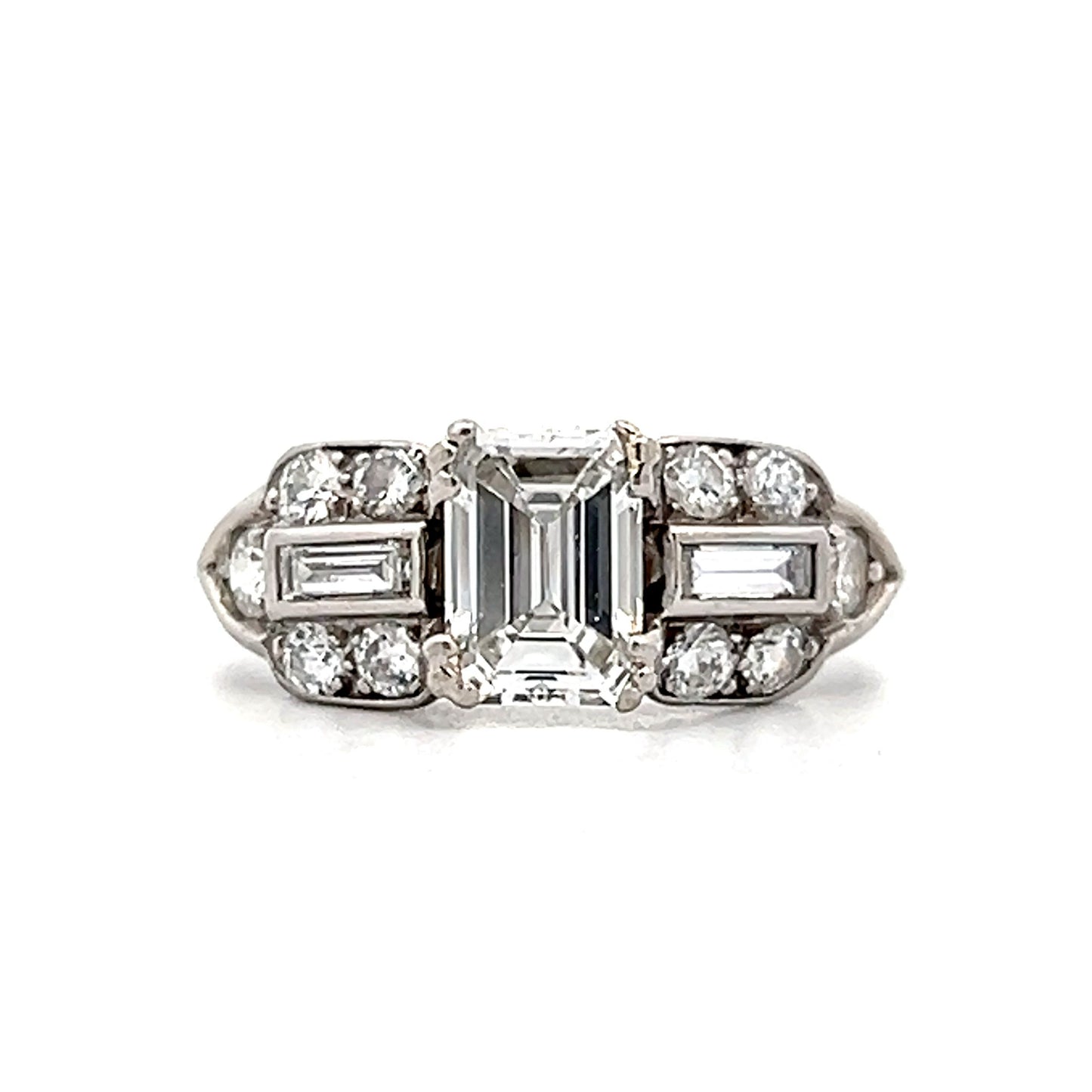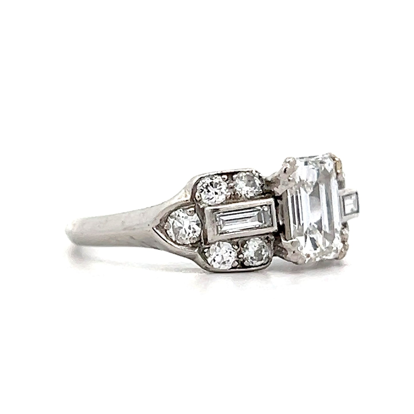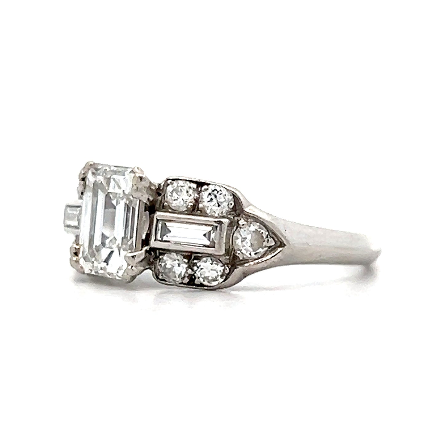 This gorgeous engagement ring is from the Art Deco period and is a masterpiece of sparkle. The center diamond is a GIA certified 1.01 carat emerald cut with an F color and VVS2 clarity. The exquisite diamond is accented by bezel set baguette cut diamonds and ten round single cut diamonds. This ring the perfect embodiment of 1930's Art Deco geometric design, with its straight lines yet soft curves giving it a feminine touch. Finished in platinum, this ring is low profile and easy to wear and will pair will with a wedding band or stack of bands.