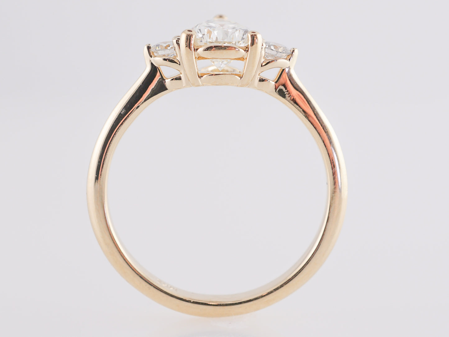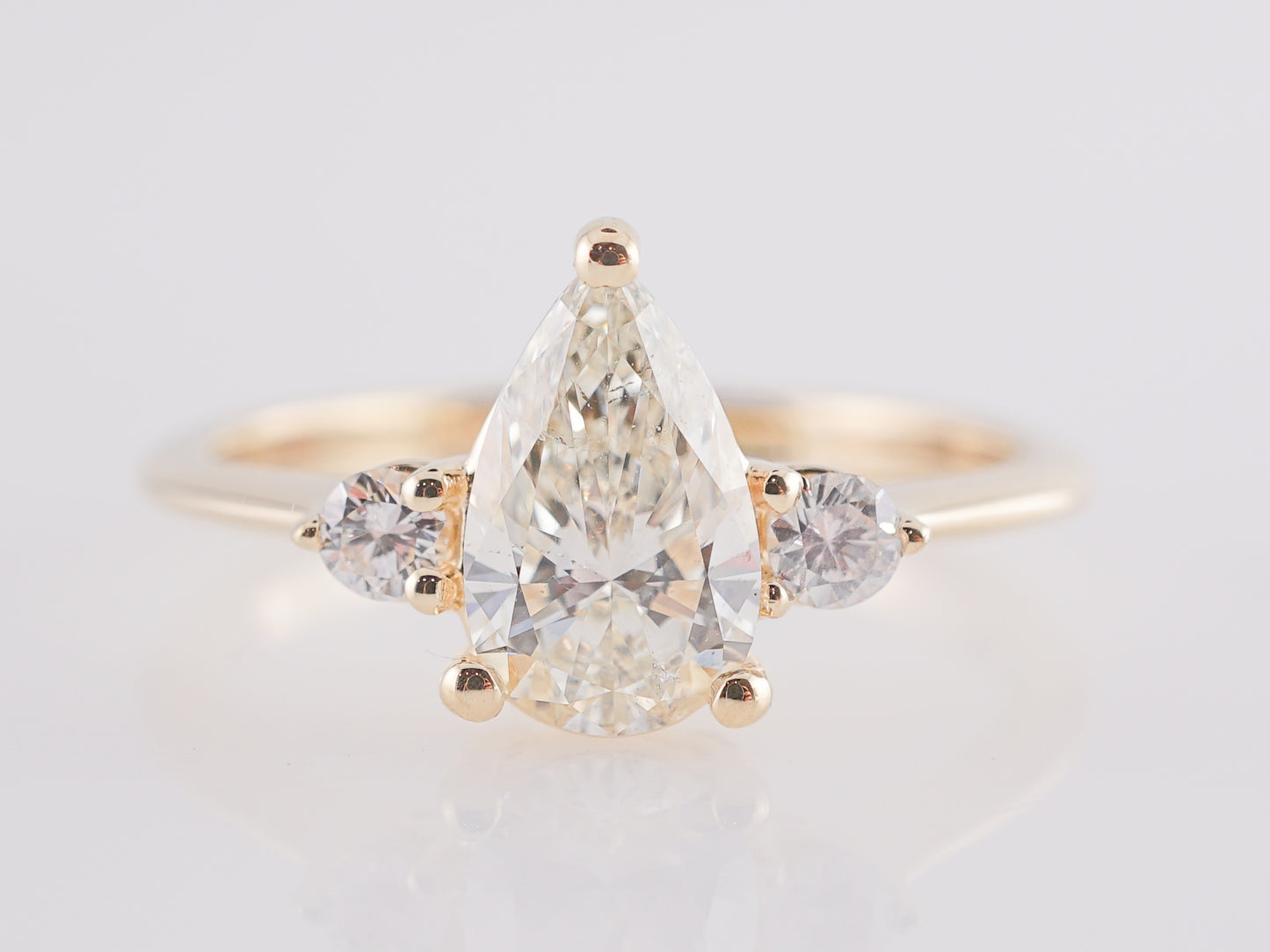 1.01 Carat GIA Pear Cut Diamond Engagement Ring in 14k. This GIA certified pear shape diamond is beautifully set in a custom 14 karat yellow gold mounting. The center 1.01 carat diamond is secured with three (3) prongs and rests in a yellow gold basket. The pear shape is flanked by two (2) round brilliant diamonds prong set with a total side diamond weight of .11 carats. The ring is finished in a high polish.