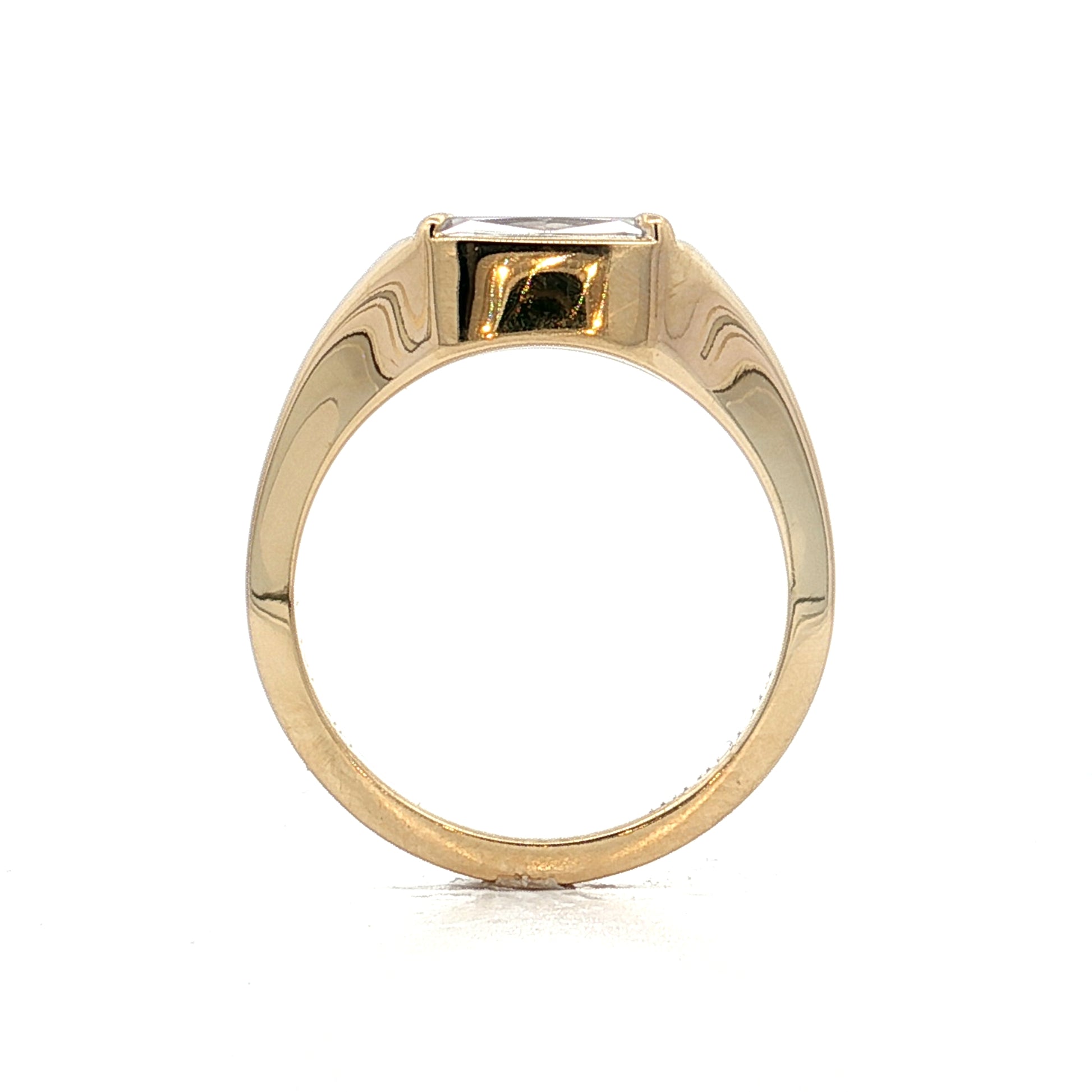 This modern solitaire engagement ring from Filigree features a 1.01 carat cushion step cut diamond set horizontally in 14 karat yellow gold. The cushion step cut creates a geometric, hall-of-mirrors effect with its long rectangular facets instead of the intense sparkle you'd see in a round brilliant. The diamond has J color, which means it shows a subtle warmth that actually pairs well with yellow gold—you'd only spot the tint when comparing it directly to a colorless stone.