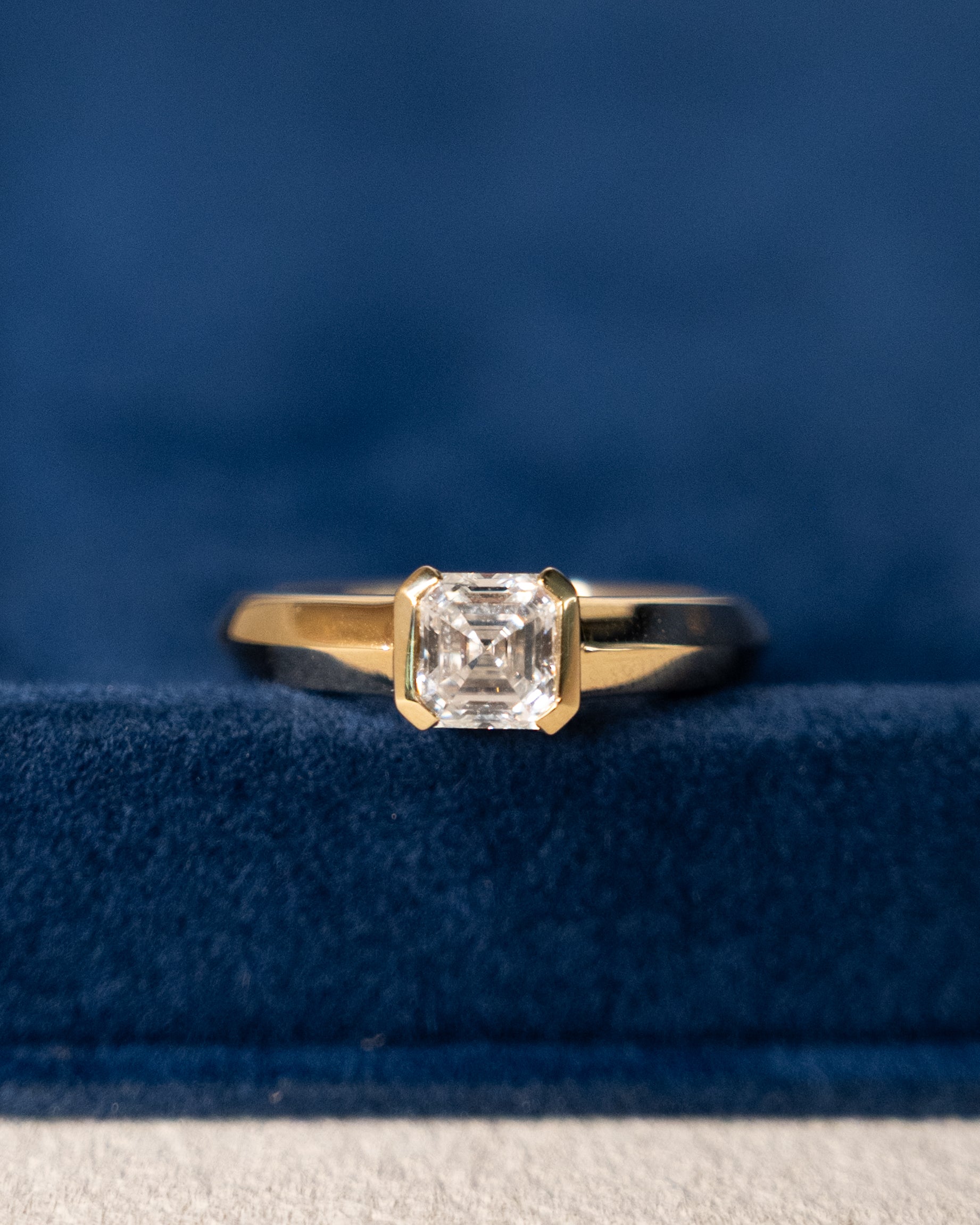 The half bezel setting secures the diamond while maximizing light entry from multiple angles. The band tapers from 3.7mm down to a knife-edge profile, creating dimension and making the ring comfortable for daily wear.