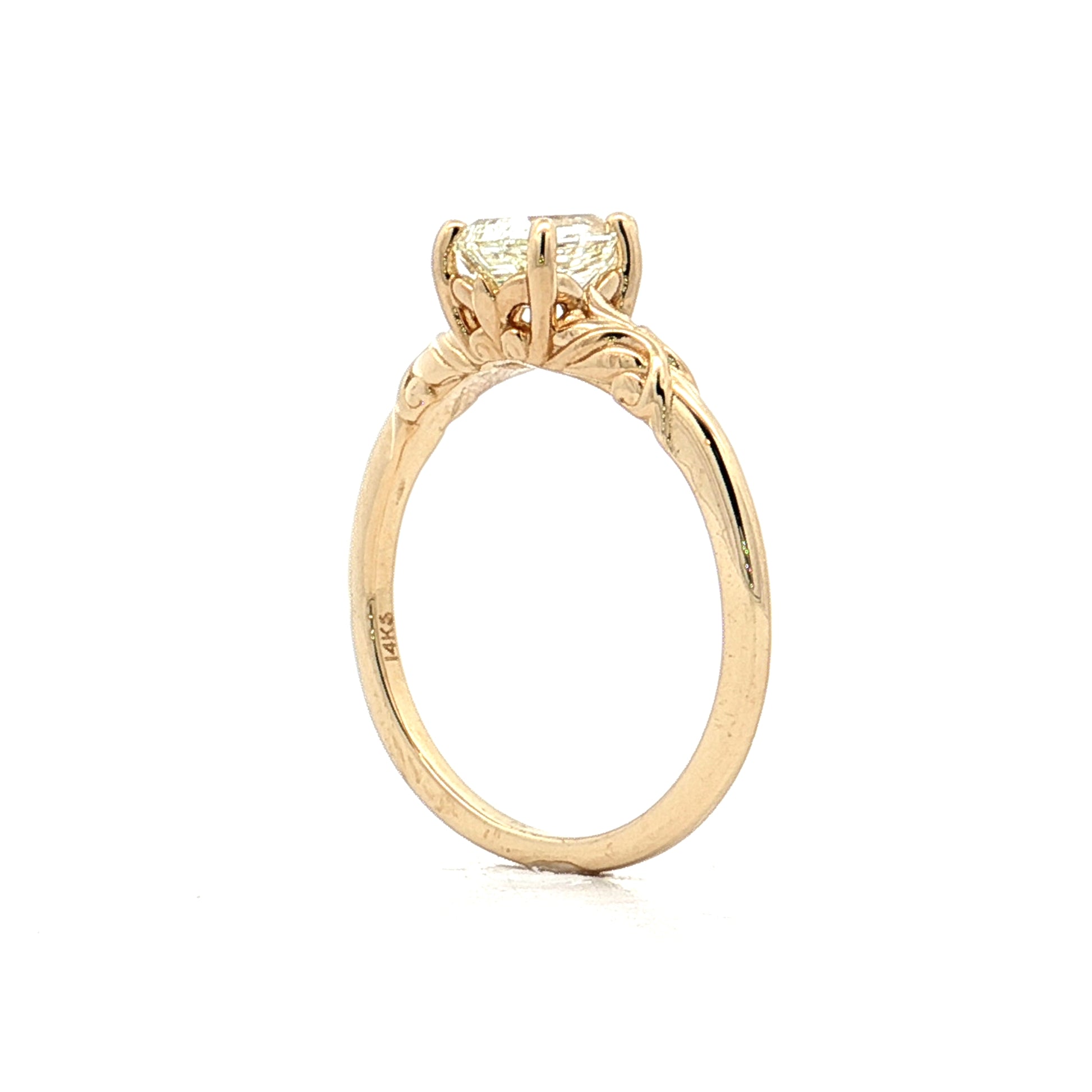 At N color, the diamond has a noticeable yellow-brown tint, though the yellow gold setting helps minimize the contrast by providing a warm-toned backdrop. VVS1 clarity is exceptional—inclusions are extremely difficult to see even under 10x magnification, making this about as clean as diamonds get.