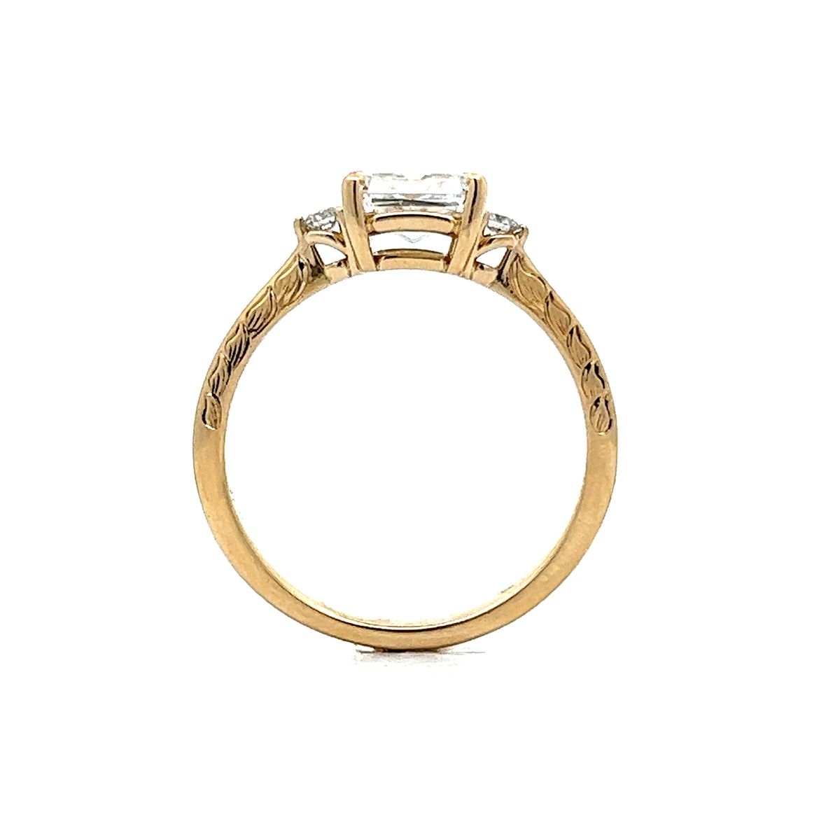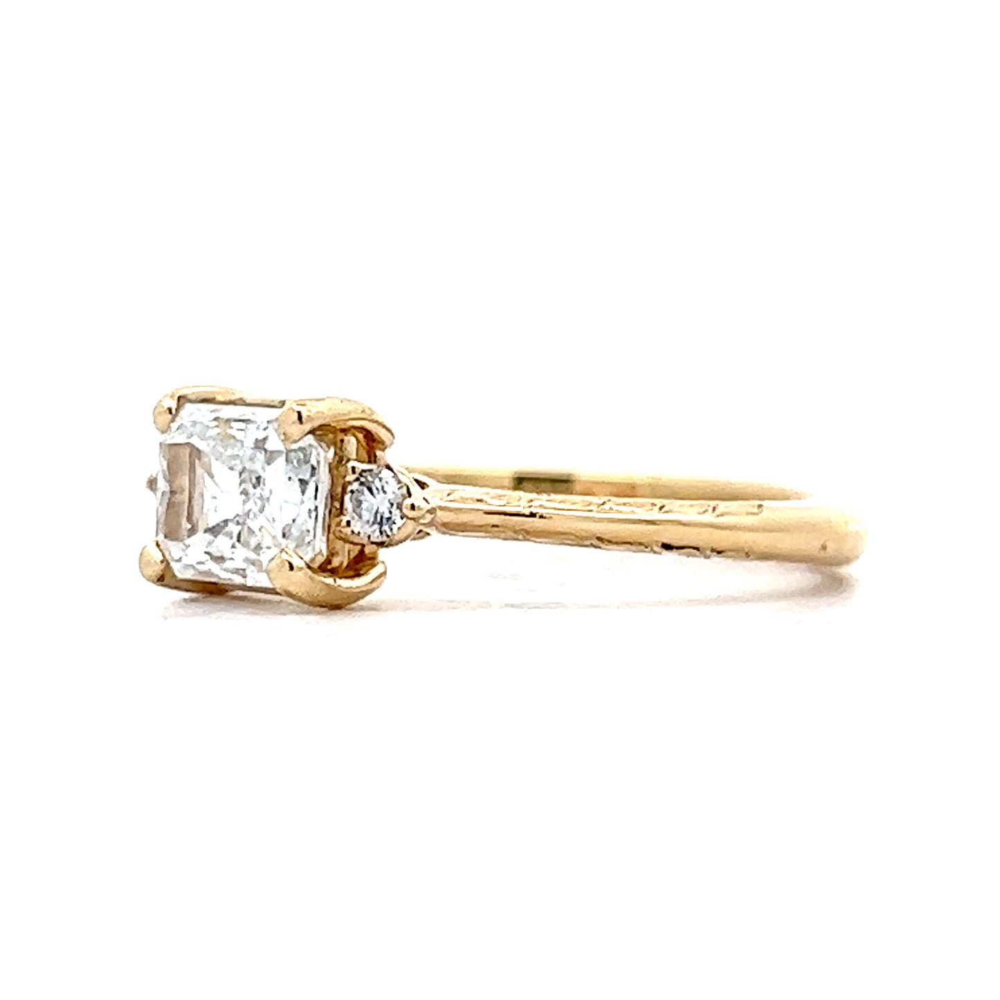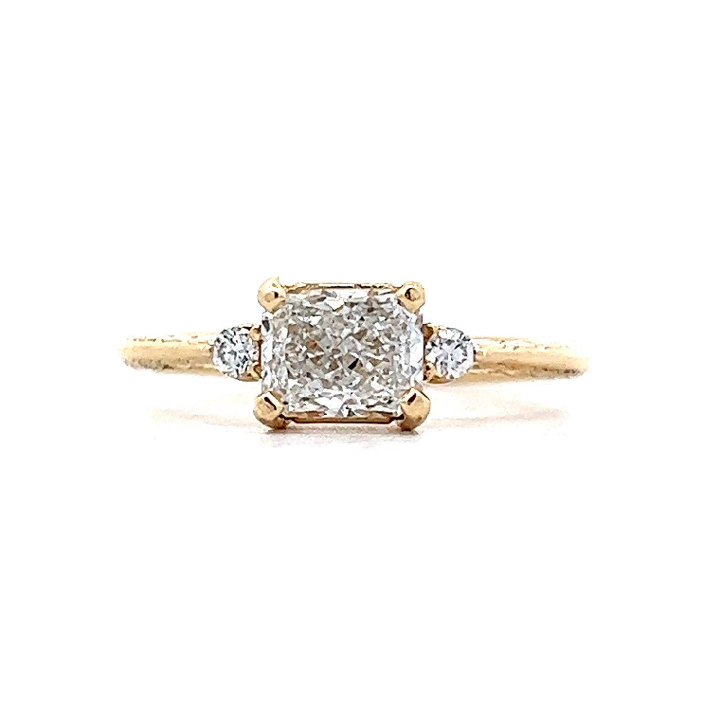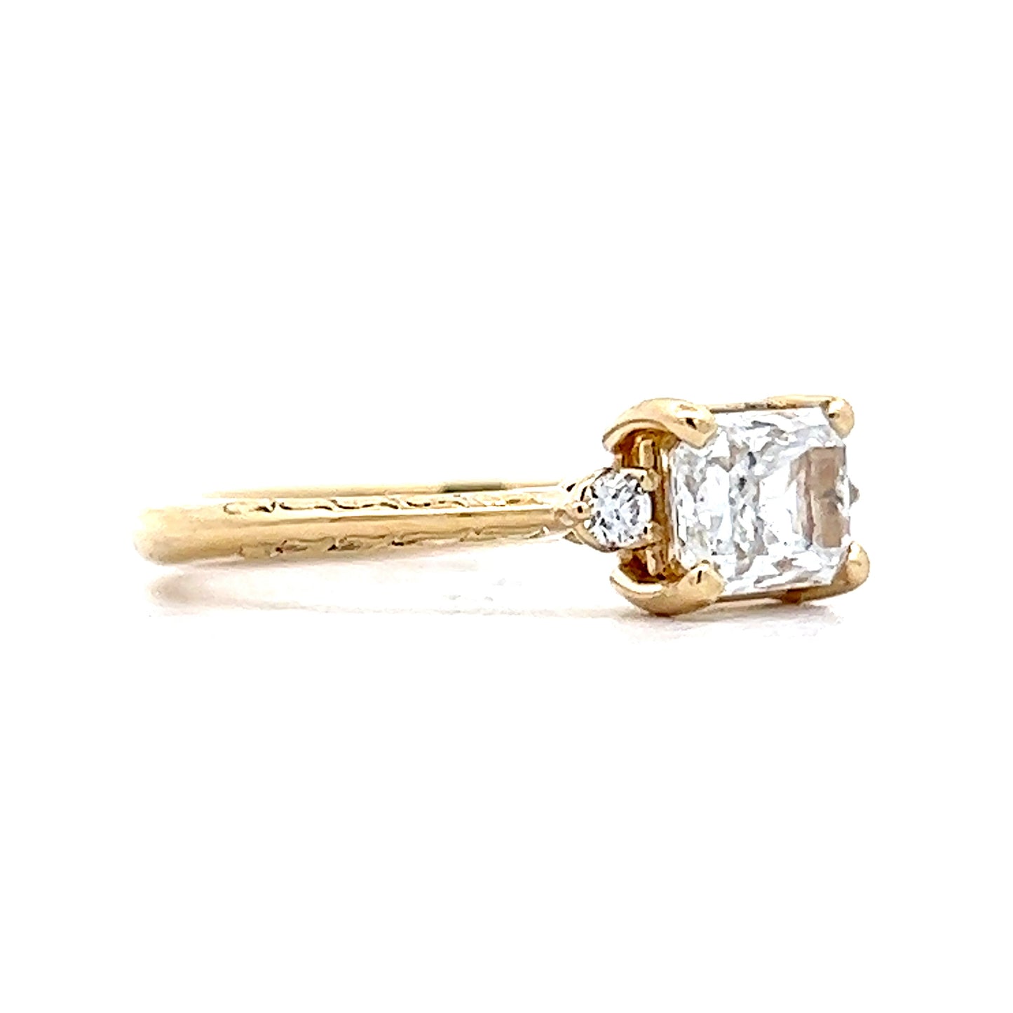 This modern engagement ring blends classic and contemporary design elements. Crafted in 14 karat yellow gold, the engraved band details create gorgeous detail. The center of the ring showcases a GIA certified 1.01 carat radiant cut diamond with a diamond color of E. The diamond is accented by a round brilliant cut diamond on each side.