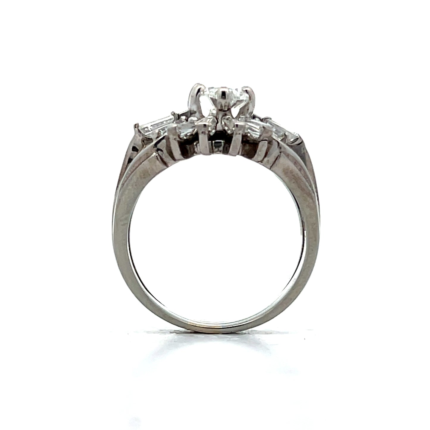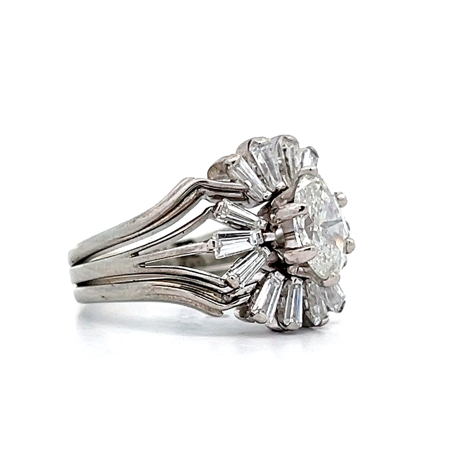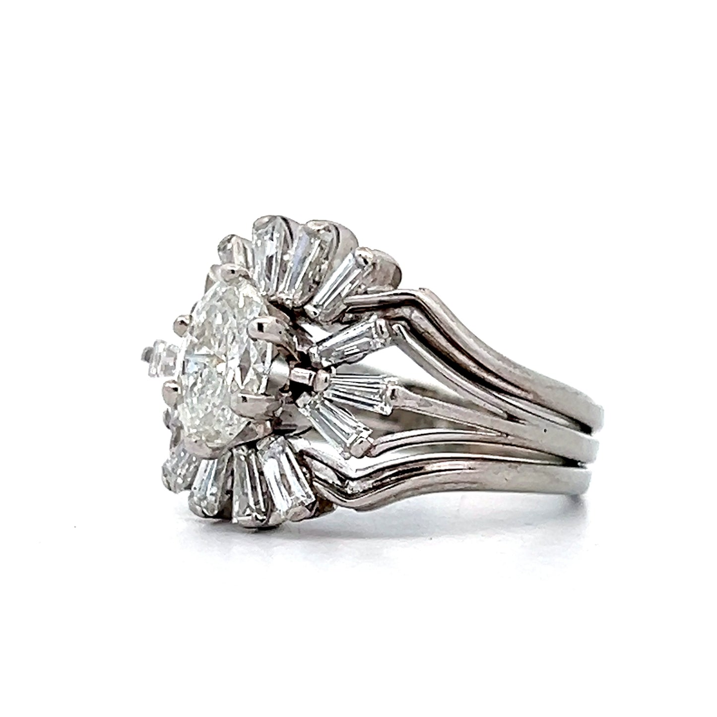 This Mid-Century cocktail ring by Designer Jabel is made of 18 Karat White Gold with a 1.01 carat oval cut diamond (I1 clarity, G color) in the center. The main diamond is surrounded by fourteen tapered baguette diamonds, each 3.75 x 1.75 x 1.25mm and 0.07 carats.