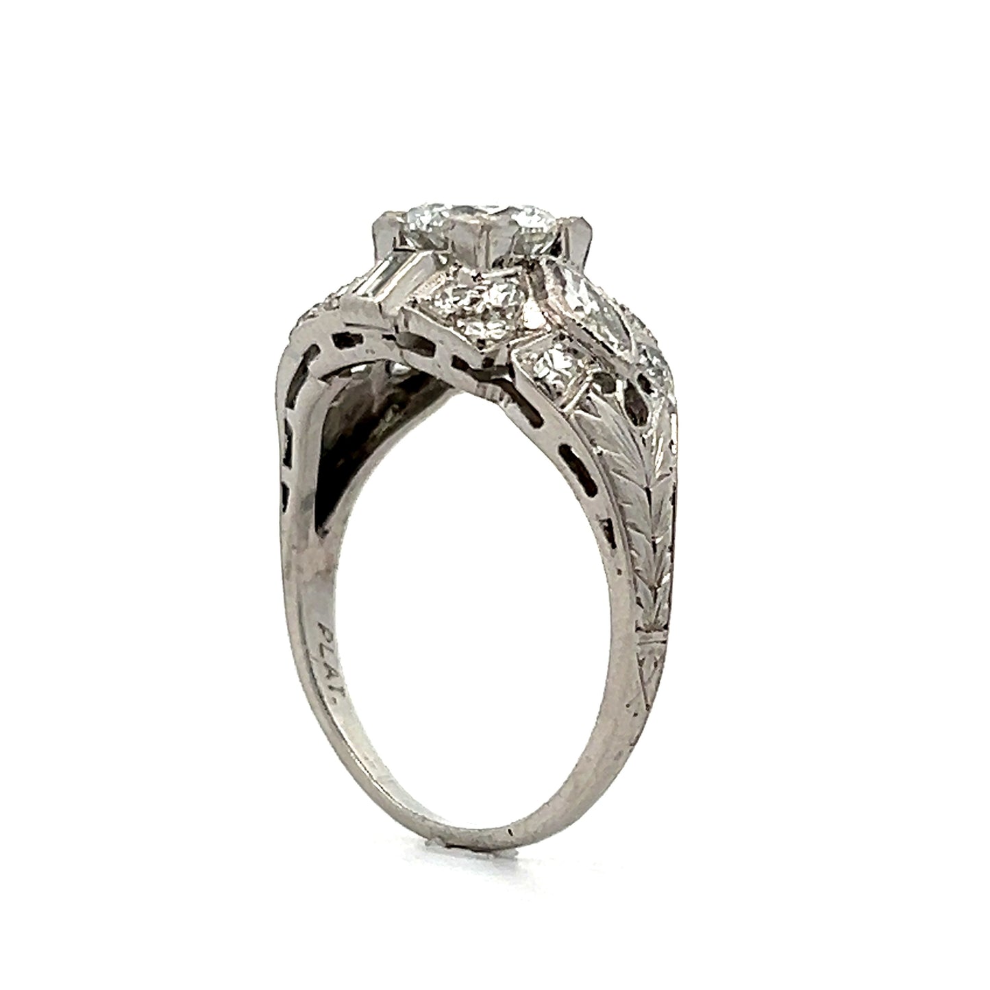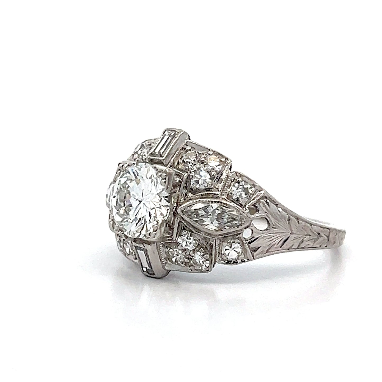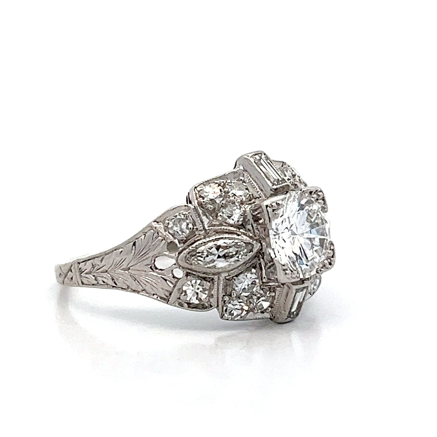 This antique Art Deco engagement ring doesn’t whisper about its past; it flaunts it. Anchored by a 1.02-carat round brilliant diamond of VVS1 clarity and F color, the stone sits confidently in a fishtail prong basket, unapologetically stealing the spotlight. Flanking it, marquise and baguette diamonds are set like architectural accents, each perfectly positioned to catch the light in a way that feels almost rebellious against the traditional. Prong-set single cut diamonds add a subtle shimmer, maintaining the G color and VS1 clarity throughout. The platinum band is a canvas of ornate engraved shoulders, milgrain edges, and intricate filigree—a rich tapestry of detail that refuses to be ignored. This ring isn’t just a nod to Art Deco; it’s a defiant statement from an era that knew exactly what it was doing.