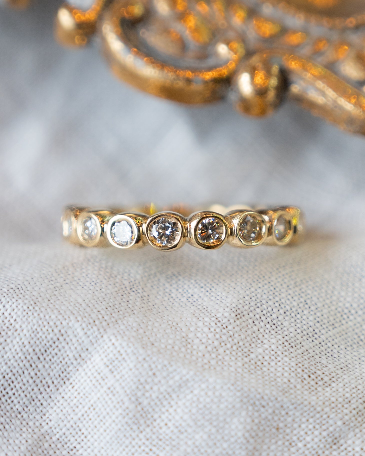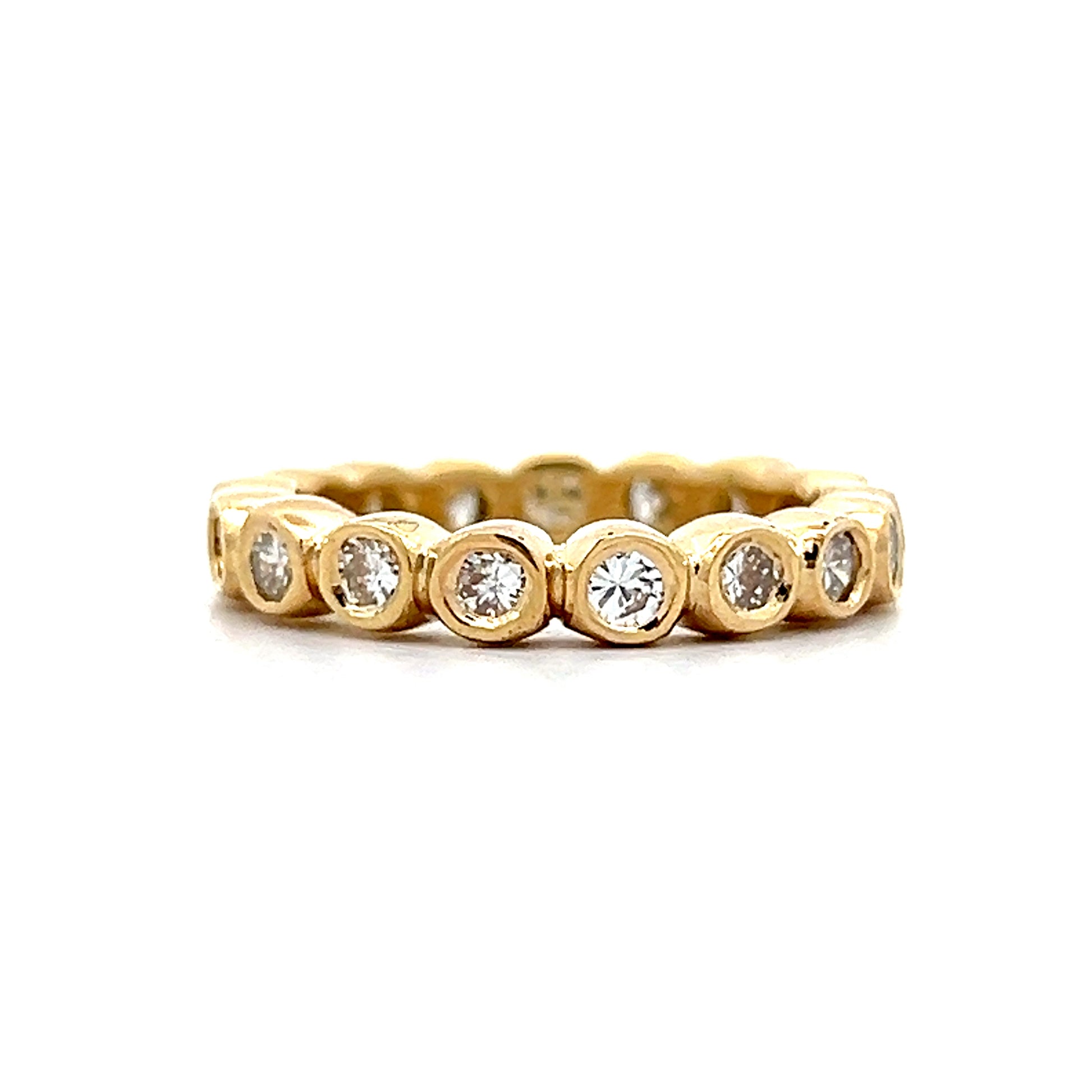 This diamond eternity band in 18 karat yellow gold features round brilliant cut diamonds totaling 1.02 carats with H color and VS2 clarity. The bezel setting creates a smooth surface while securely holding each diamond, and the band's stackable design allows it to pair with other rings. The combination of bright diamonds against rich yellow gold creates a continuous circle of sparkle that catches light from every angle.