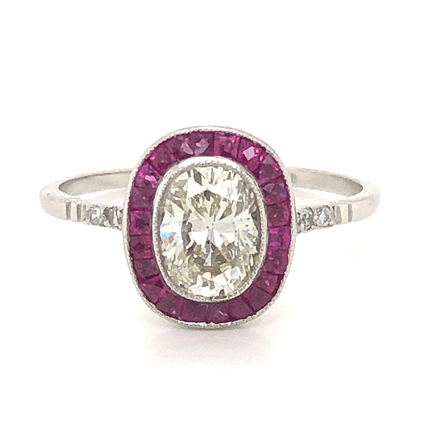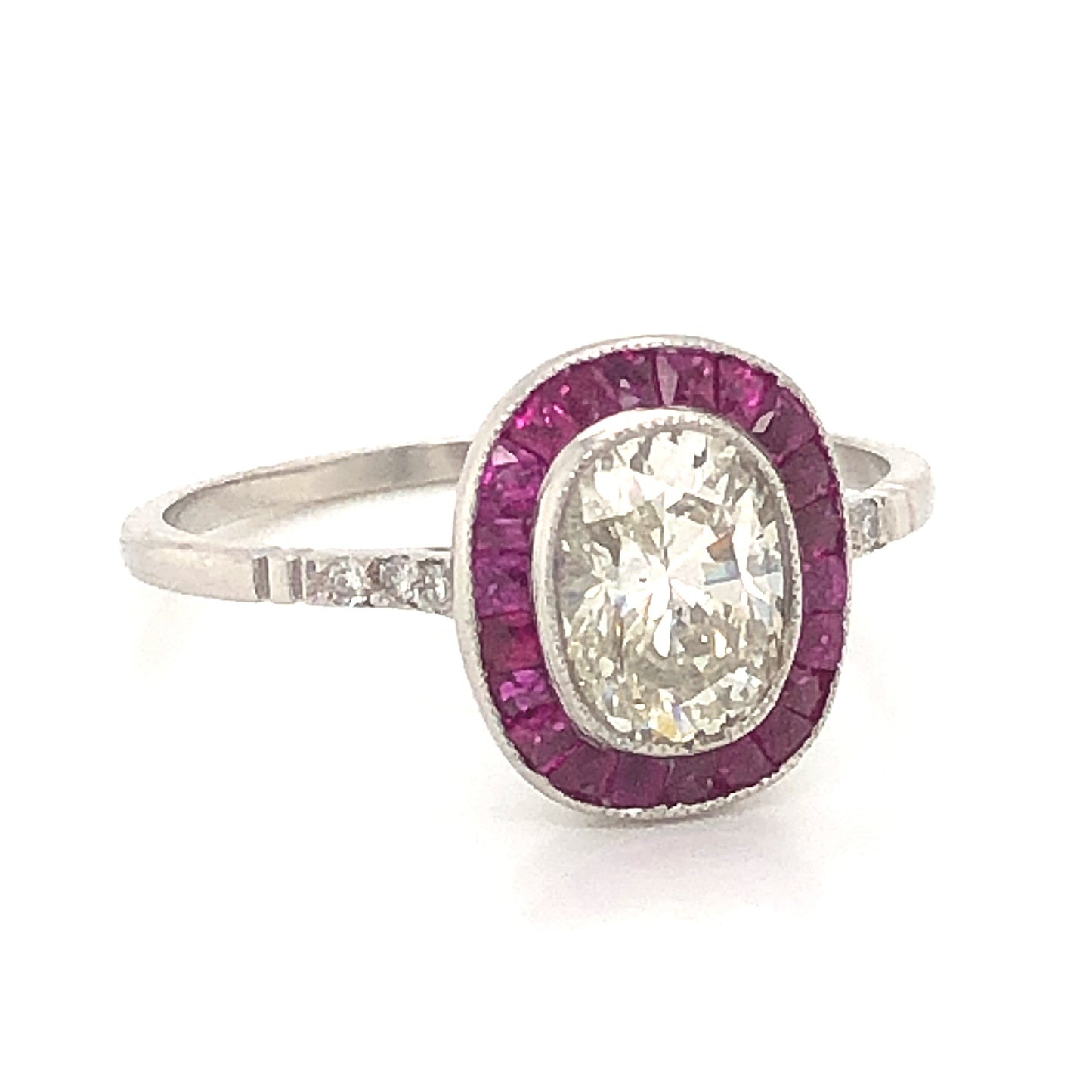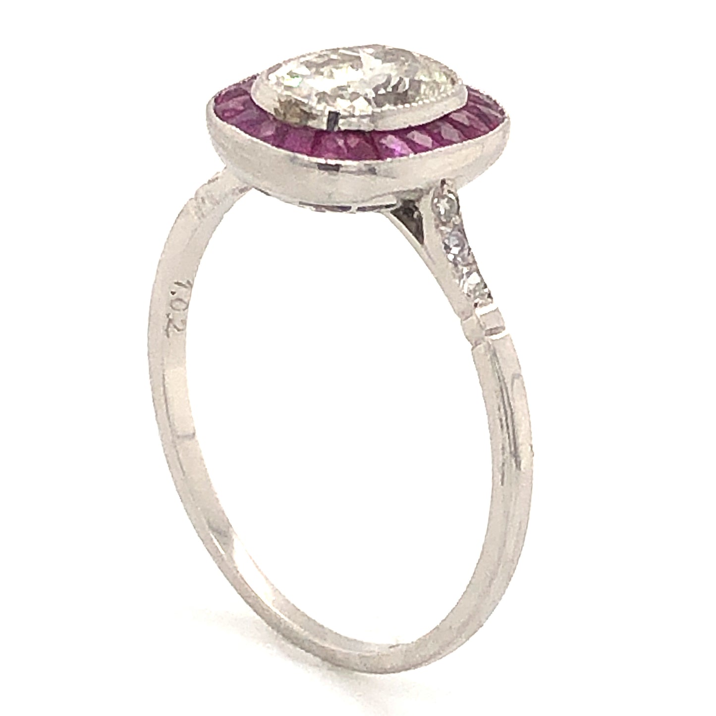 1.02 Oval Cut Diamond Ruby Engagement Ring in Platinum. This modern engagement ring features a 1.02 carat oval cut diamond and .72 carats of French cut rubies finished in platinum. The center diamond has a very light champagne hue and is set in a platinum bezel with milgrain details. A wreath of twenty-two (22) .0327 carat accent rubies with a rich, magenta hue accent the center stone. Six (6) .01 carat Round Brilliant cut diamonds decorate the shoulders of the band. From the profile, a sleek bezel mounting supports the gemstones on a thin, platinum band.