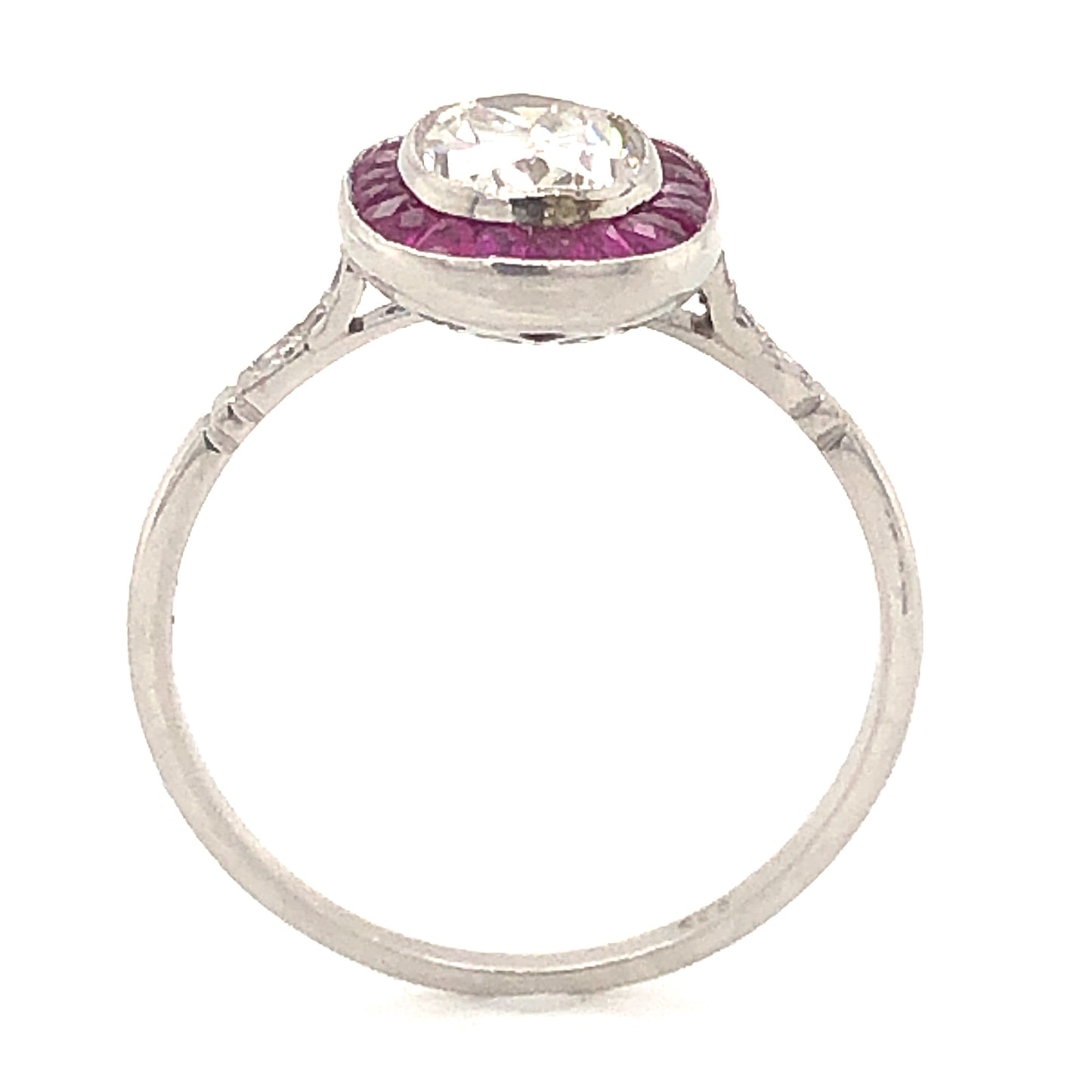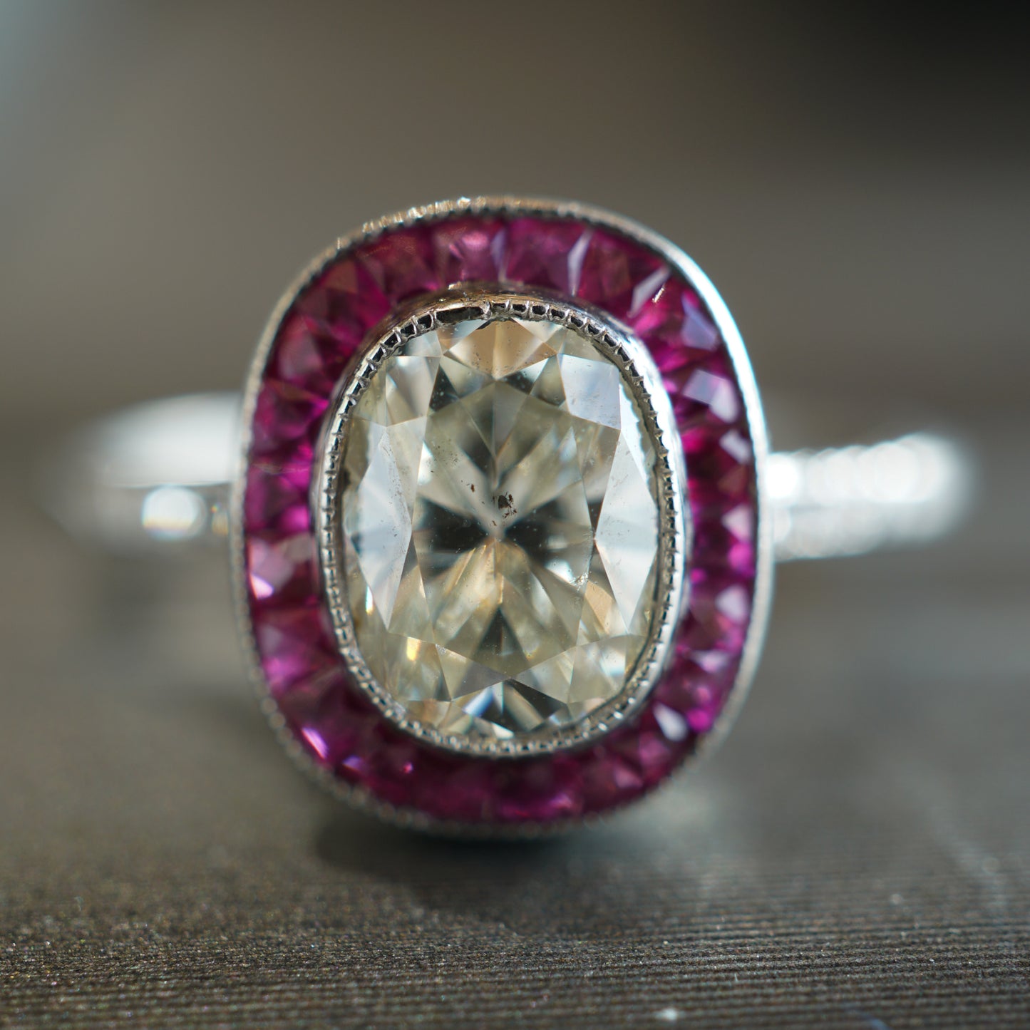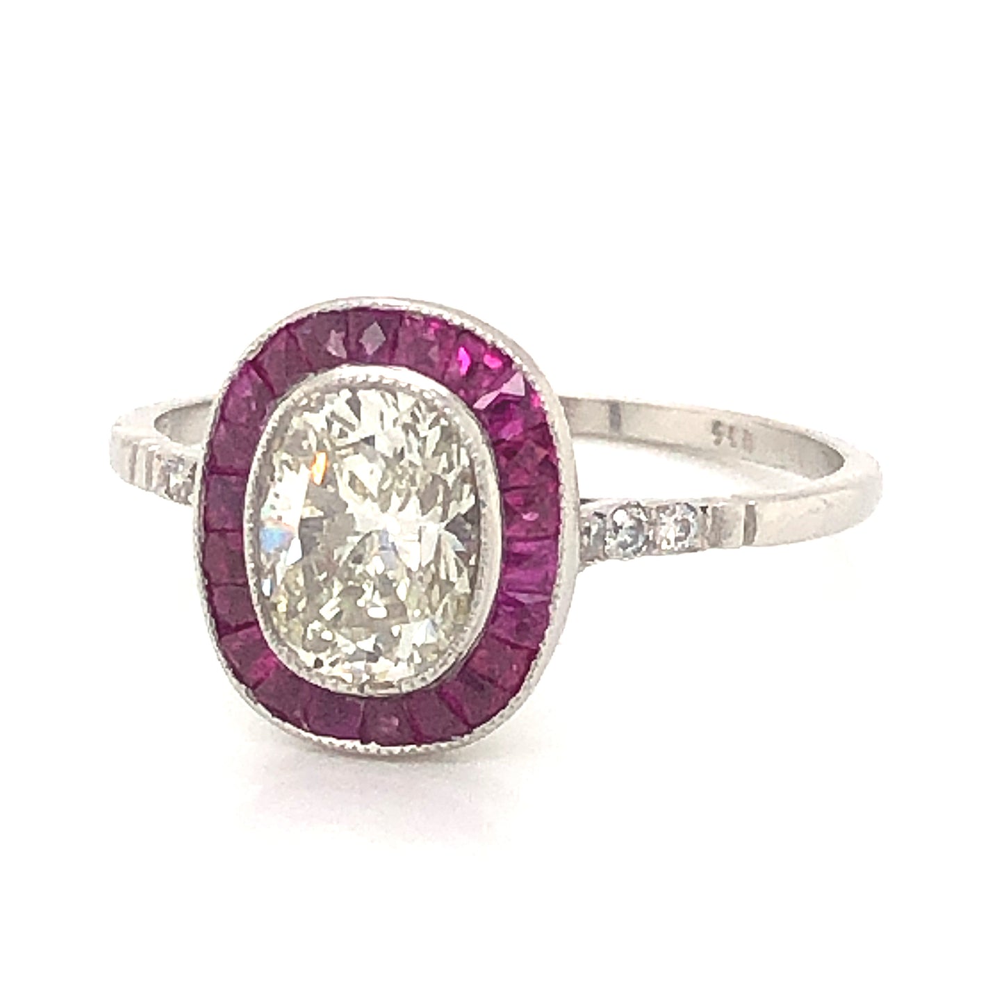 1.02 Oval Cut Diamond Ruby Engagement Ring in Platinum. This modern engagement ring features a 1.02 carat oval cut diamond and .72 carats of French cut rubies finished in platinum. The center diamond has a very light champagne hue and is set in a platinum bezel with milgrain details. A wreath of twenty-two (22) .0327 carat accent rubies with a rich, magenta hue accent the center stone. Six (6) .01 carat Round Brilliant cut diamonds decorate the shoulders of the band. From the profile, a sleek bezel mounting supports the gemstones on a thin, platinum band.