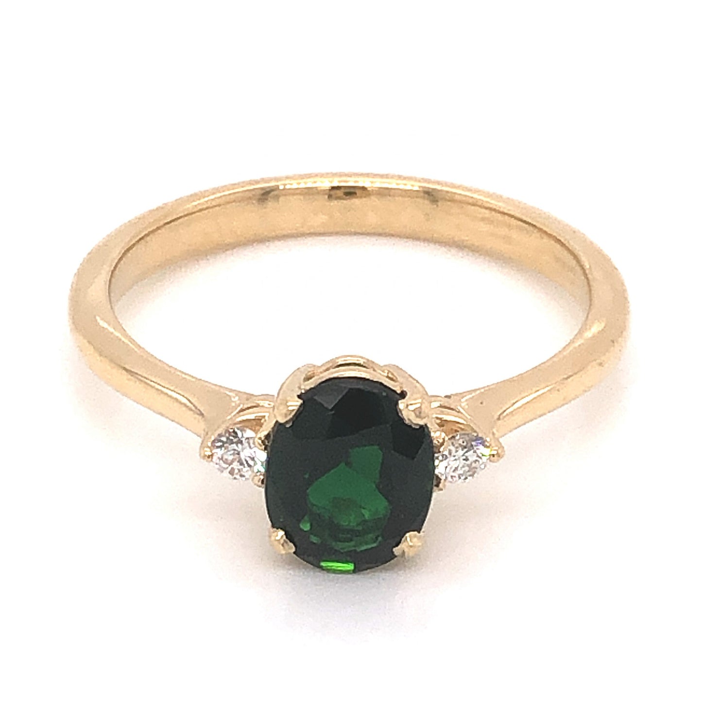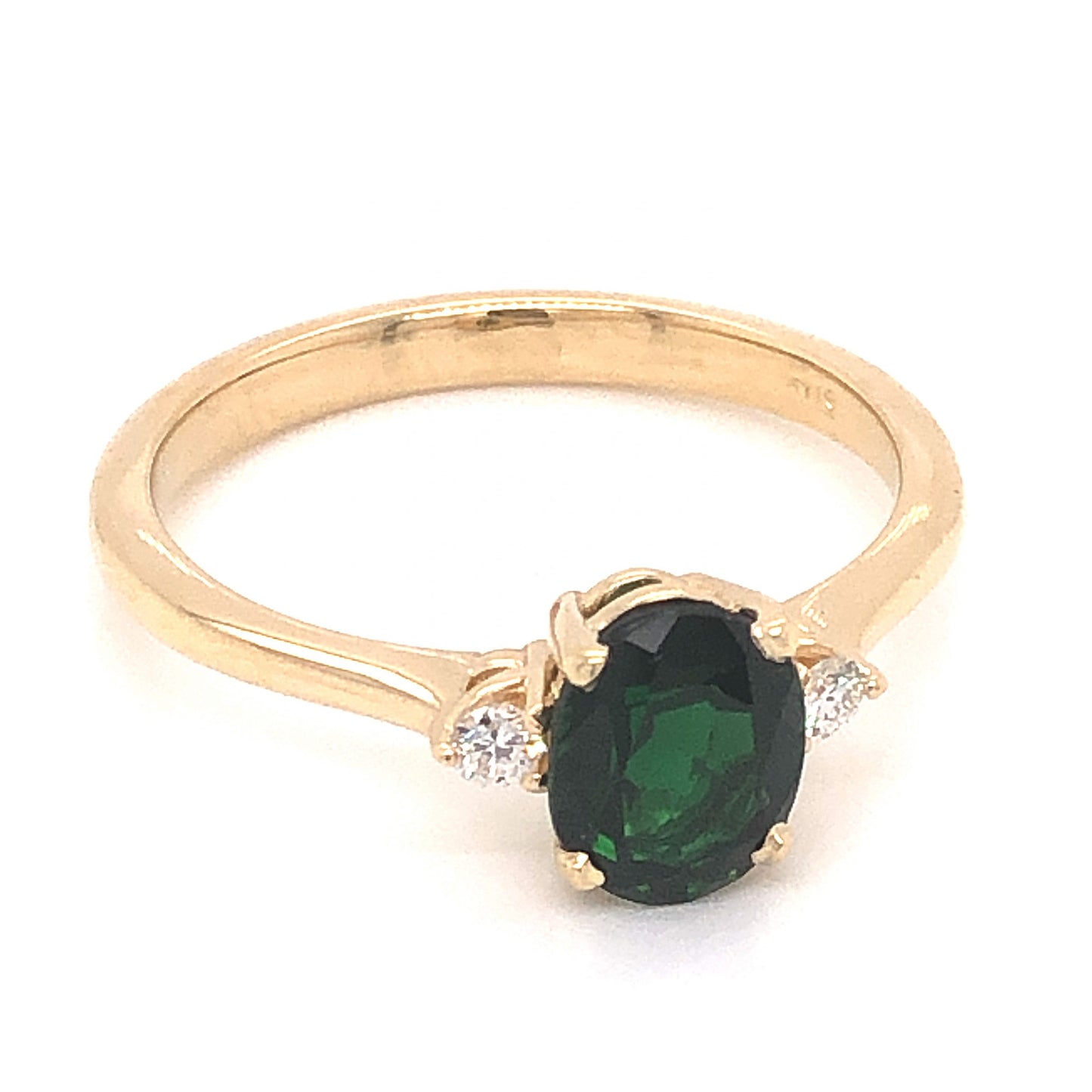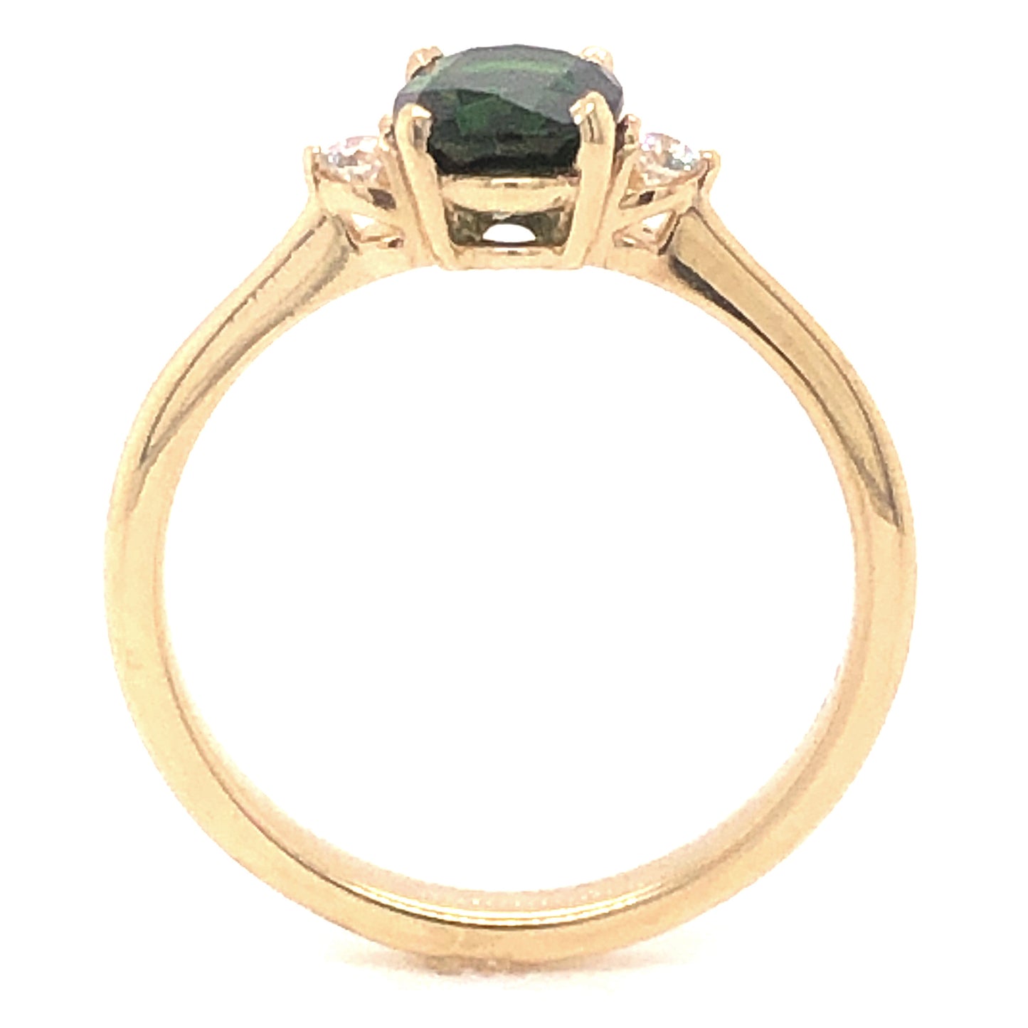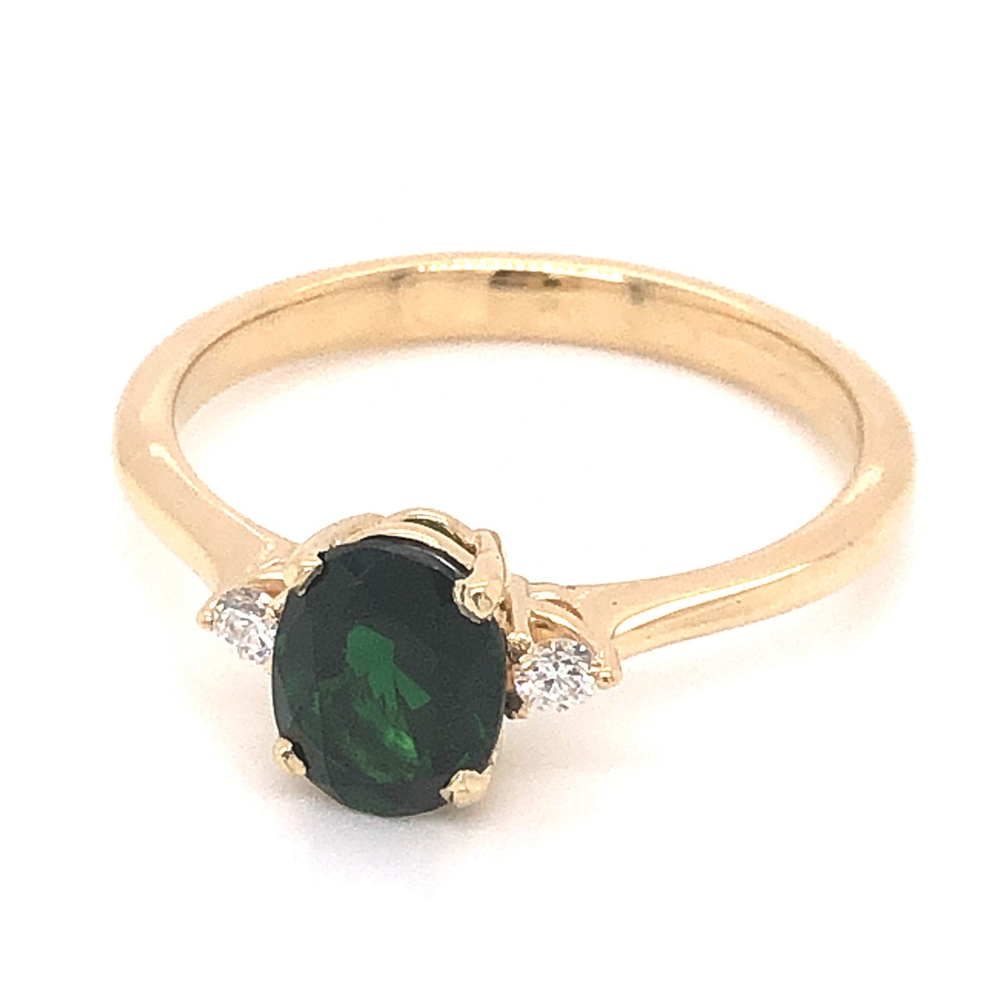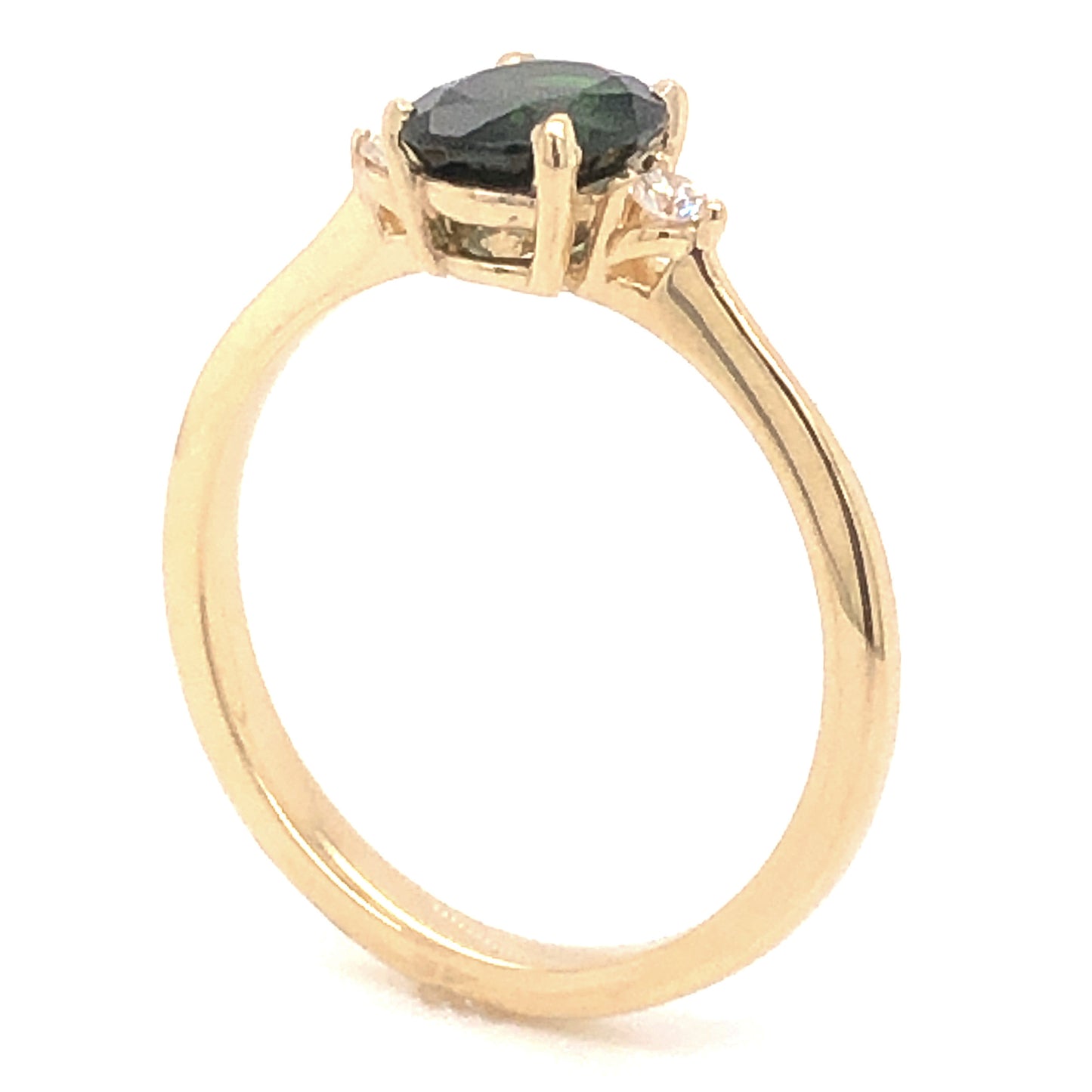 1.02 Oval Cut Tourmaline Diamond Ring in 14k Yellow Gold. This modern engagement ring features a 1.02 carat green tourmaline and .08 carats of accent diamonds finished in 14 karat yellow gold. The center tourmaline has a dark forest green hue and is set in four prongs. The oval cut facets of the tourmaline complement the large size of the gem. Two (2) .04 carat Round Brilliant cut diamonds flank the center stone, adding a sparkle to the deep color of the tourmaline. From the profile, the stones rest in basket mountings finished on a high polished 14k yellow gold band.