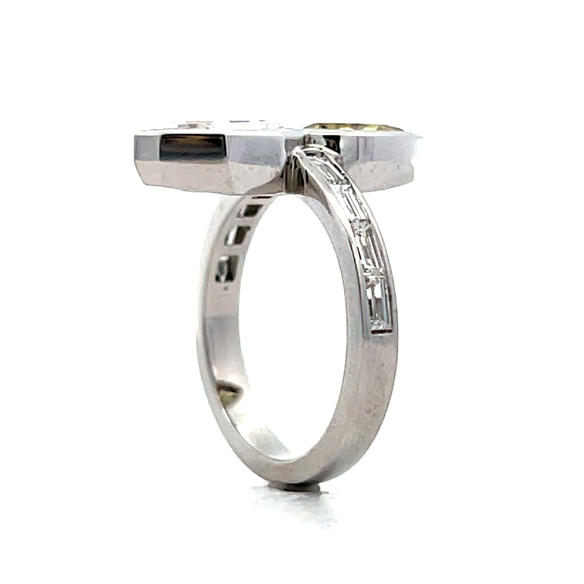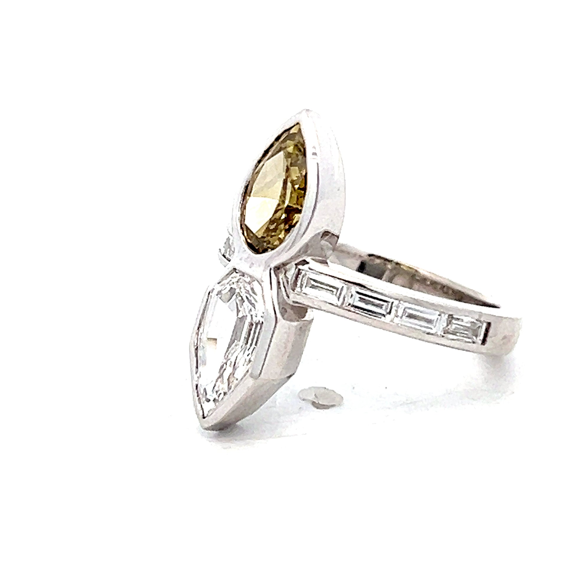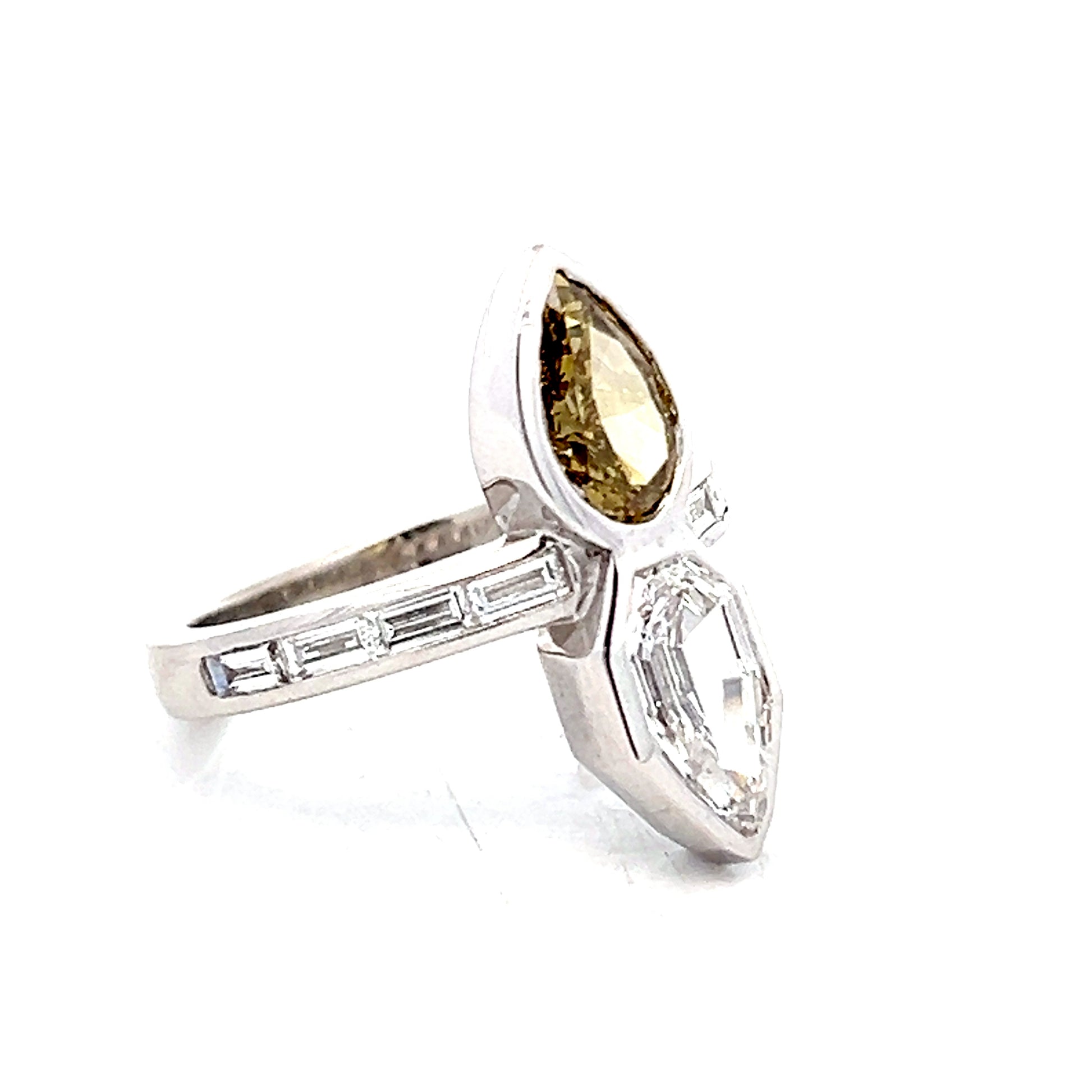 This two-stone engagement ring features a 1.03 carat pear step cut white diamond paired with a 1.01 carat pear cut fancy brown diamond. Both diamonds are bezel set in a platinum band that includes channel-set baguette diamonds, bringing the total carat weight to 2.54. The "Toi Et Moi" design places the contrasting white and brown pear-shaped diamonds at opposite ends of the ring.