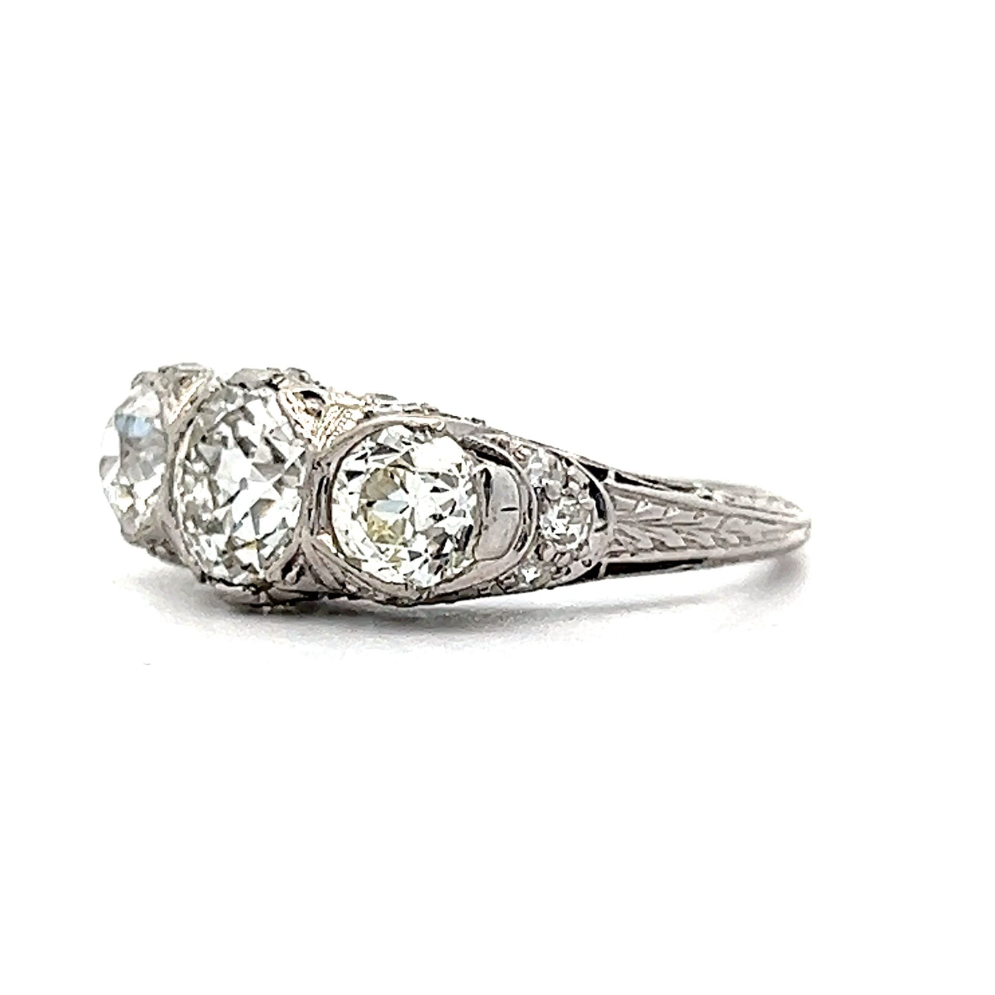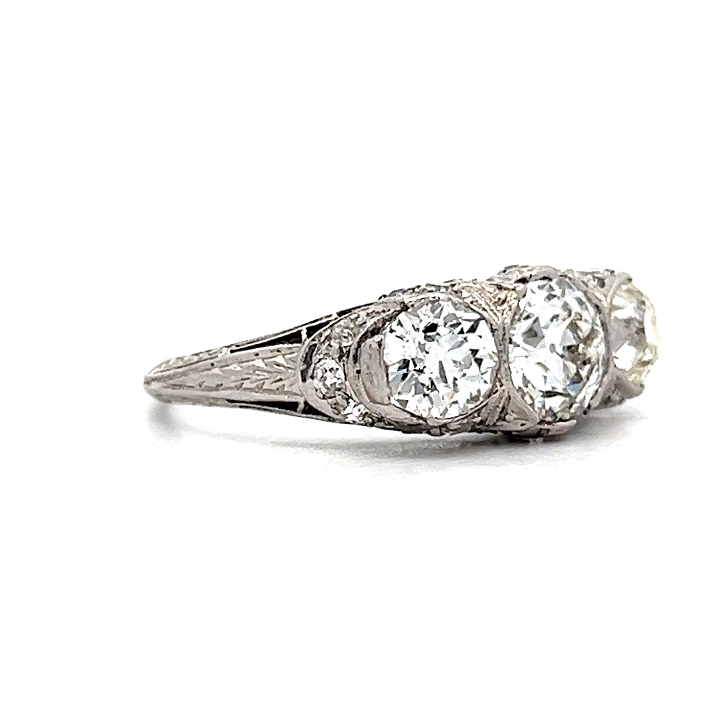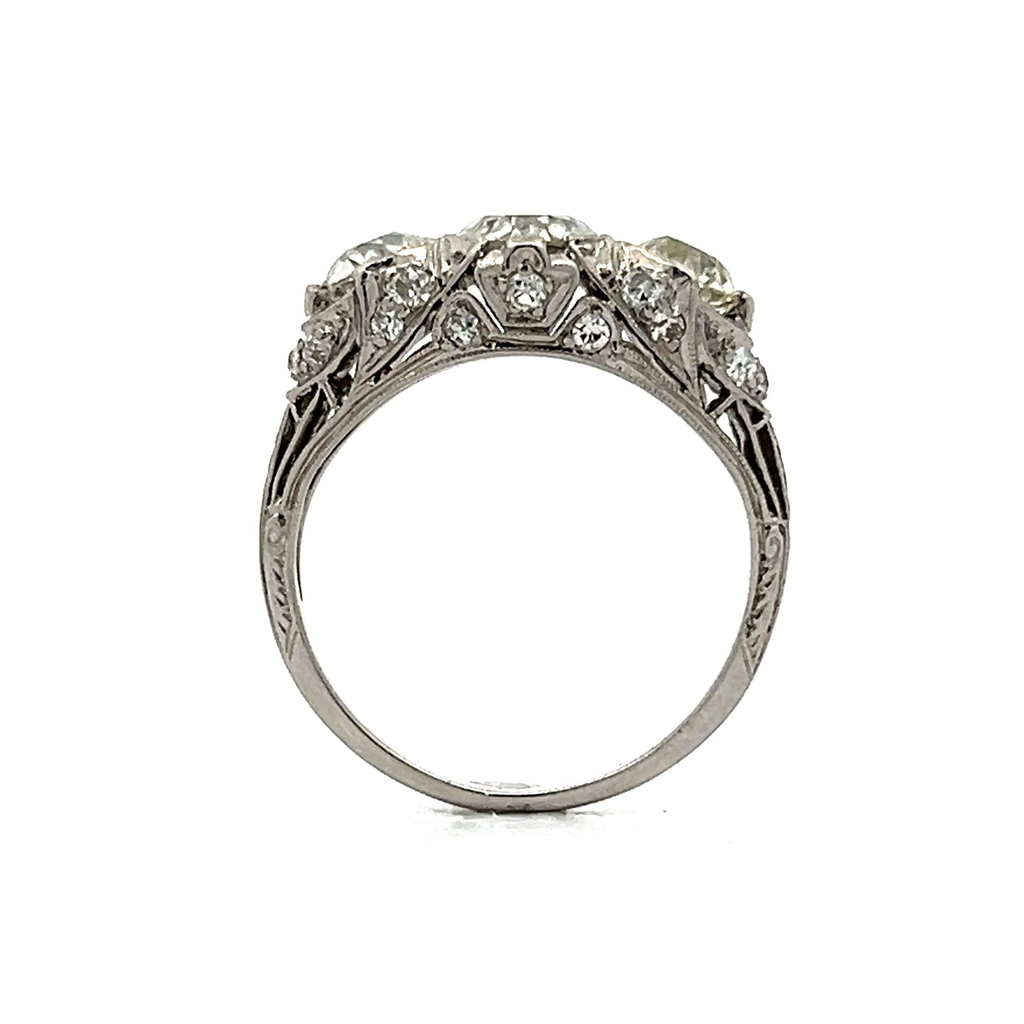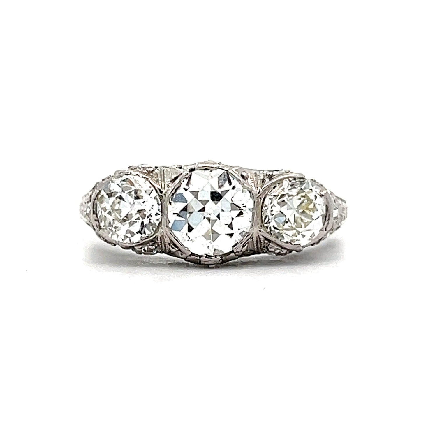 Crafted in polished platinum, this antique ring features a trio of natural old European cut diamonds, each with a weight of 1.03 carats and a clarity of SI1. The center diamond is an I color, while the two accent diamonds are a K color and SI1 clarity. The accent stones of this ring are also natural diamonds, with a combined weight of .46 and .41 carats respectively. This gorgeous Art Deco ring has an incredible presence and would look amazing with a stack of bands.