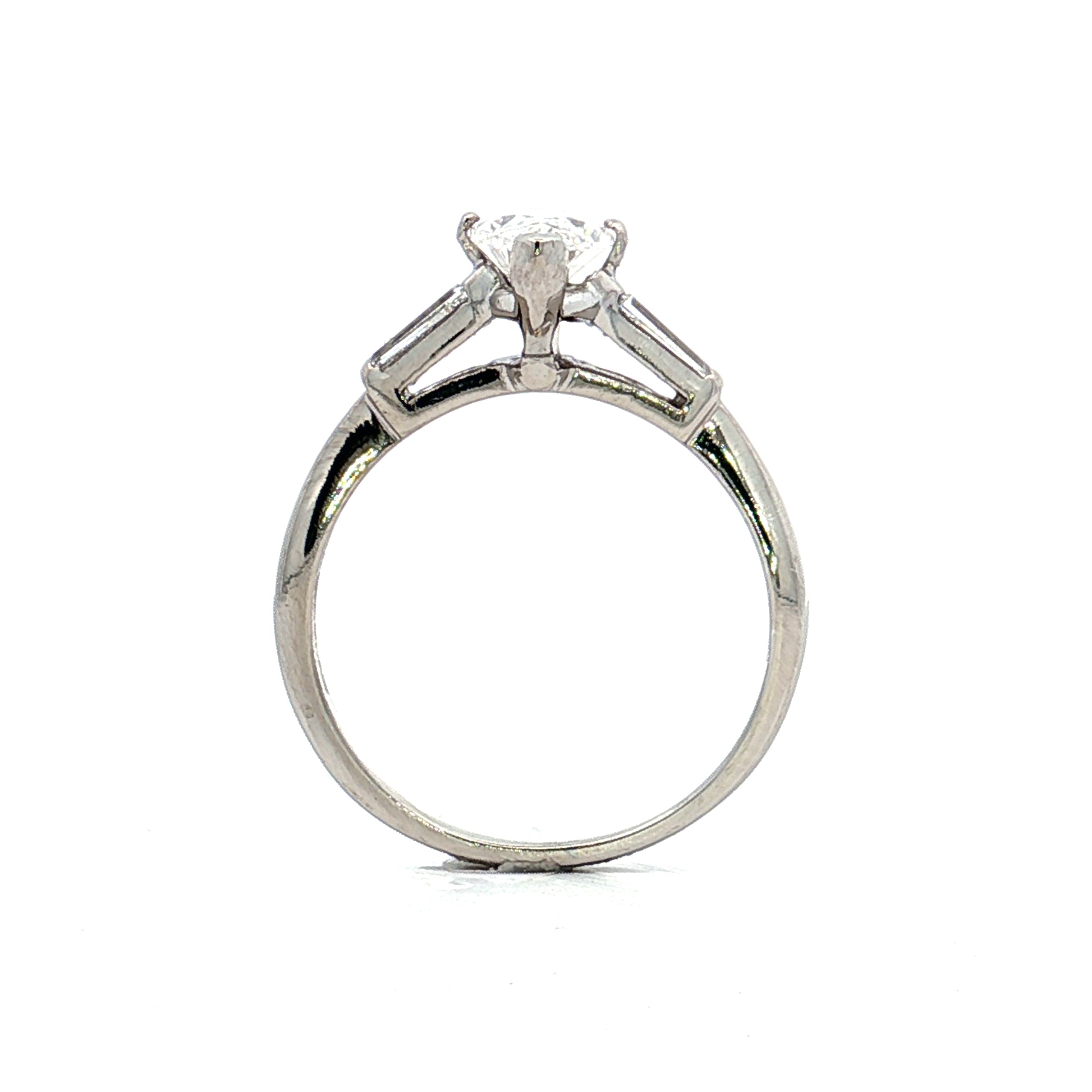 This vintage Mid-Century engagement ring is made from platinum and centers on a 1.03 carat GIA-certified marquise cut diamond with VS1 clarity and F color. Two tapered baguette diamonds measuring 4.50 x 2.00 x 1.75mm and weighing .13 carats each flank the center stone, creating a total diamond weight of 1.29 carats. All diamonds are prong set in the platinum mounting.