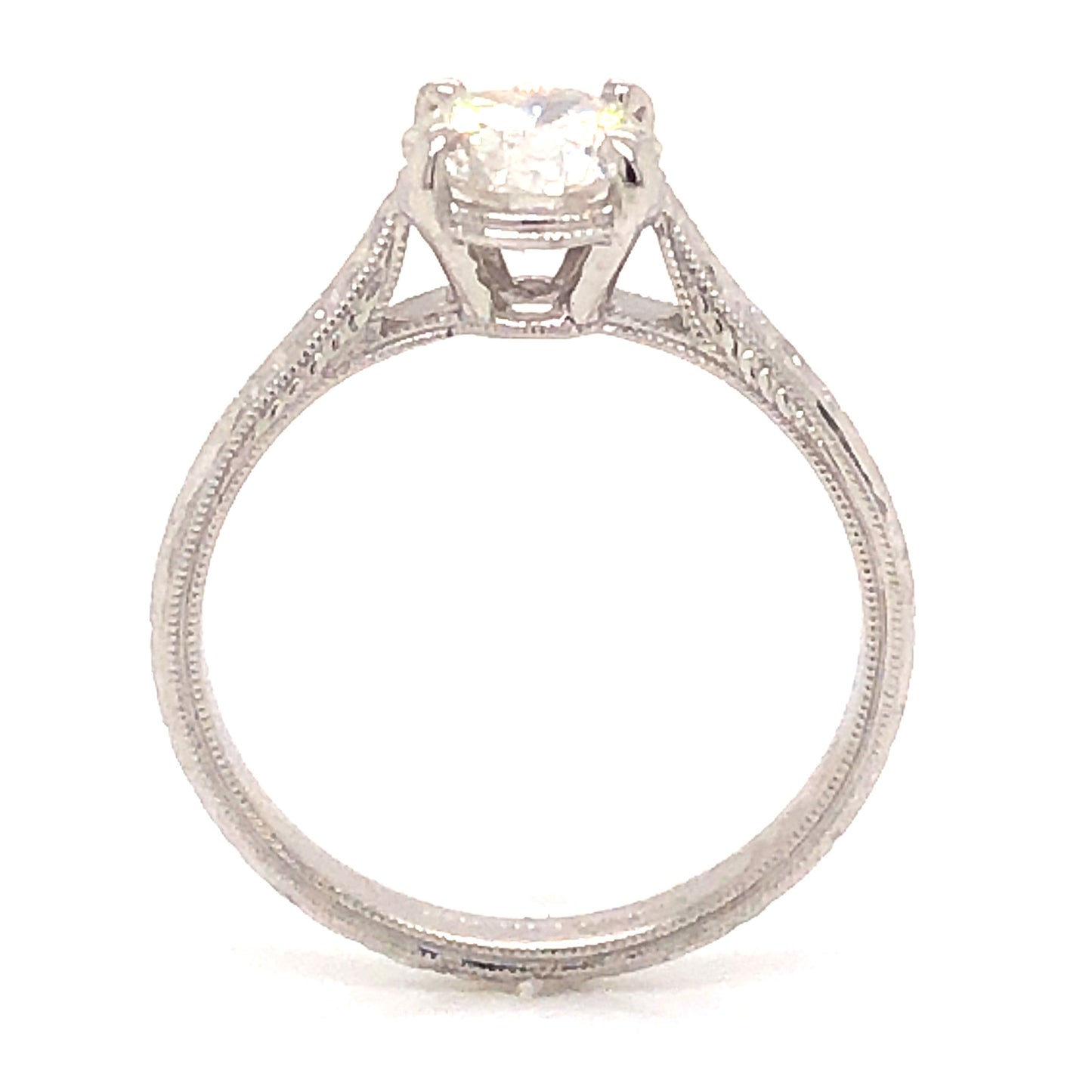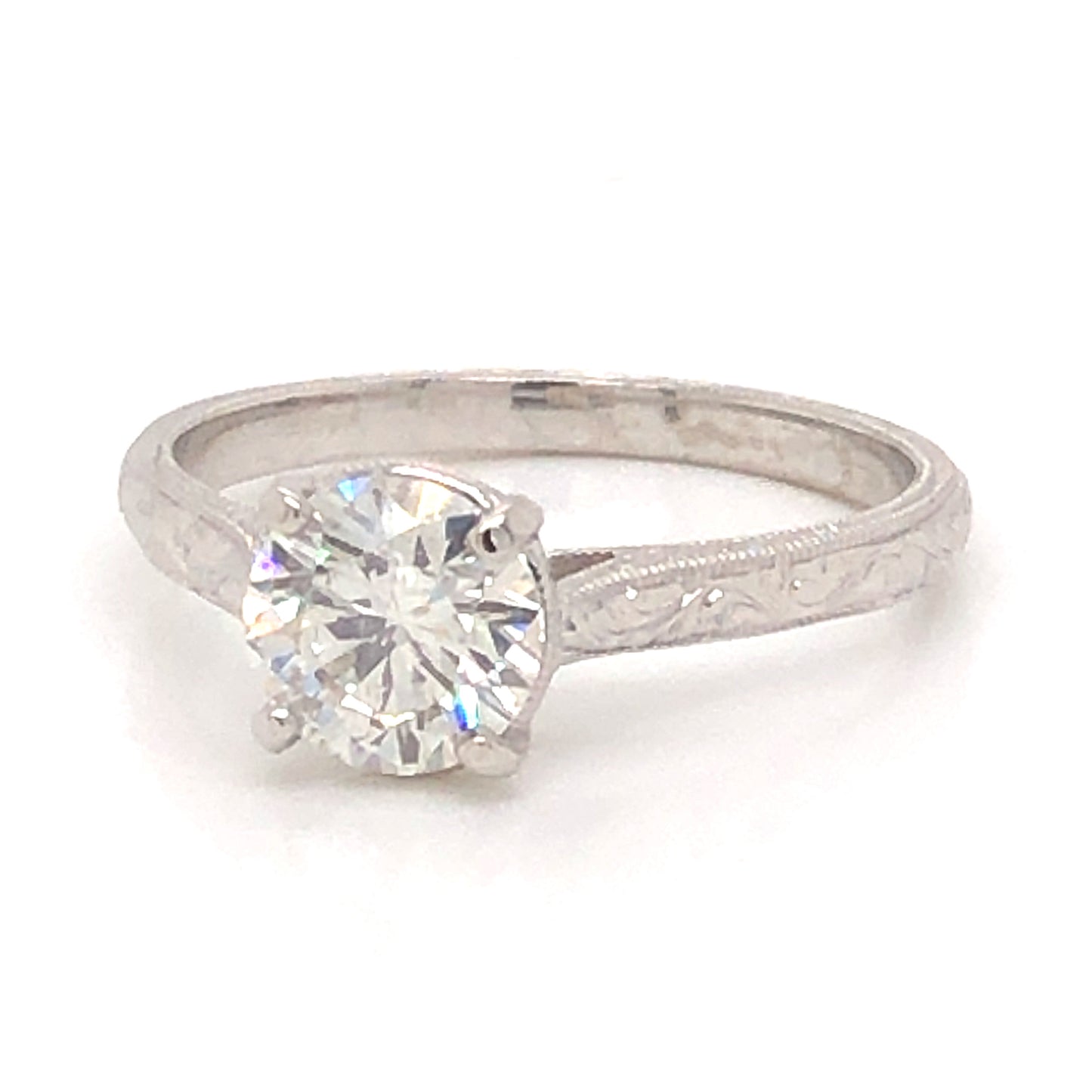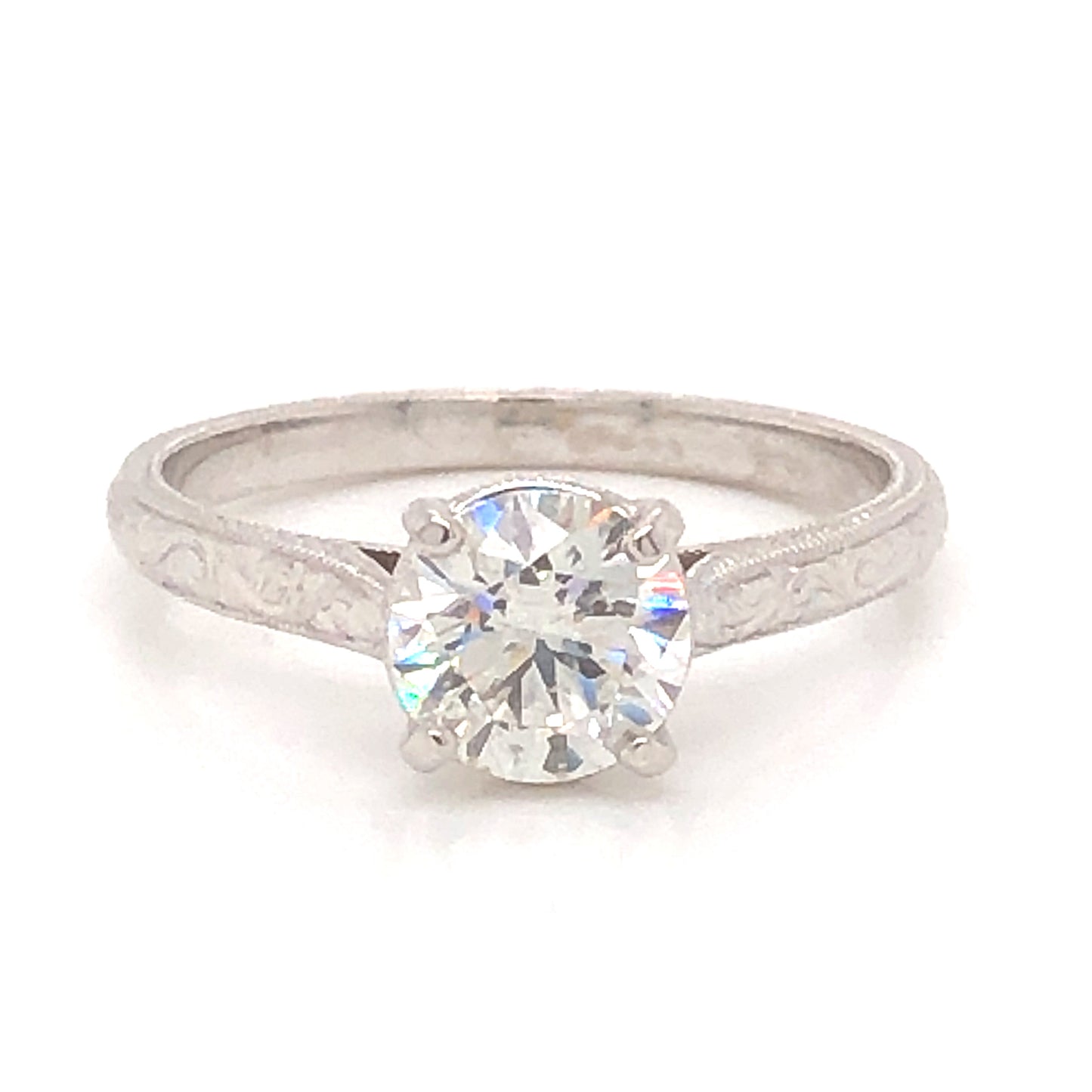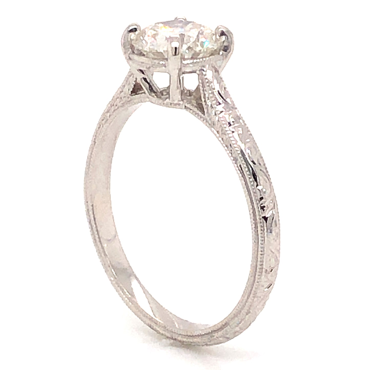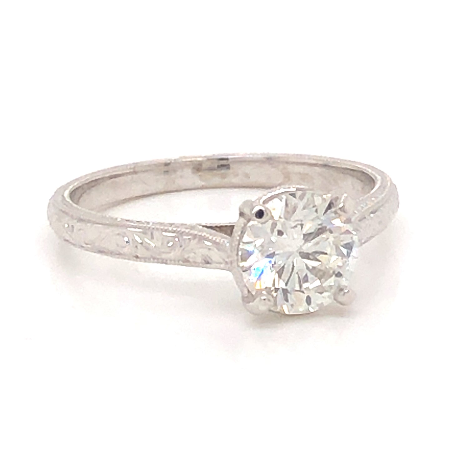 1.04 Art Deco Diamond Engagement Ring in 18K White Gold. This elegant Art Deco engagement ring features a GIA-certified 1.04 carat Round Brilliant cut diamond finished in 18k white gold. The center diamond is prong set and nearly colorless, with facets that bring an attractive sparkle and fire when touched with light. From the profile, a vintage cathedral mounting holds the center stone. The shoulders of the band have delicate Art Deco engravings, finished in polished 18 karat white gold.