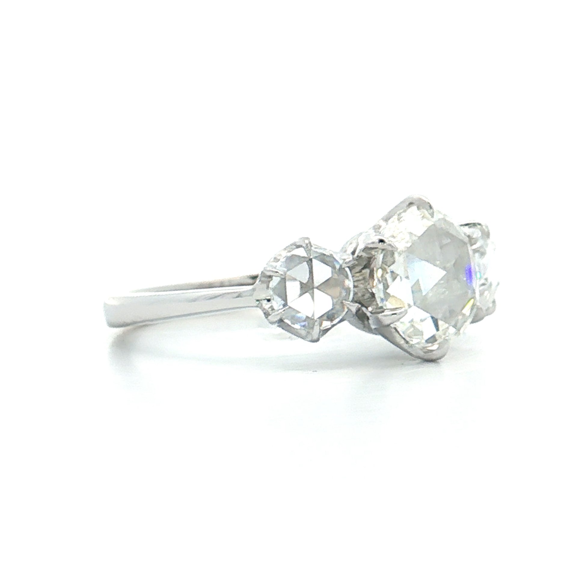 All three diamonds share this same antique cutting style, producing a cohesive look with gentle light play across the ring. The total diamond weight is 1.74 carats, and this ring comes with GIA certification.