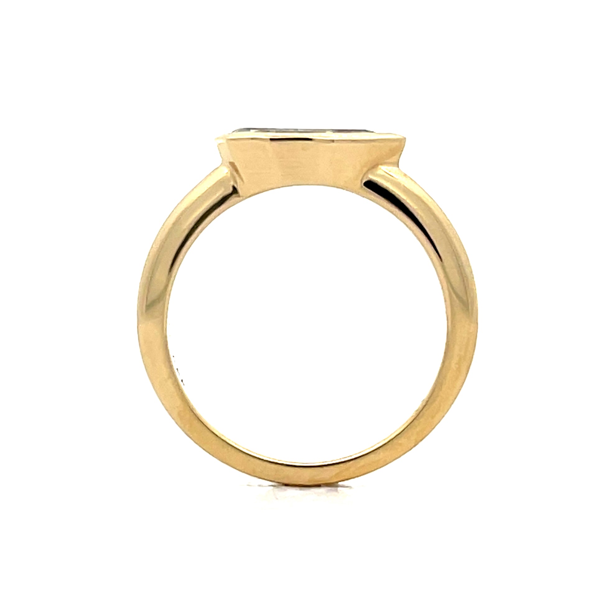 This 14 karat yellow gold solitaire engagement ring features a 1.04 carat step pear cut diamond with VS1 clarity set in a bezel mounting with an east/west orientation. The handcrafted setting gives this piece distinctive character while the 2.2mm band provides comfortability. The bezel setting securely holds the pear-shaped diamond while creating clean, modern lines that highlight the stone's unique step cut faceting.